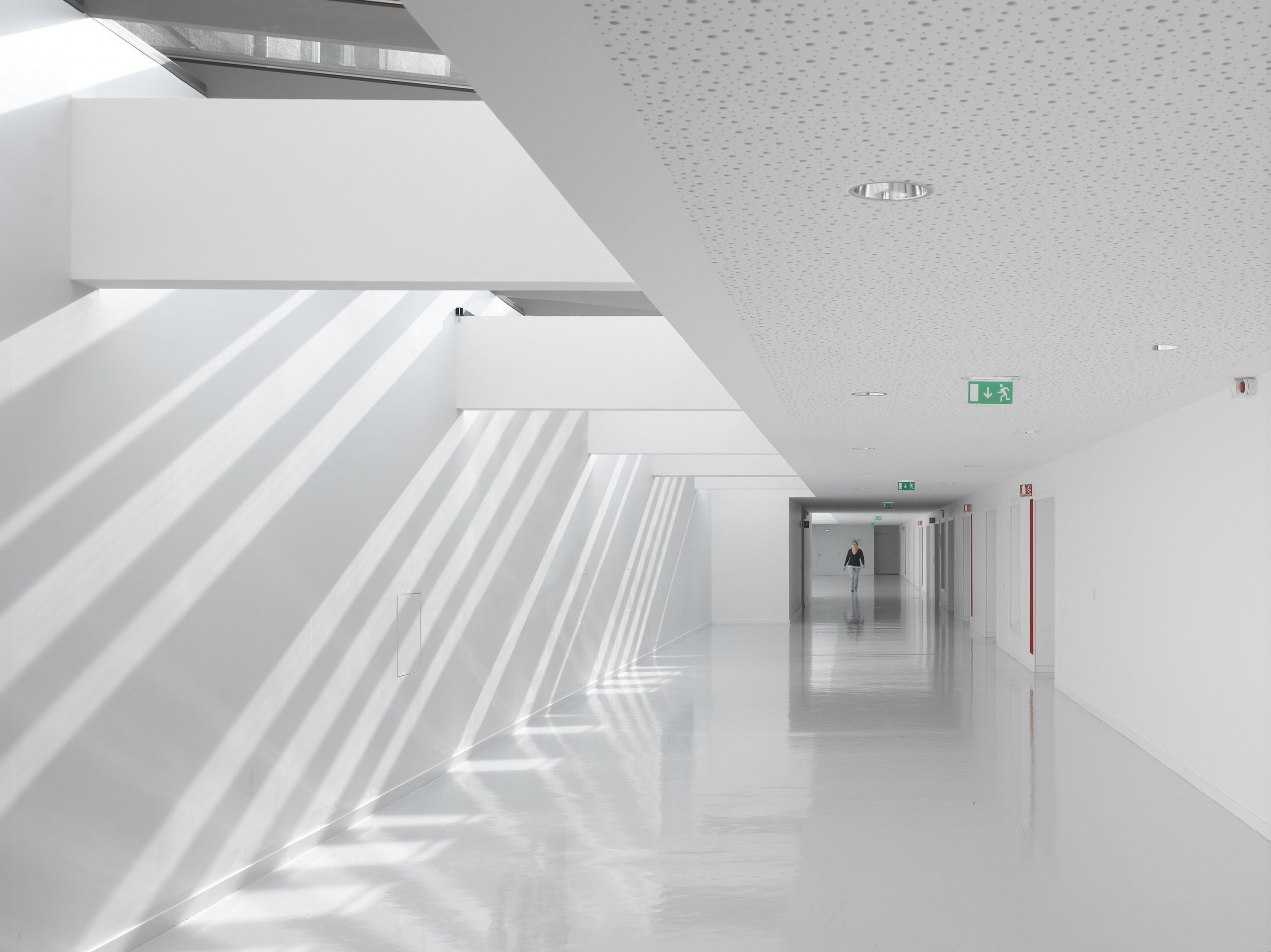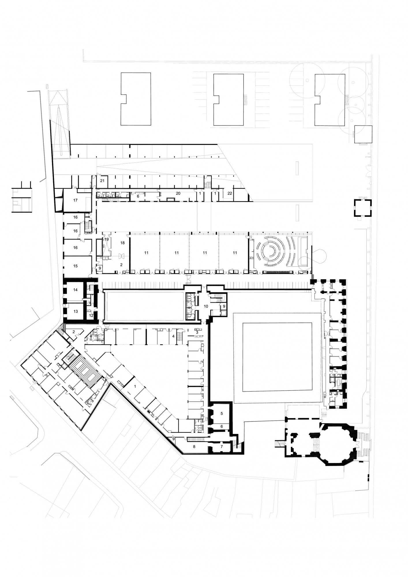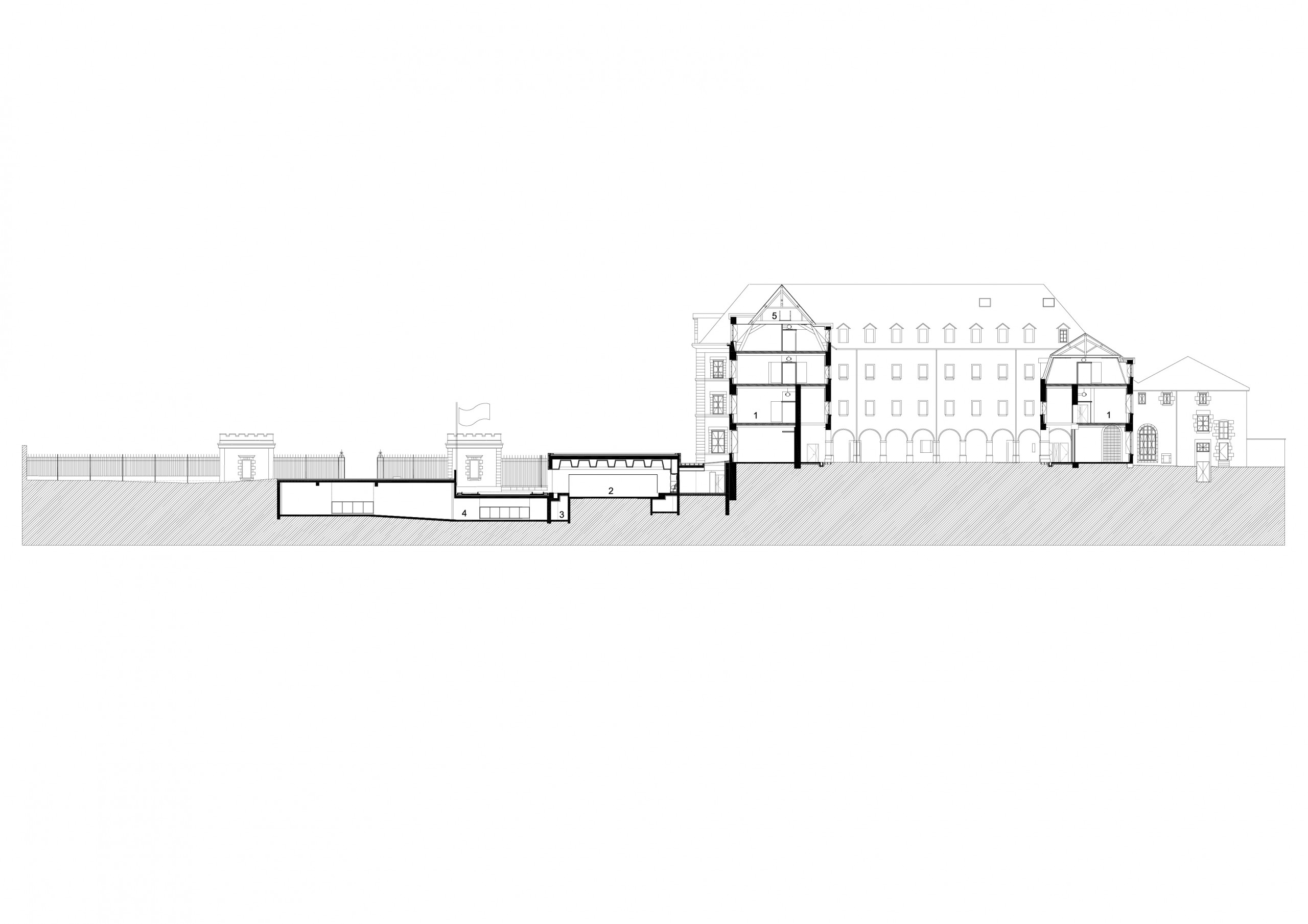 The approach selected aims to double the built area, from 8.000 m² to 16.000 m², without altering the look of the original facades. To achieve this, the extension forms a two-storey base excavated under the old barracks square. Reproducing the layout of the cloister, the underground facilities are organised around three basement gardens, providing natural light. In the axis of the historic entrance, the new forecourt spans the new void, forming a threshold that highlights the building and its role as a public facility.