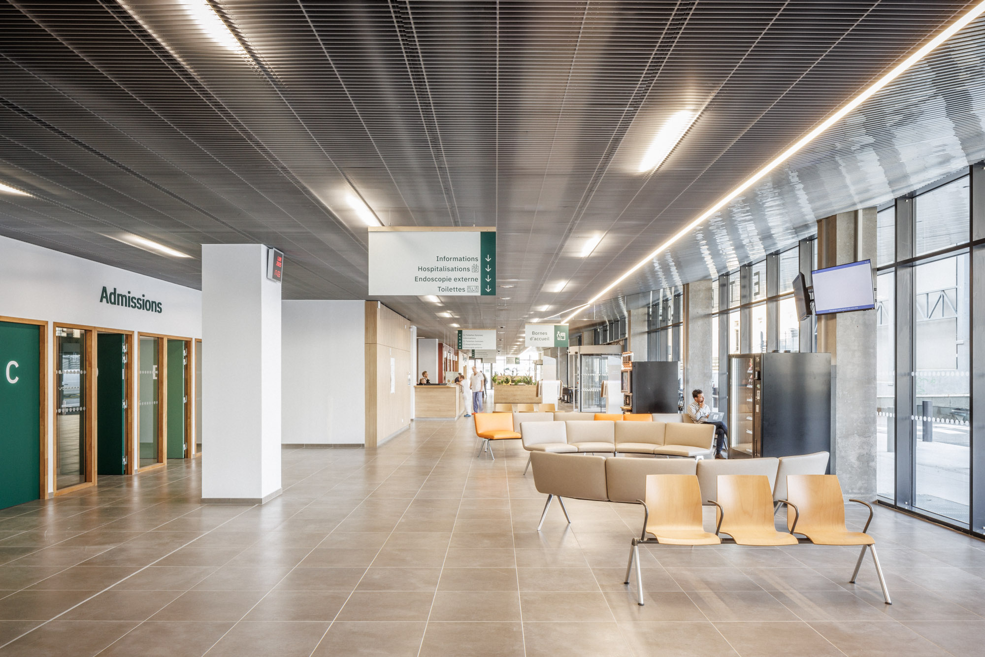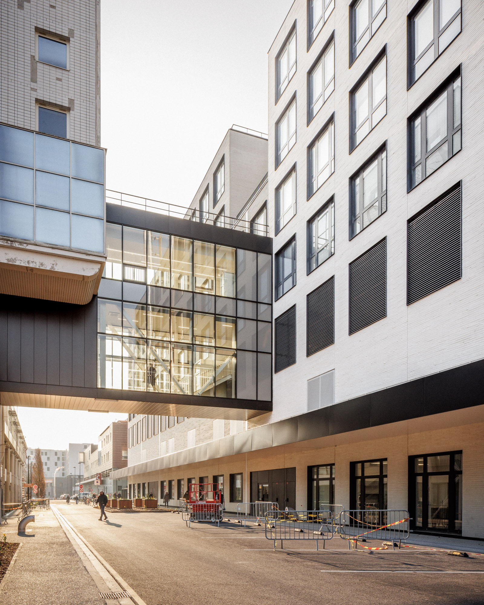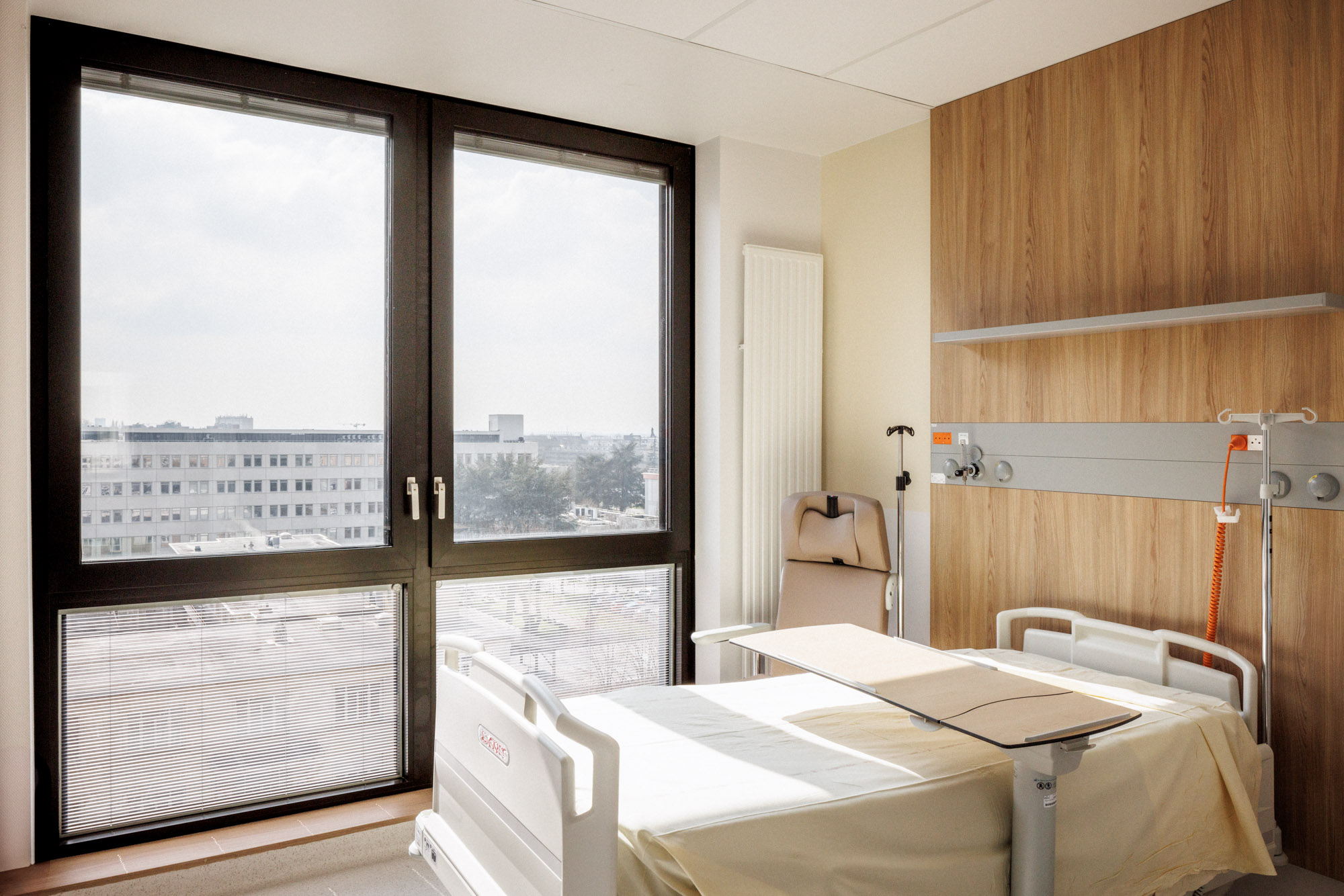 Le bâtiment s’implante de façon à tirer le meilleur de l’emprise disponible. L’îlot est « extrudé » pour définir un volume capable, une « plaque » qui sera ensuite « creusée » de patios et de « brèches » pour amener la lumière en son coeur. Cette forme homogène est pensée pour ne pas subir l’avenir : tel un gratte-ciel « couché », elle anticipe l’évolution constante des pratiques hospitalières en n’assujettissant pas l’apparence du bâtiment aux fonctions qu’il abrite, susceptibles de changer rapidement.