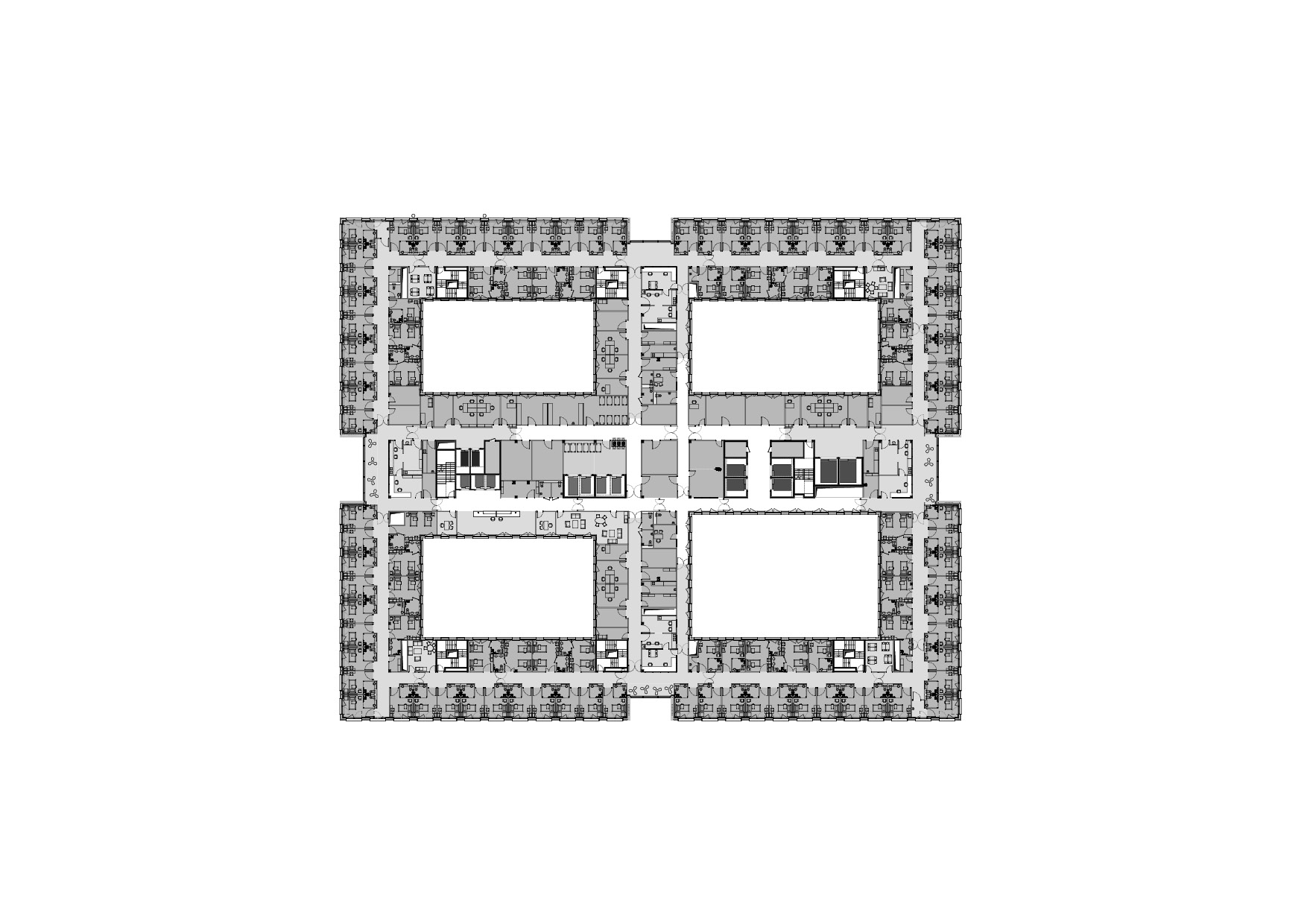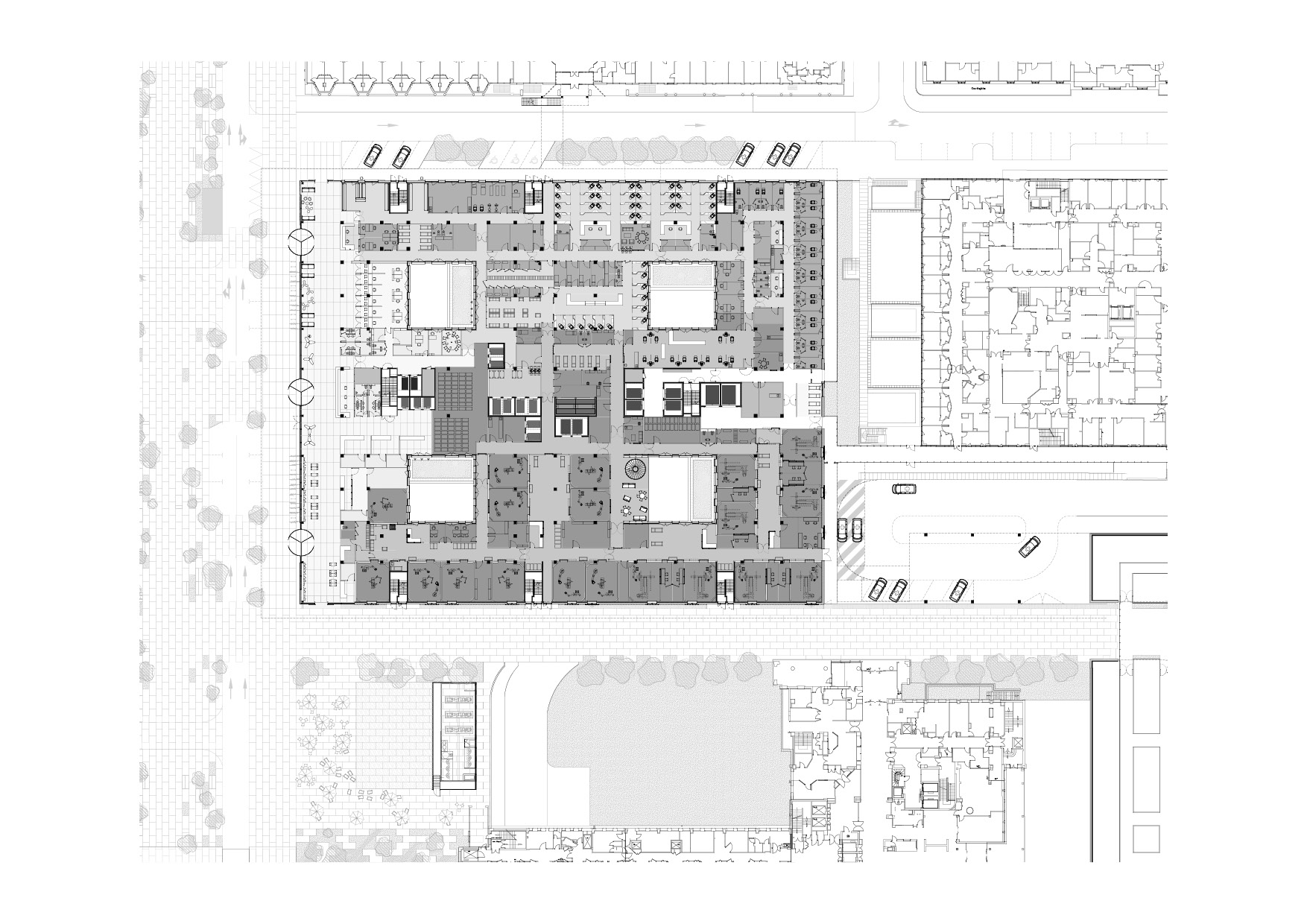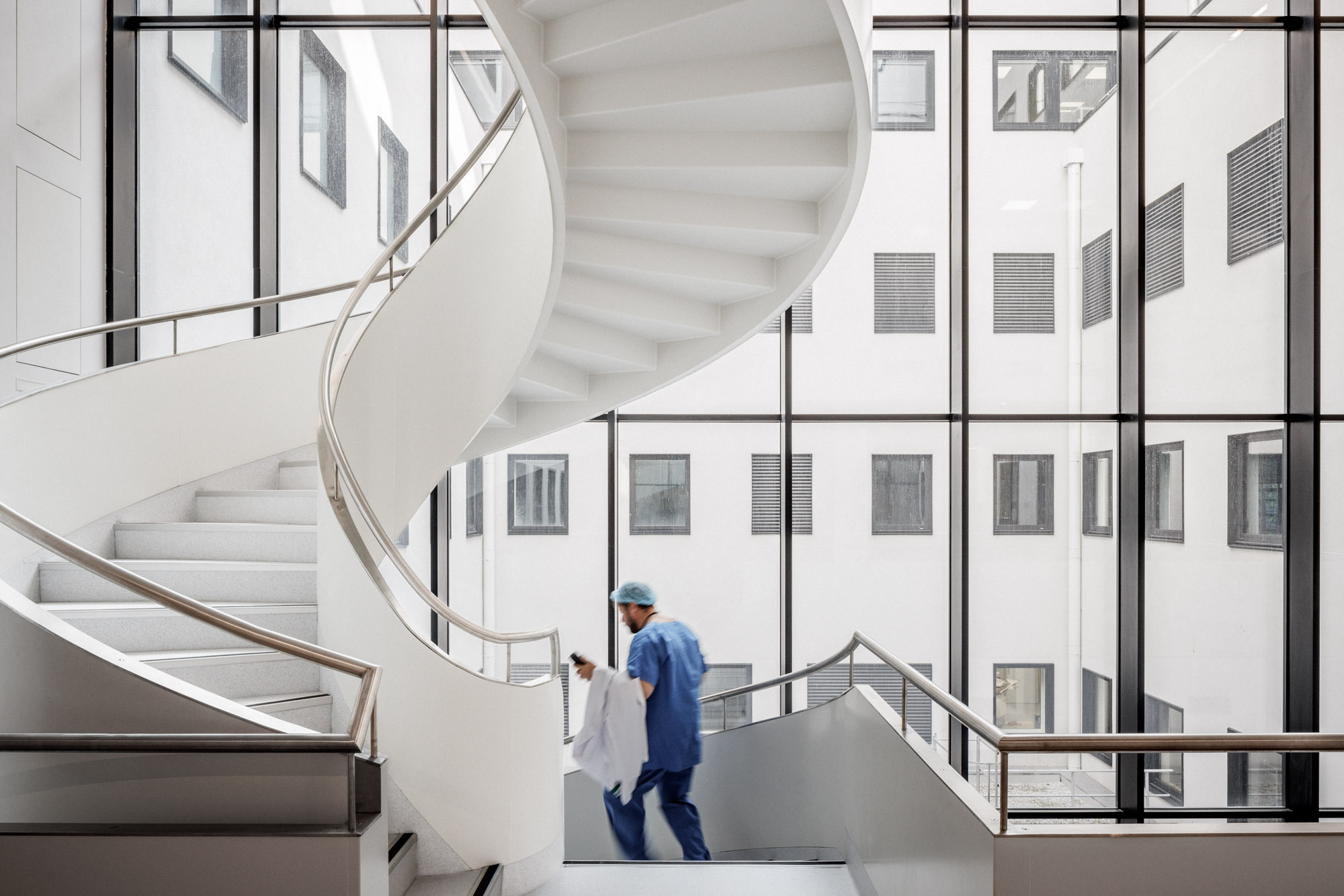 Le bâtiment s’implante de façon à tirer le meilleur de l’emprise disponible. L’îlot est « extrudé » pour définir un volume capable, une « plaque » qui sera ensuite « creusée » de patios et de « brèches » pour amener la lumière en son coeur. Cette forme homogène est pensée pour ne pas subir l’avenir : tel un gratte-ciel « couché », elle anticipe l’évolution constante des pratiques hospitalières en n’assujettissant pas l’apparence du bâtiment aux fonctions qu’il abrite, susceptibles de changer rapidement.