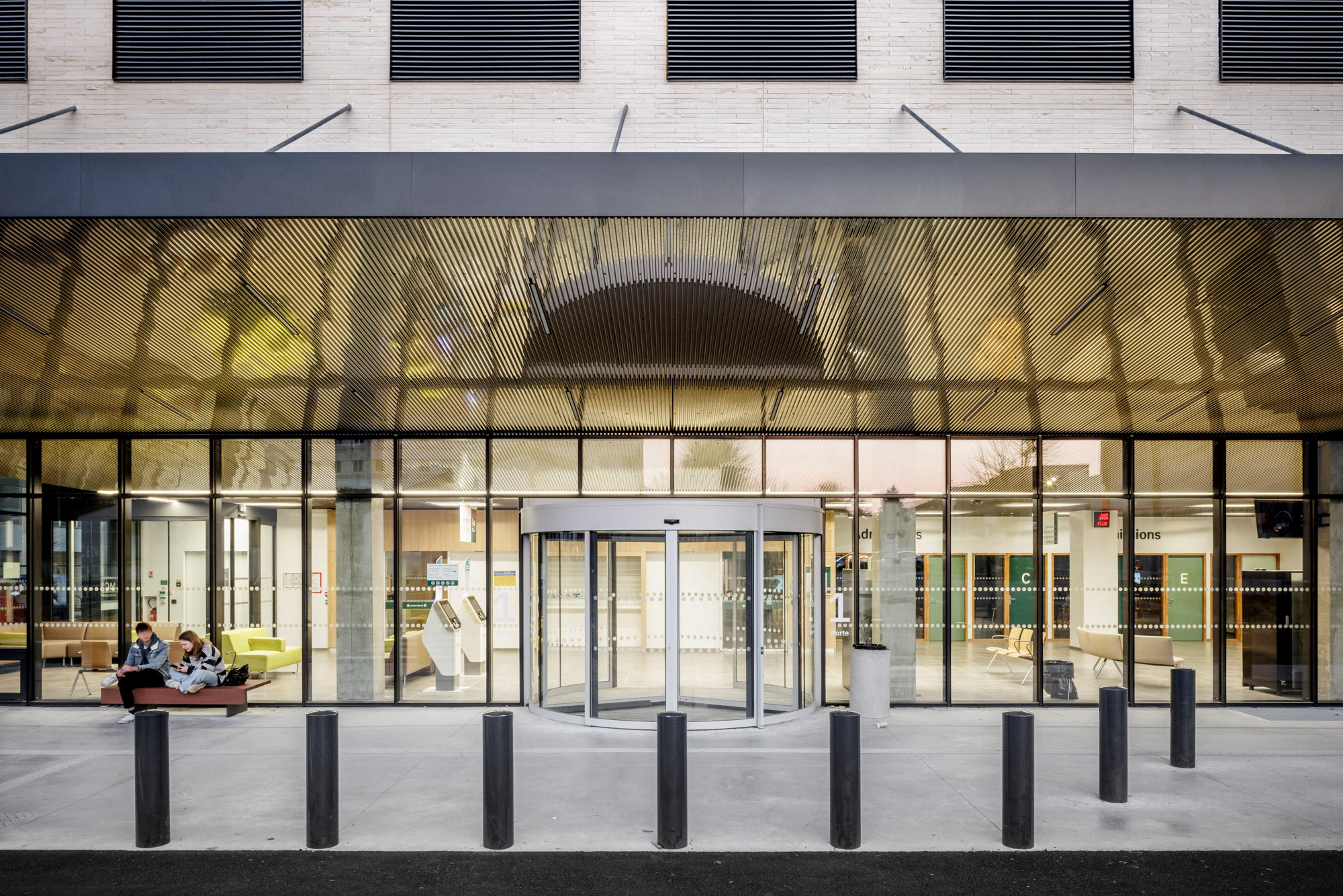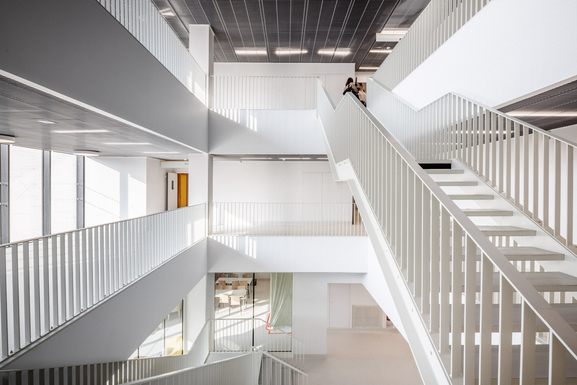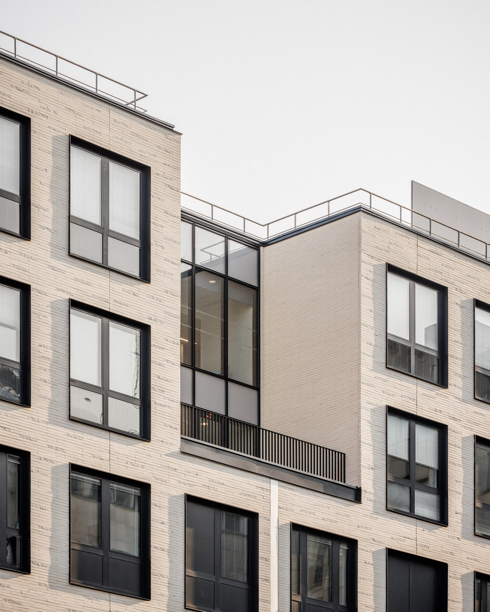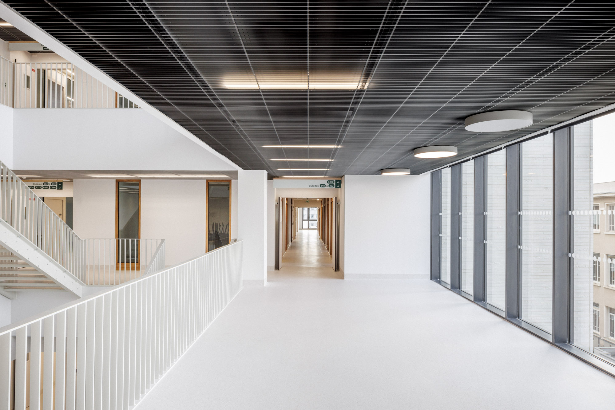 La neutralité de la façade répond à celle du plan. Les baies sont régulièrement distribuées sur un pas de 125 cm, module issu de la subdivision de la trame porteuse. Dans les hébergements, chaque chambre jouit ainsi d’une incroyable fenêtre toute hauteur de 2,5 m de large et de 2,80 de haut.