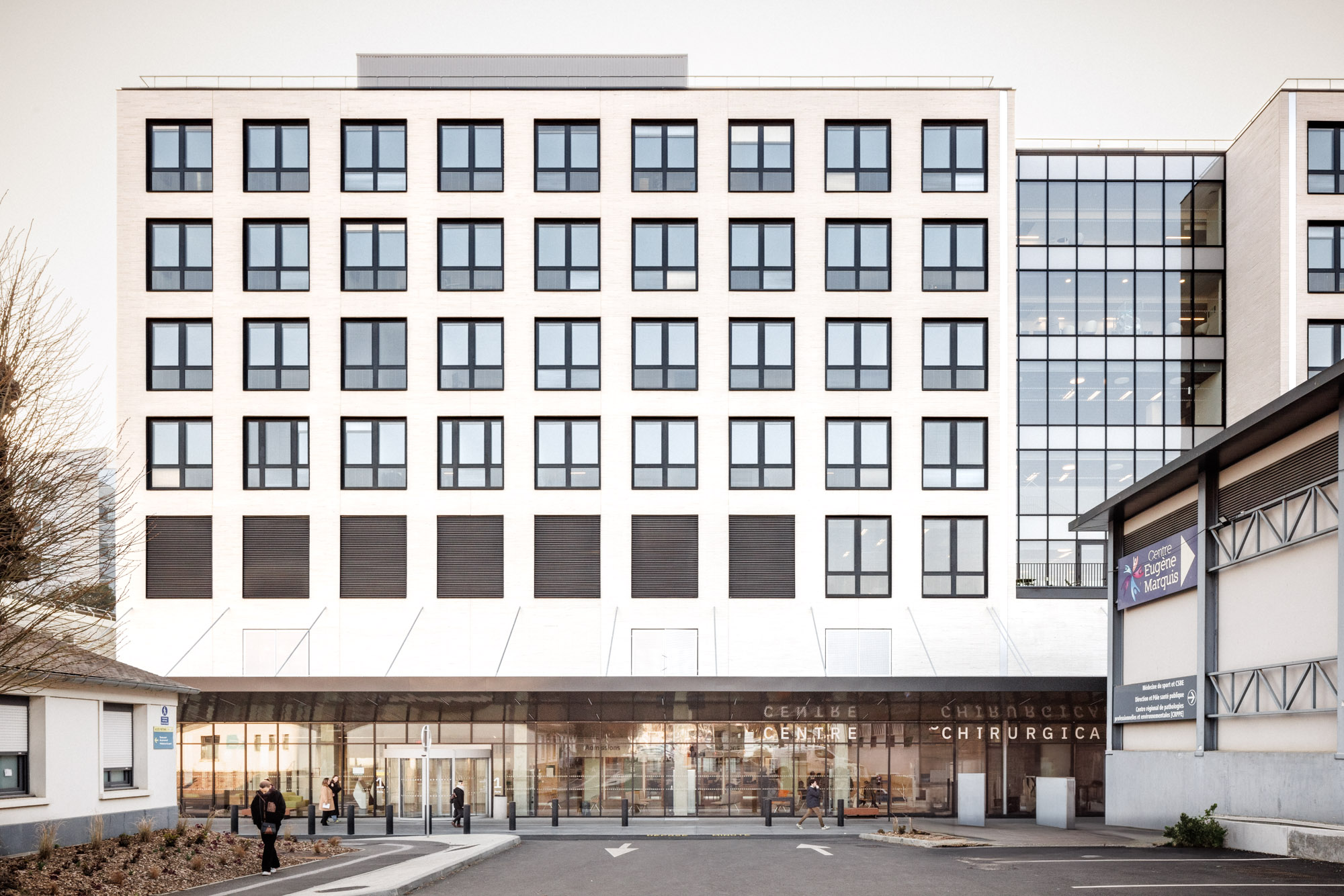 Inspiré des gratte-ciel new-yorkais, le projet leur emprunte cet écart intentionnel entre agilité du contenu et permanence du contenant ; il leur emprunte également leur matériau de prédilection : la brique, qui trouve naturellement sa place sur le site de la cité hospitalière où les façades minérales sont la règle et le métal l’exception. Cet emploi rend un discret hommage aux modénatures des pavillons originels des hospices de Pontchaillou. La mise en oeuvre, déclinée en longues briques claires appareillées telle la pierre de tufeau typique du centre de Rennes, permet de tisser du lien entre la ville et la cité hospitalière.