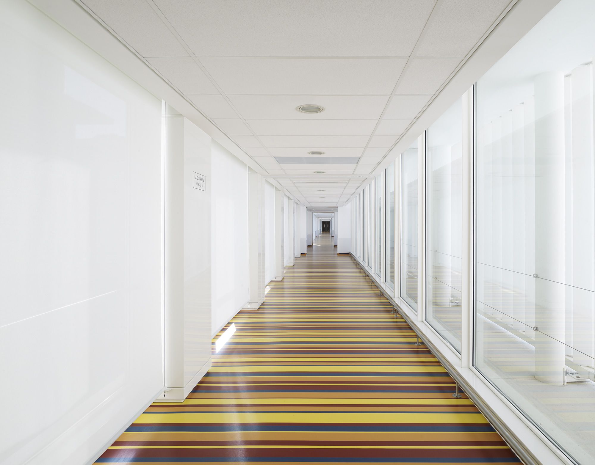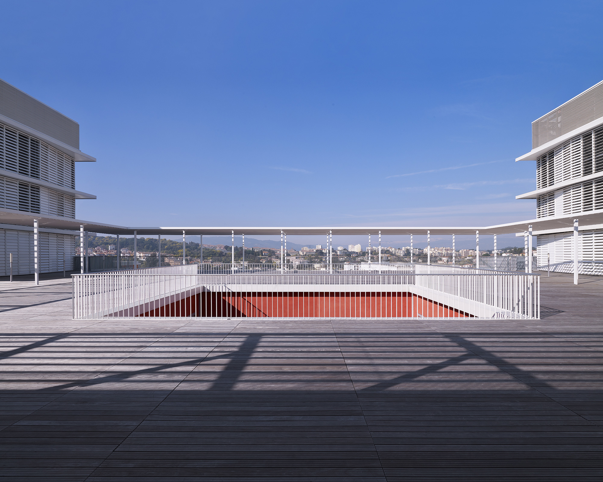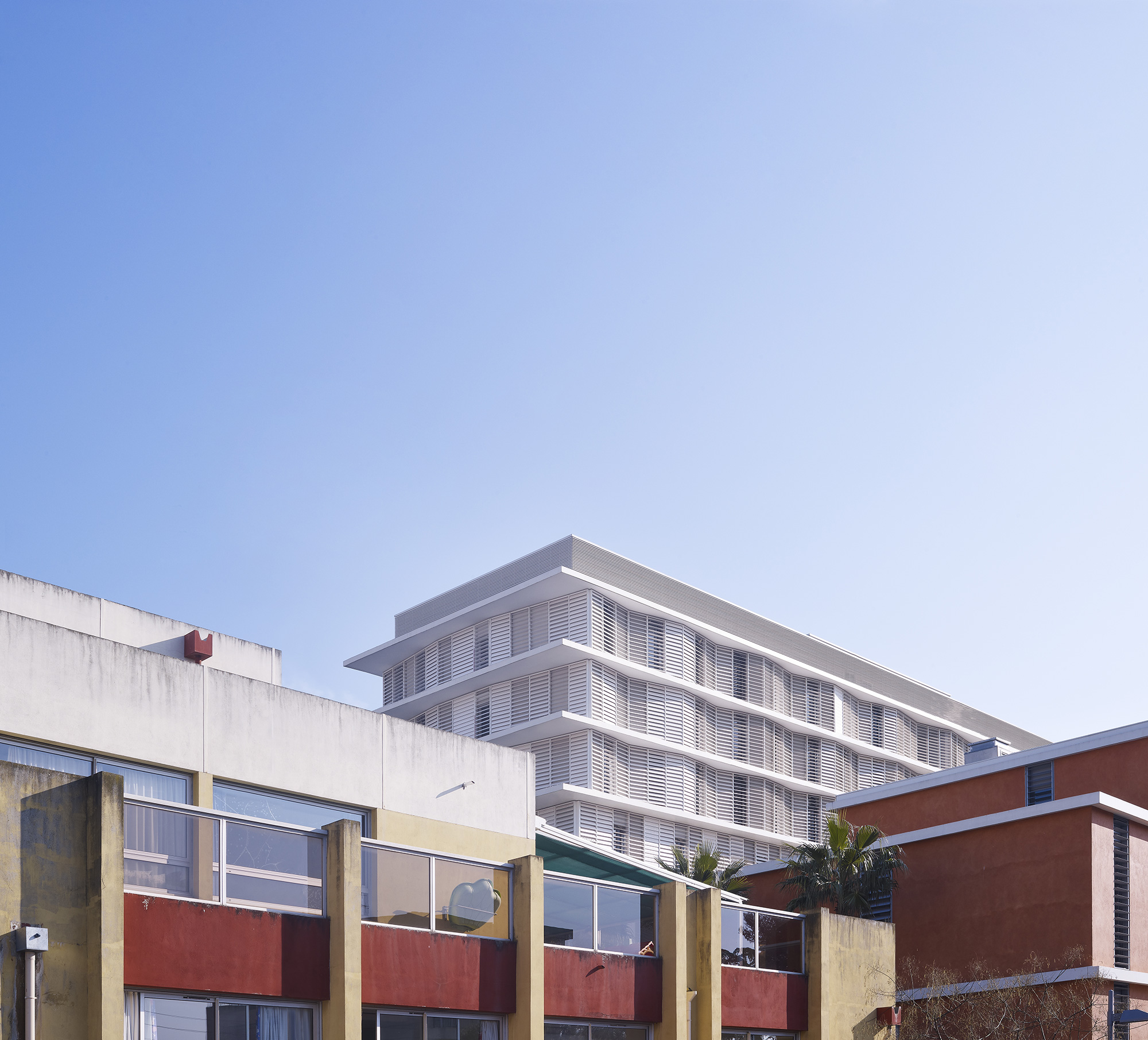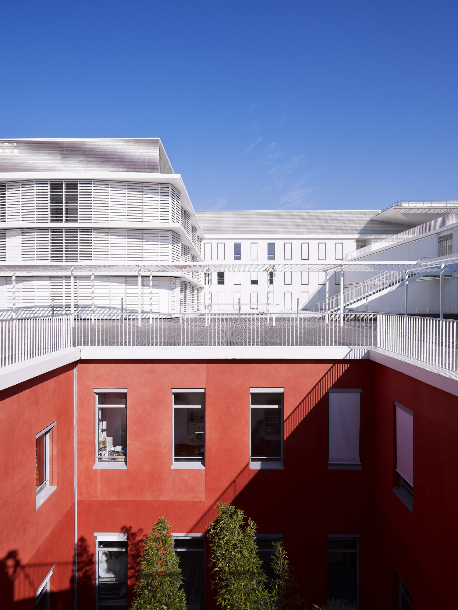 En façade, les persiennes blanches s’enchaînent, formant une ligne brisée qui couvre aussi bien les baies vitrées que les pans de mur. Référence aux persiennes des toiles de Matisse, elles garantissent dans les chambres une lumière douce et domestique, tout en assurant le contrôle de surchauffe des façades. Chaque niveau est délimité par le nez de plancher en léger débord et joue avec le rythme des baies et de leurs ombres.