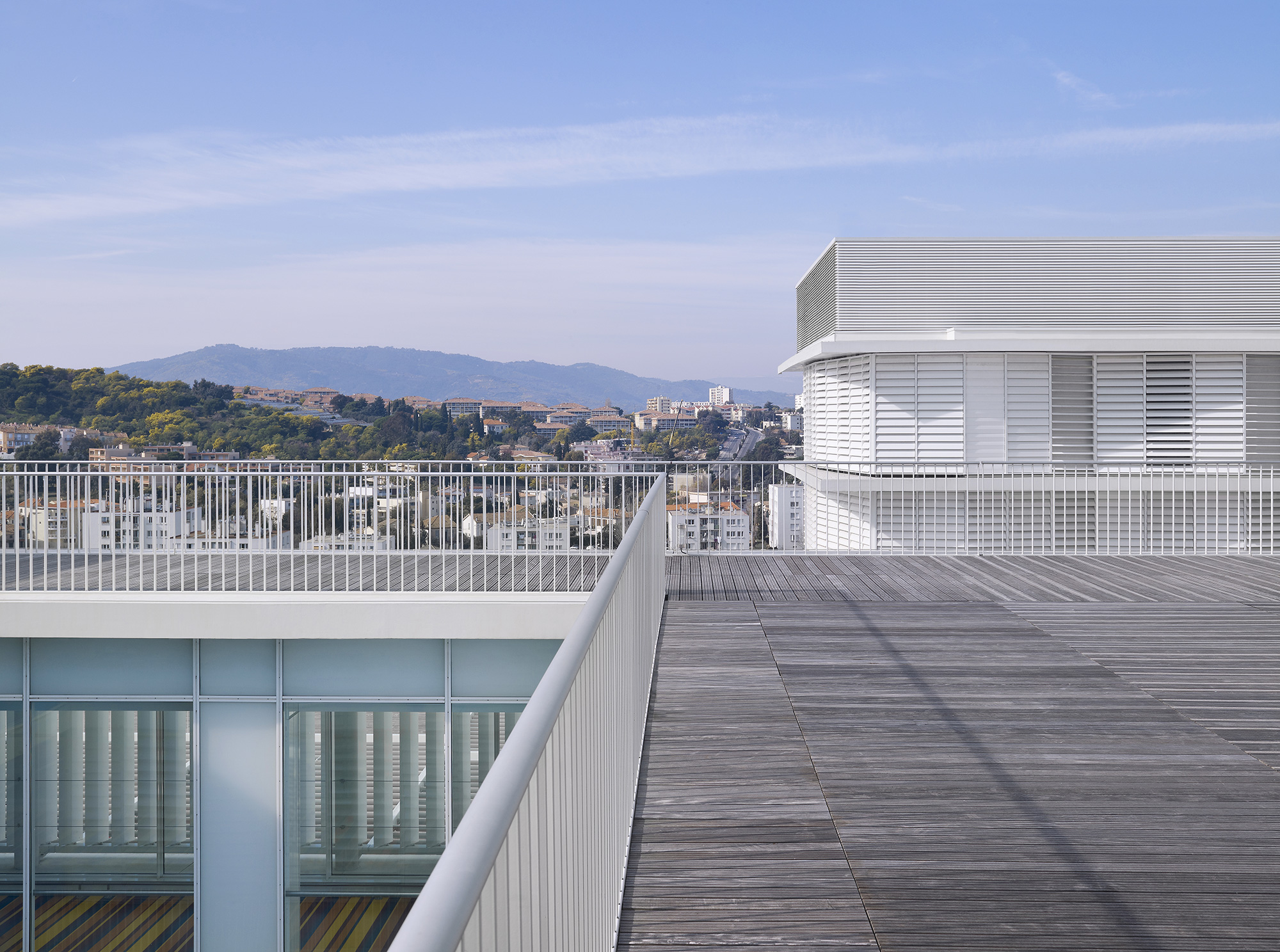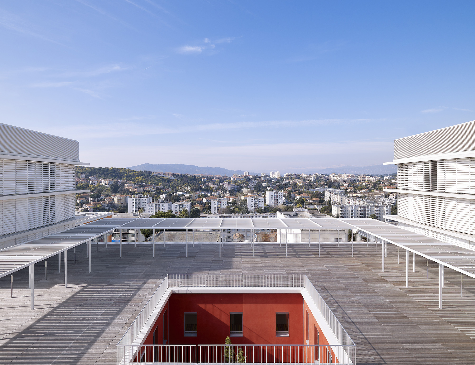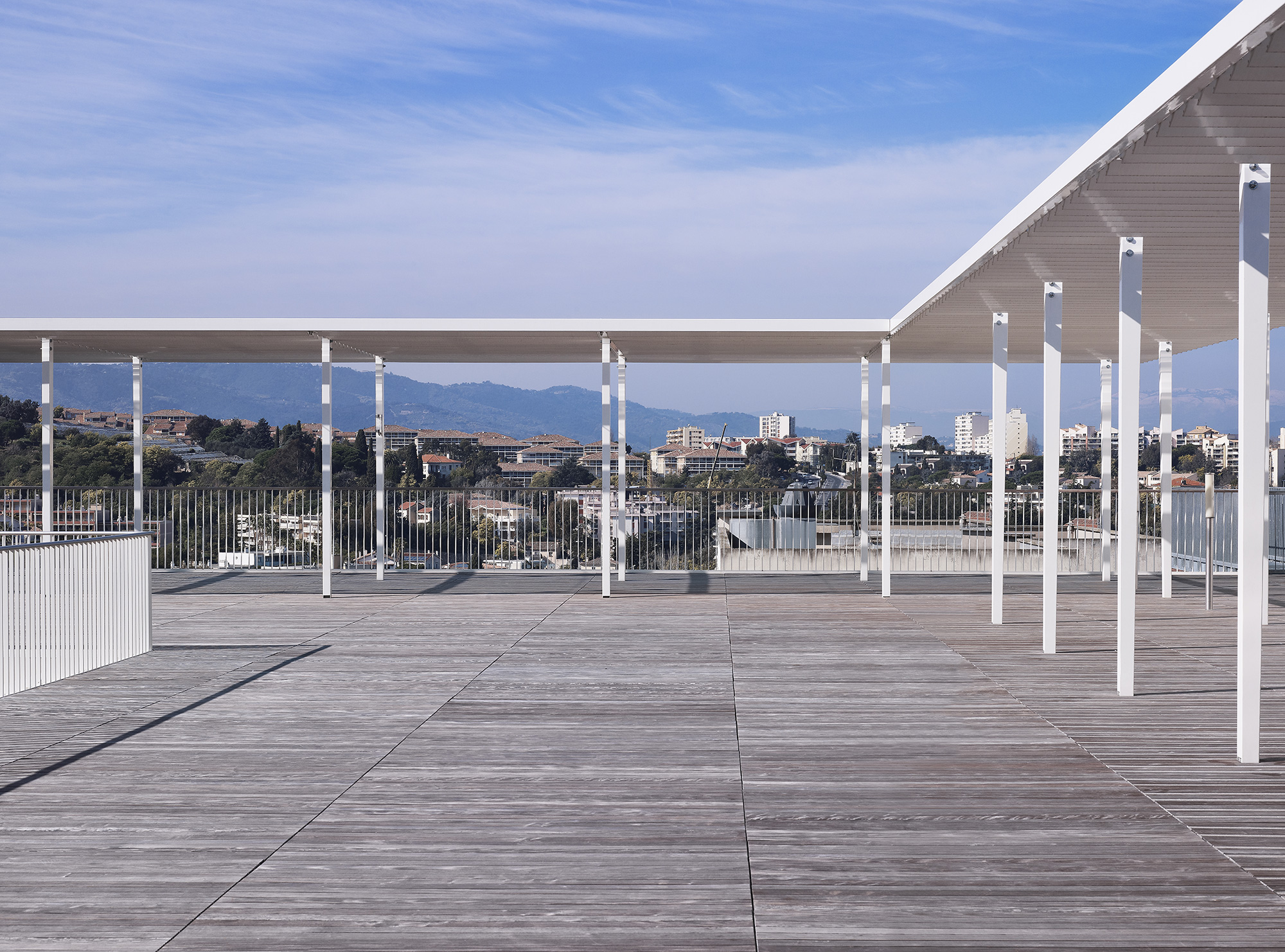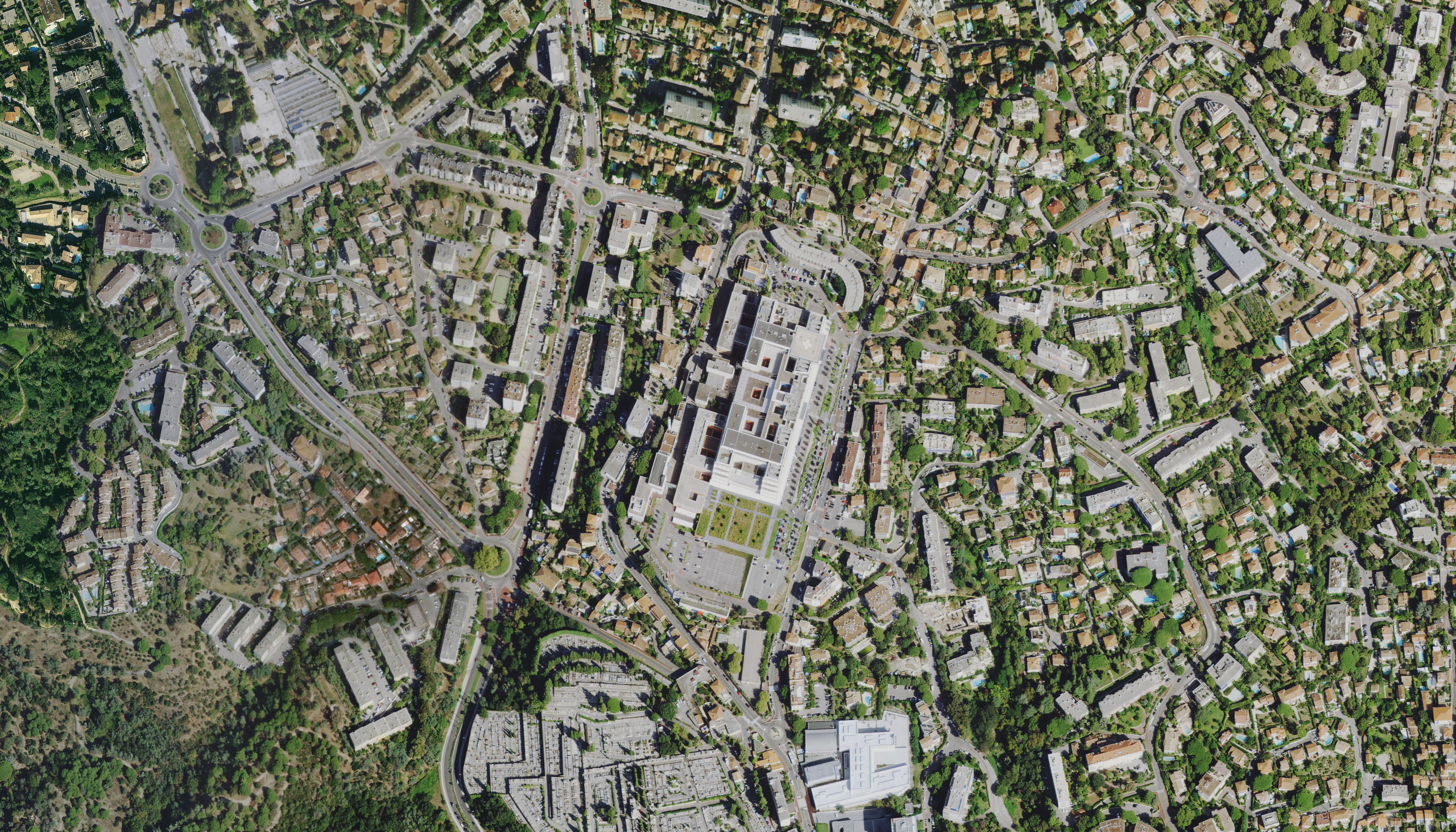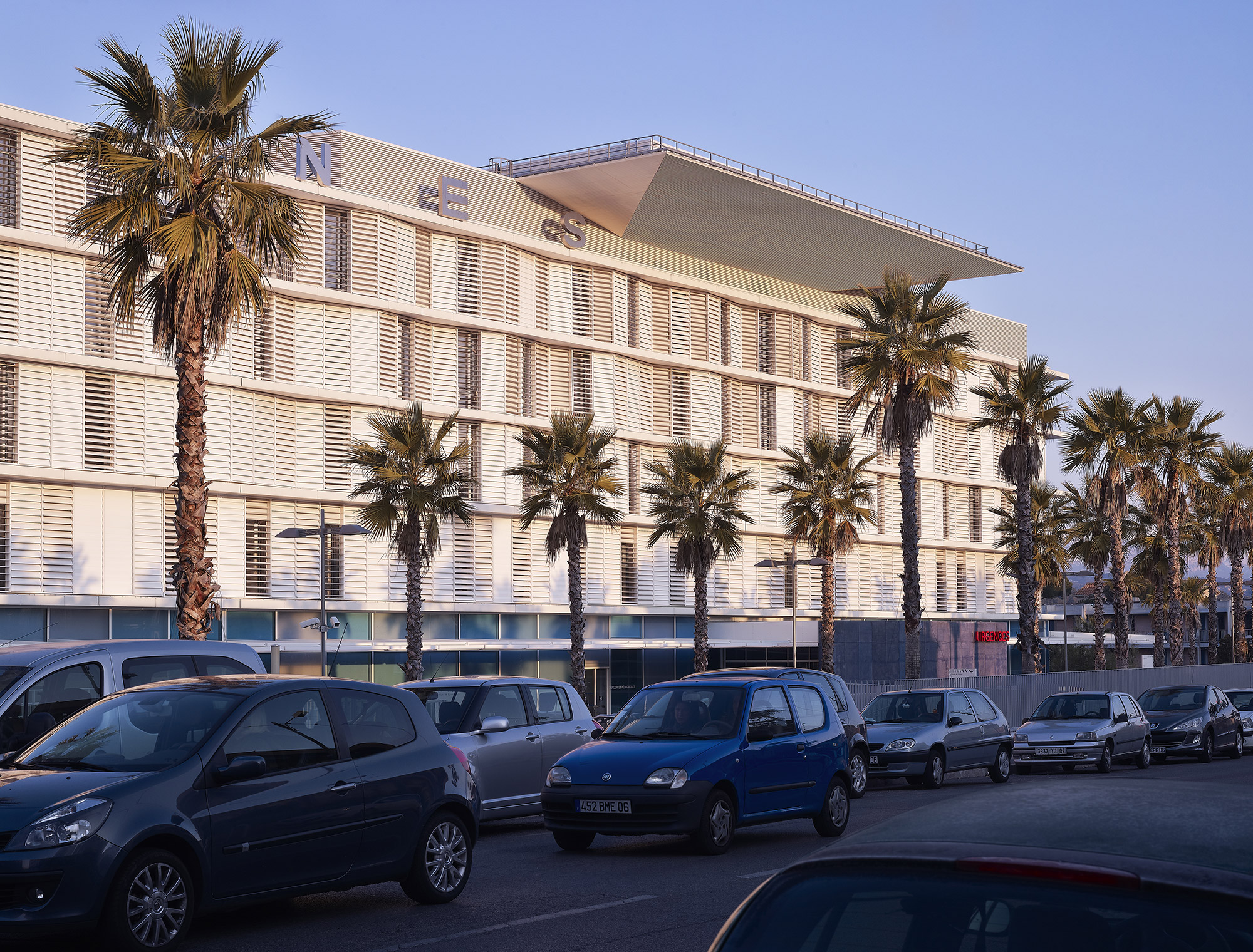 Sur les hauteurs, mais en cœur de ville, le centre hospitalier s’impose sur sa colline dominant la baie de Cannes tel un vaisseau amarré. On y accède par une contre-allée, tendue par une grande pergola filant tout le long de la façade principale pour mieux souligner les différents accès (urgences, général, maternité, etc.) et flanquée d’une majestueuse rangée de palmiers, assumant pleinement l’analogie avec la Croisette.