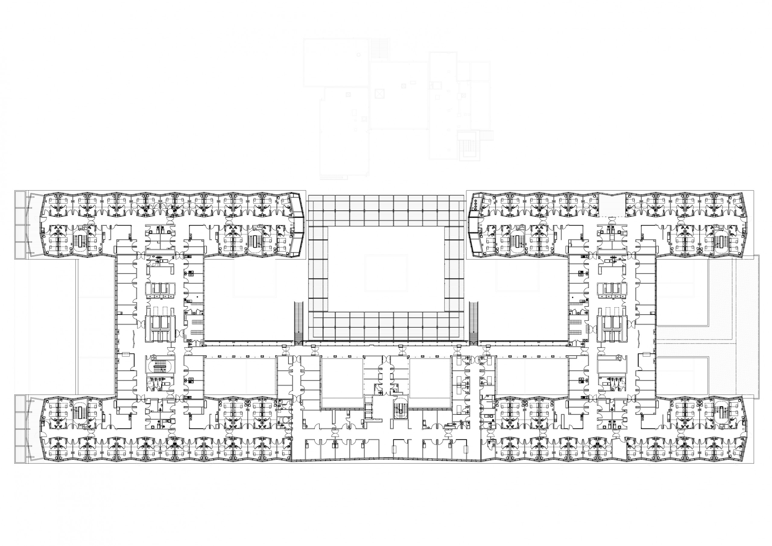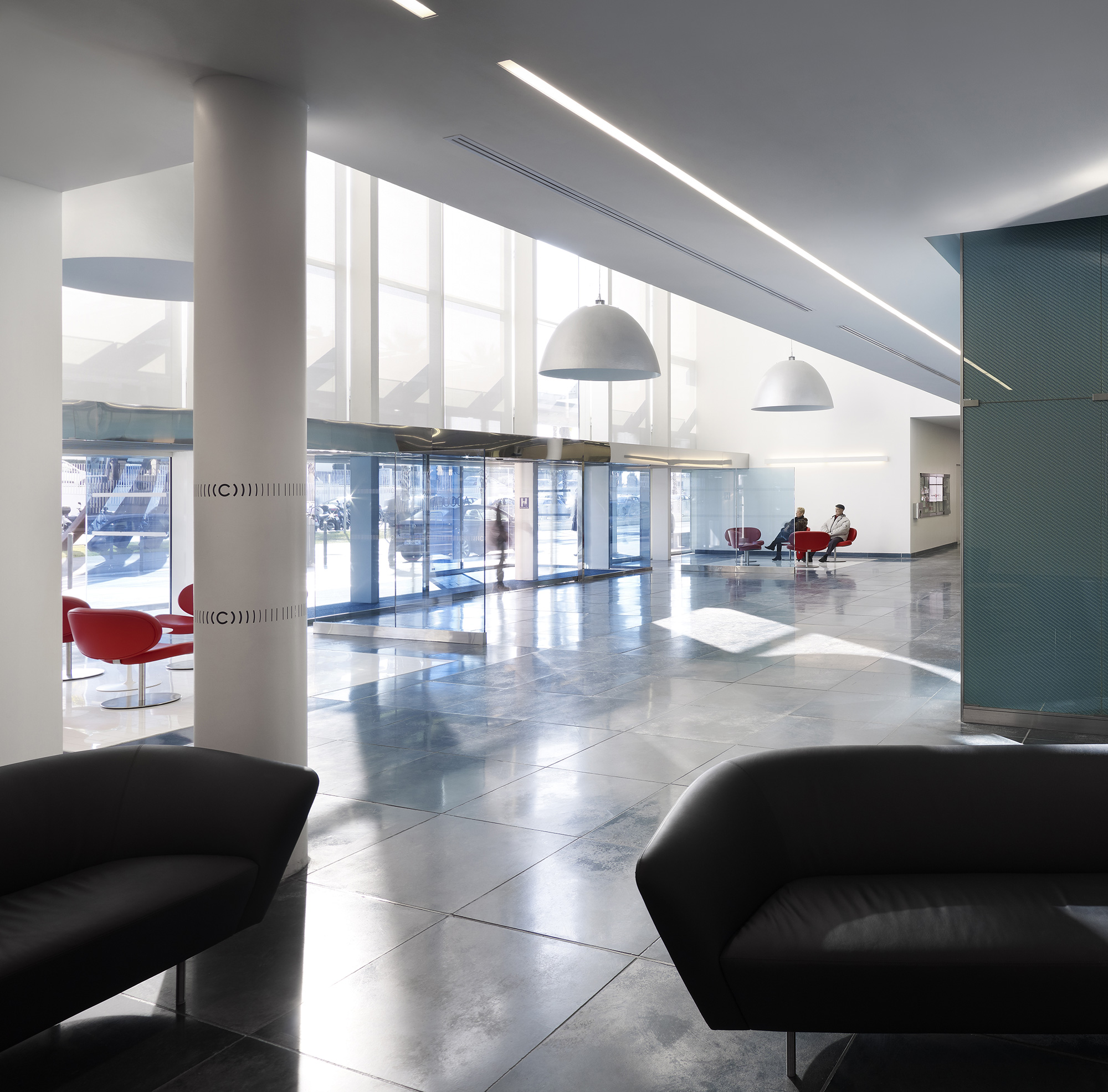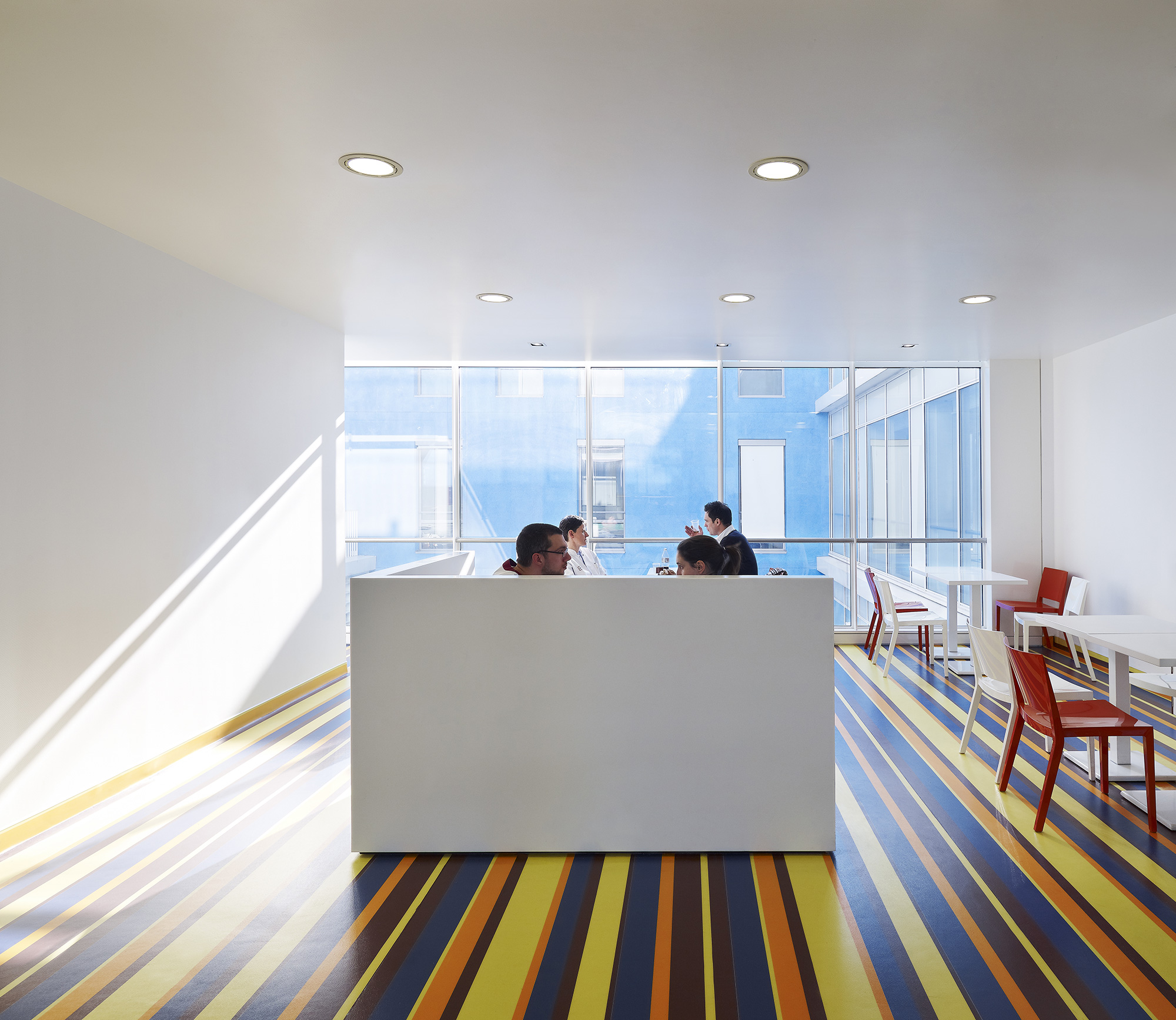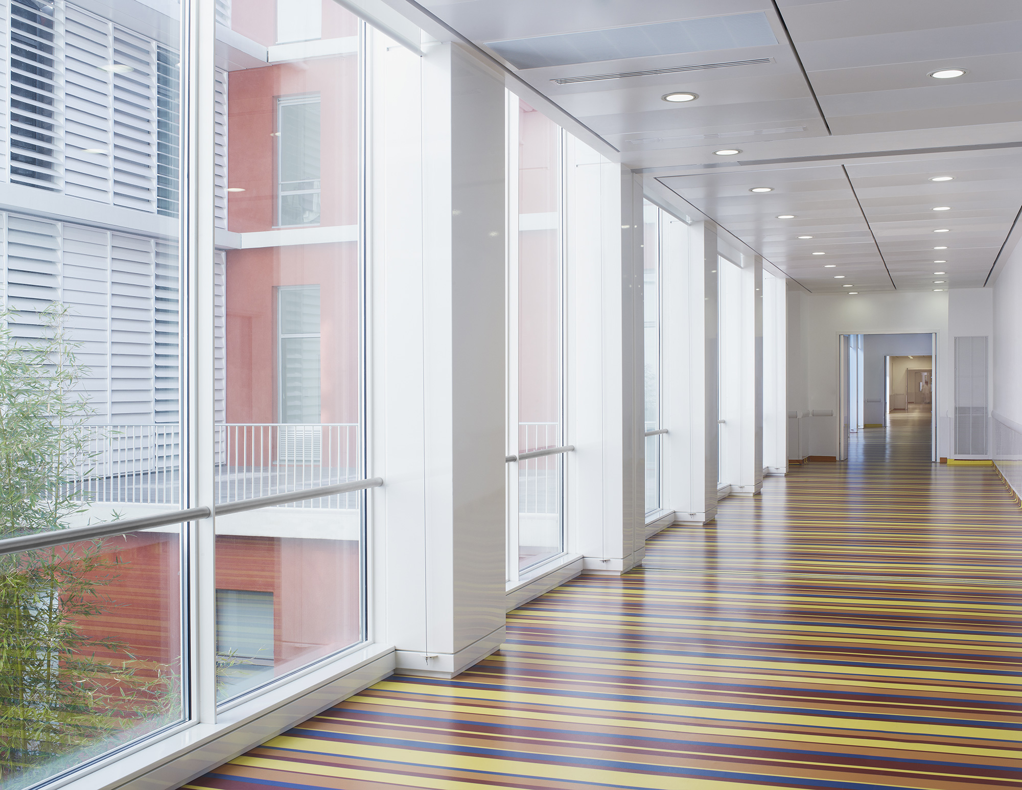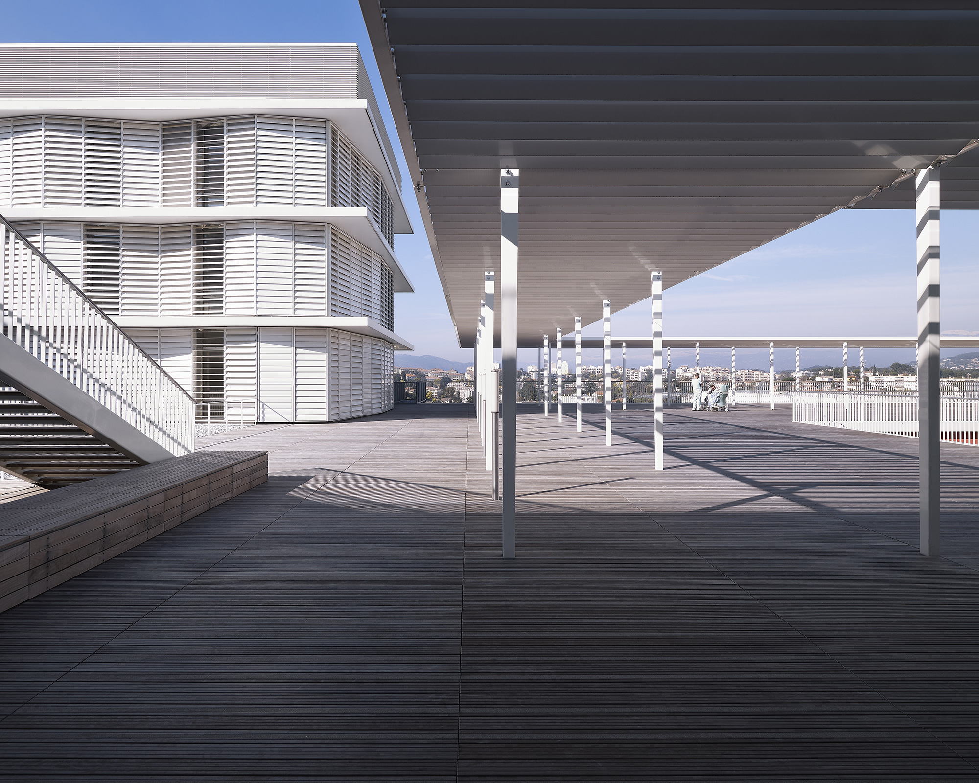 À l’étage, au-dessus du socle parallélépipédique abritant le plateau technique, le bâtiment se scinde en deux parties pour offrir en son centre une terrasse d’une rare quiétude, habillée de teck, qui évoque le pont supérieur d’un paquebot. C’est un lieu de détente pour les patients et leurs proches, à la fois ouvert sur le ciel et fermé à l’agitation des circulations.