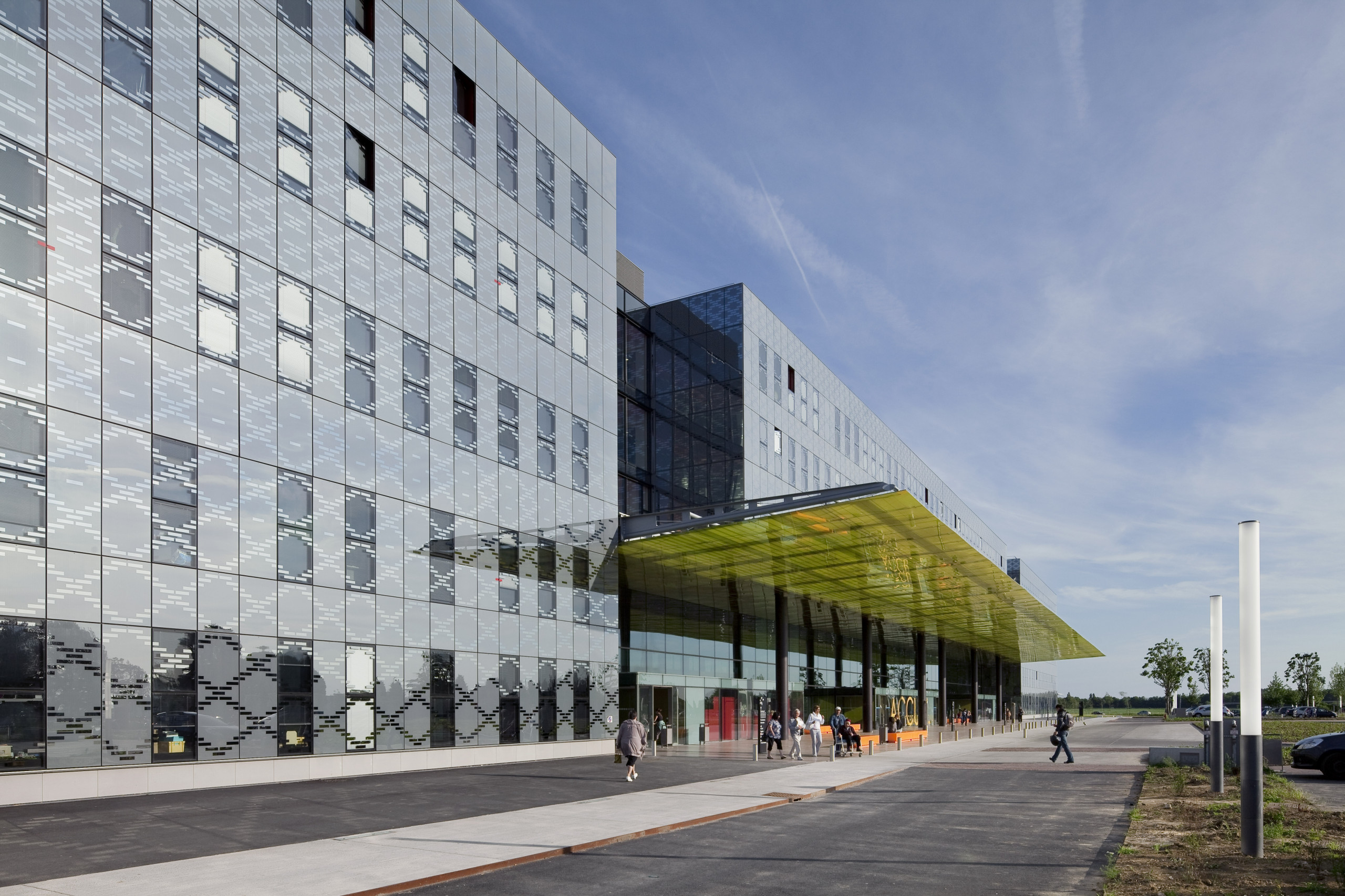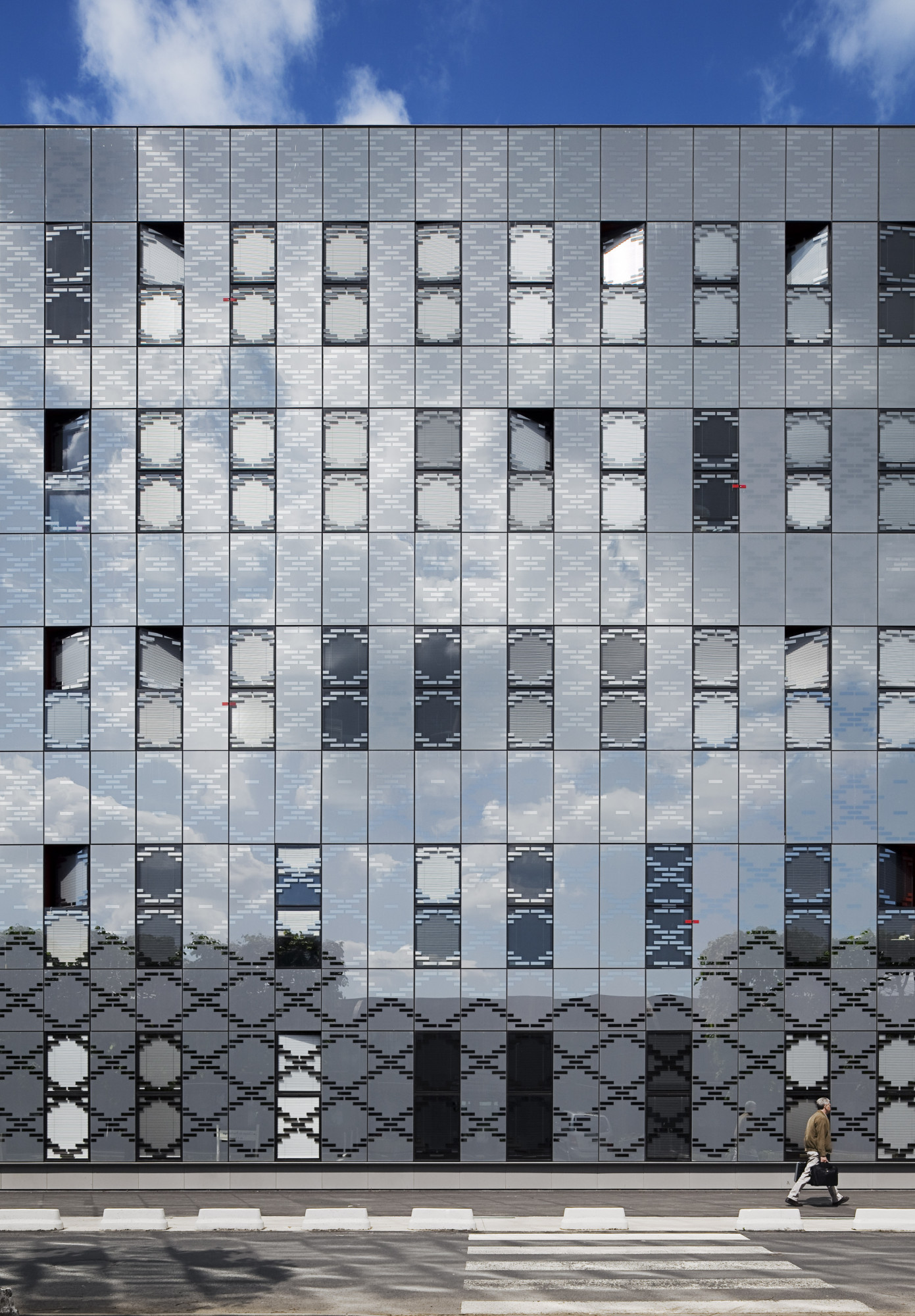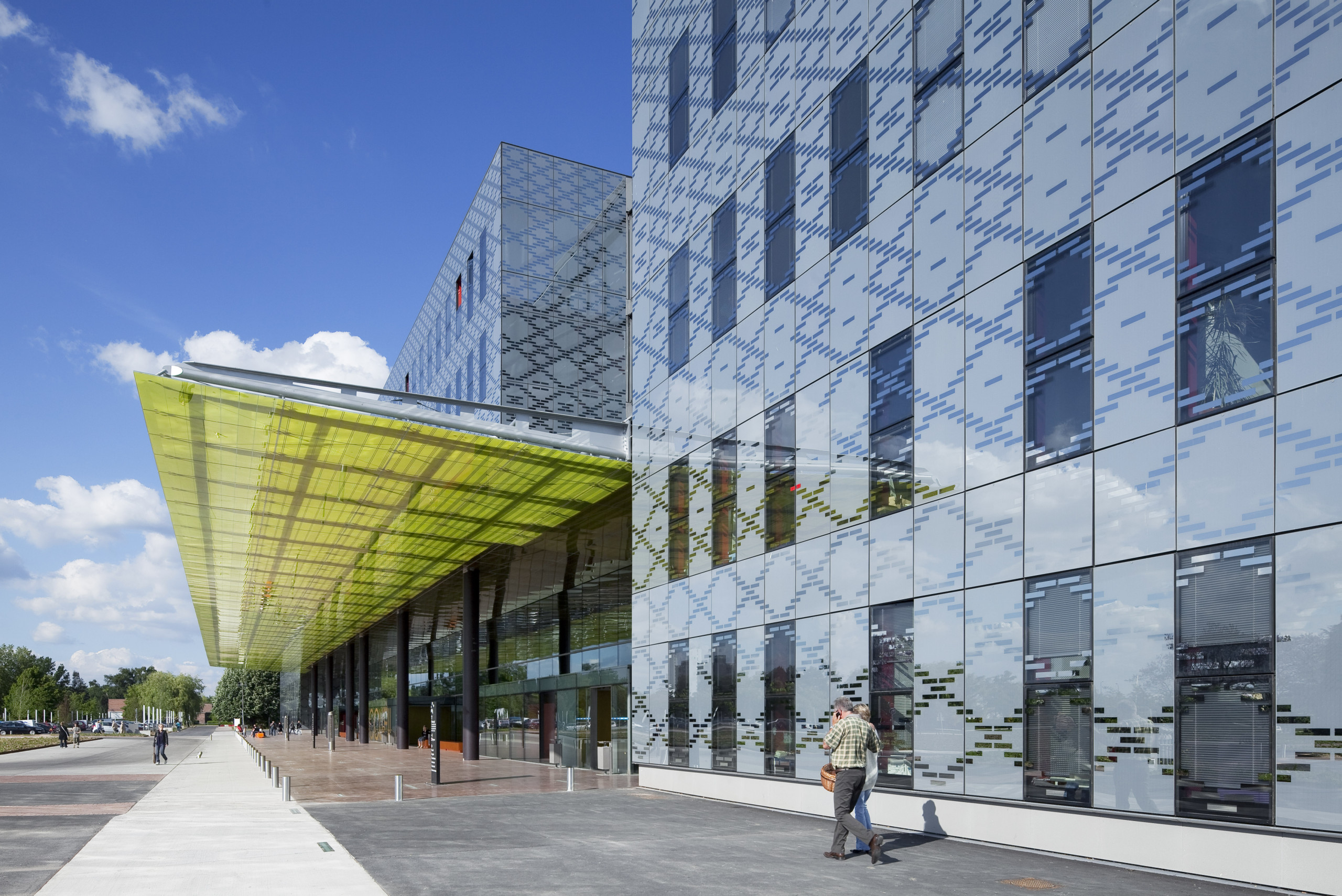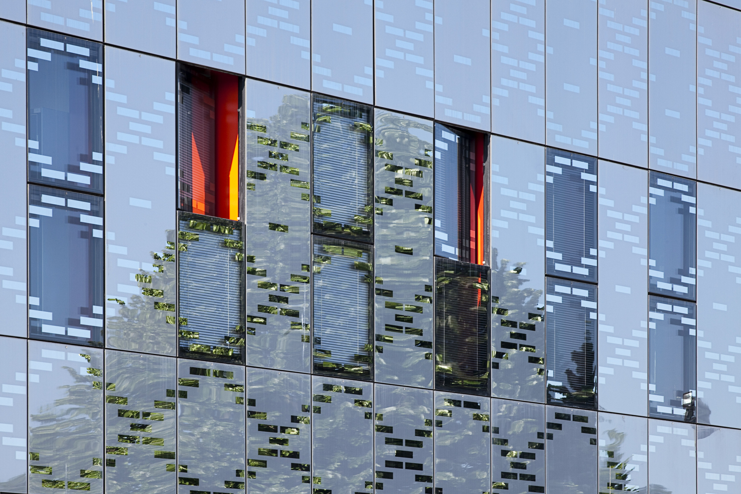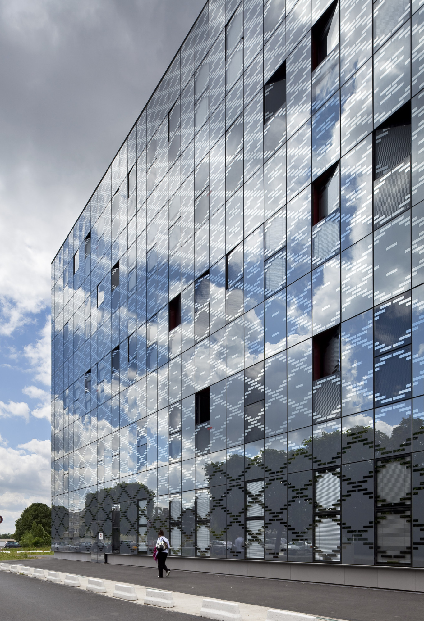 Ce monospace compact propose une forme finie, mais qui jamais ne se ferme, laissant des ouvertures, des failles pour des extensions satellitaires, intériorisant ainsi les espaces extérieurs, produisant les modalités d’une imbrication entre le dehors et le dedans. Sa hauteur ne dépasse pas quatre étages pour conserver l’agrément des patios qui apportent lumière et ventilation naturelle. La façade en verre sérigraphié s’orne d’un dessin géométrique en losange, référence au motif de brique vernissée régionale. L’argenture déposée en diagonale s’intensifie en hauteur et sa brillance, comme un miroir sans tain, alterne avec l’opacité du verre noir. Ce contraste d’éléments présents/absents, flous/précis confère au bâtiment une évanescence qui le dématérialise et l’allège. À l’intérieur du bâtiment, l’ambiance est inversée, les façades des patios se parent d’une peau (béton de résine) au ton de terre cuite prodiguant une lumière rosée.