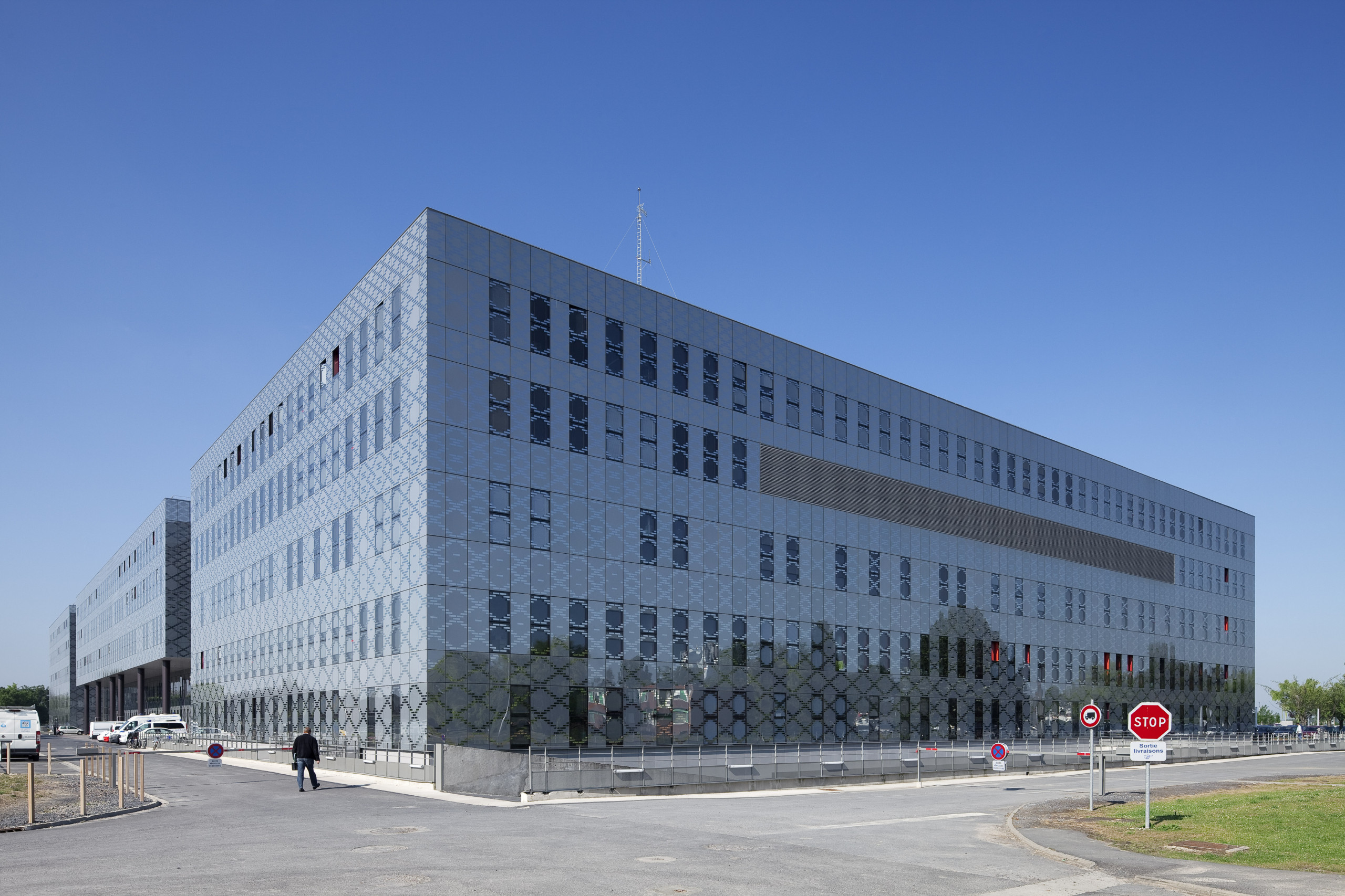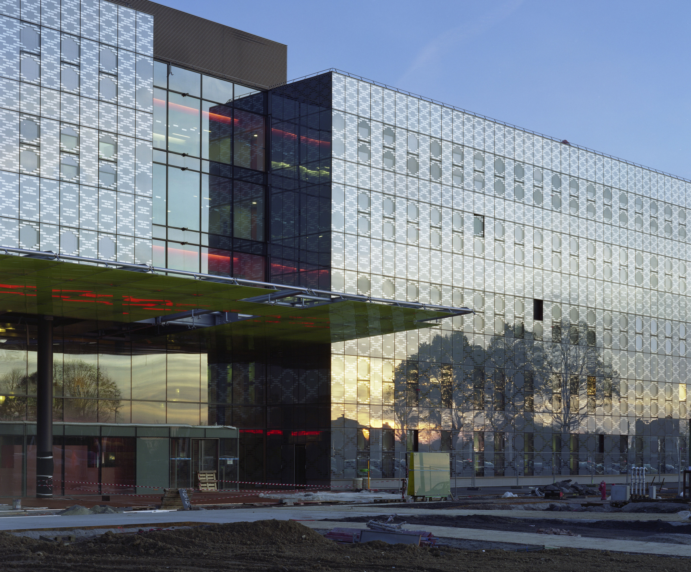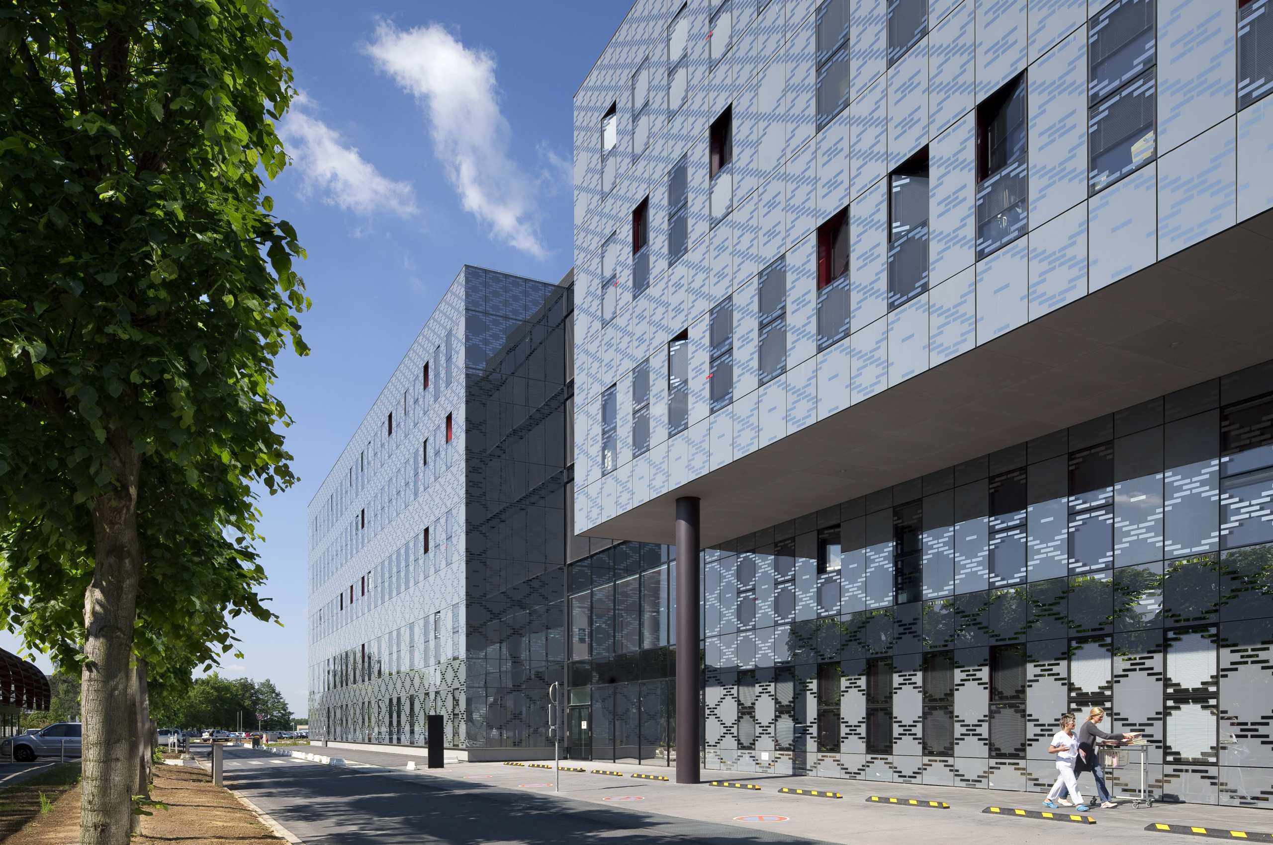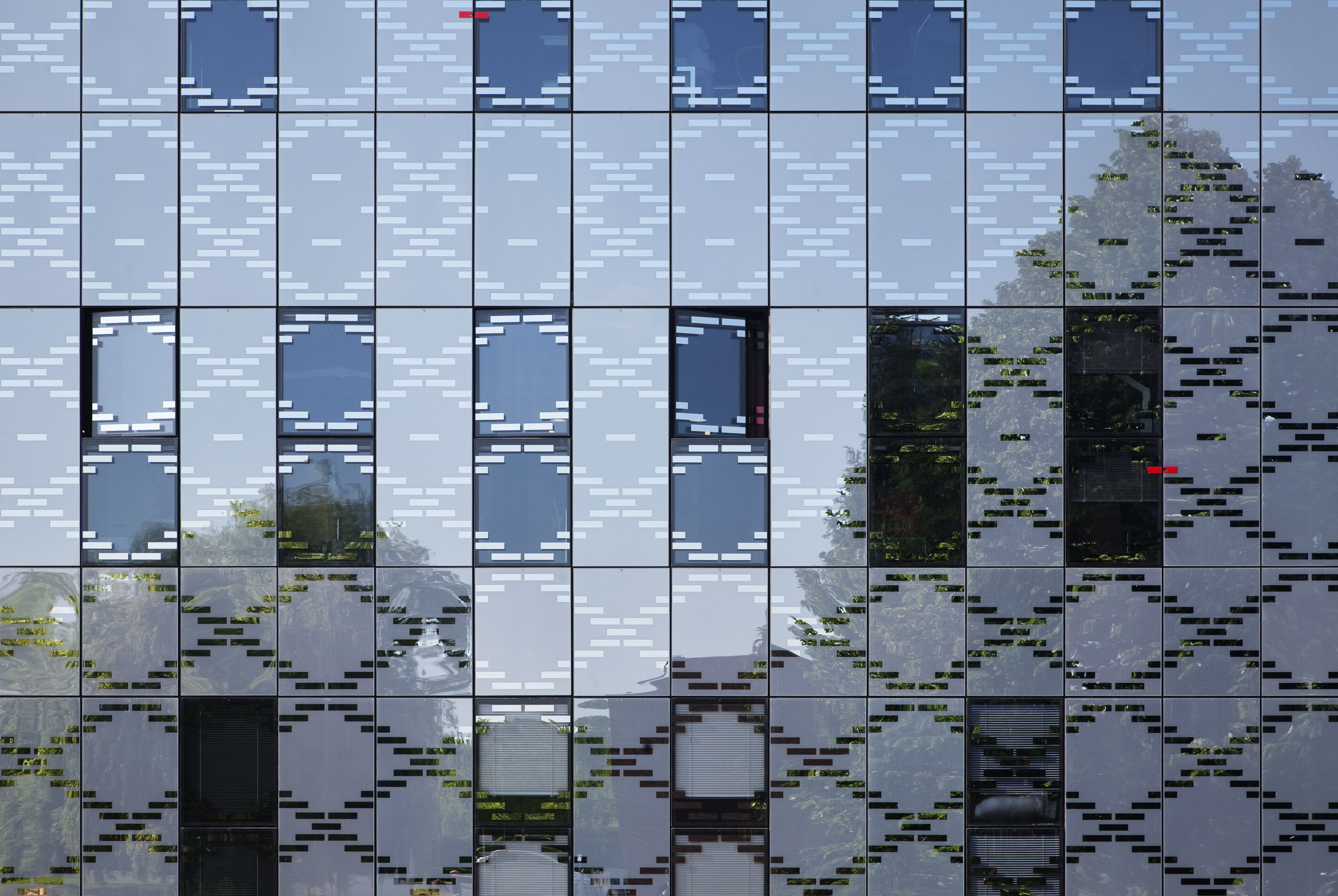 Ce monospace compact propose une forme finie, mais qui jamais ne se ferme, laissant des ouvertures, des failles pour des extensions satellitaires, intériorisant ainsi les espaces extérieurs, produisant les modalités d’une imbrication entre le dehors et le dedans. Sa hauteur ne dépasse pas quatre étages pour conserver l’agrément des patios qui apportent lumière et ventilation naturelle. La façade en verre sérigraphié s’orne d’un dessin géométrique en losange, référence au motif de brique vernissée régionale. L’argenture déposée en diagonale s’intensifie en hauteur et sa brillance, comme un miroir sans tain, alterne avec l’opacité du verre noir. Ce contraste d’éléments présents/absents, flous/précis confère au bâtiment une évanescence qui le dématérialise et l’allège. À l’intérieur du bâtiment, l’ambiance est inversée, les façades des patios se parent d’une peau (béton de résine) au ton de terre cuite prodiguant une lumière rosée.