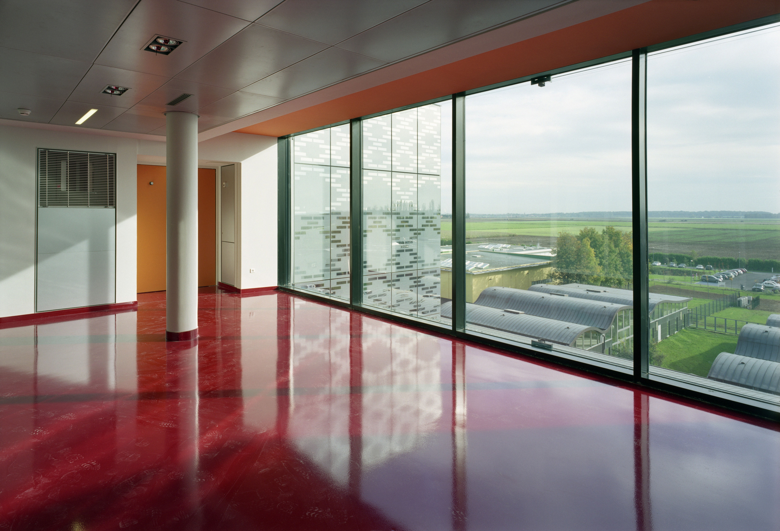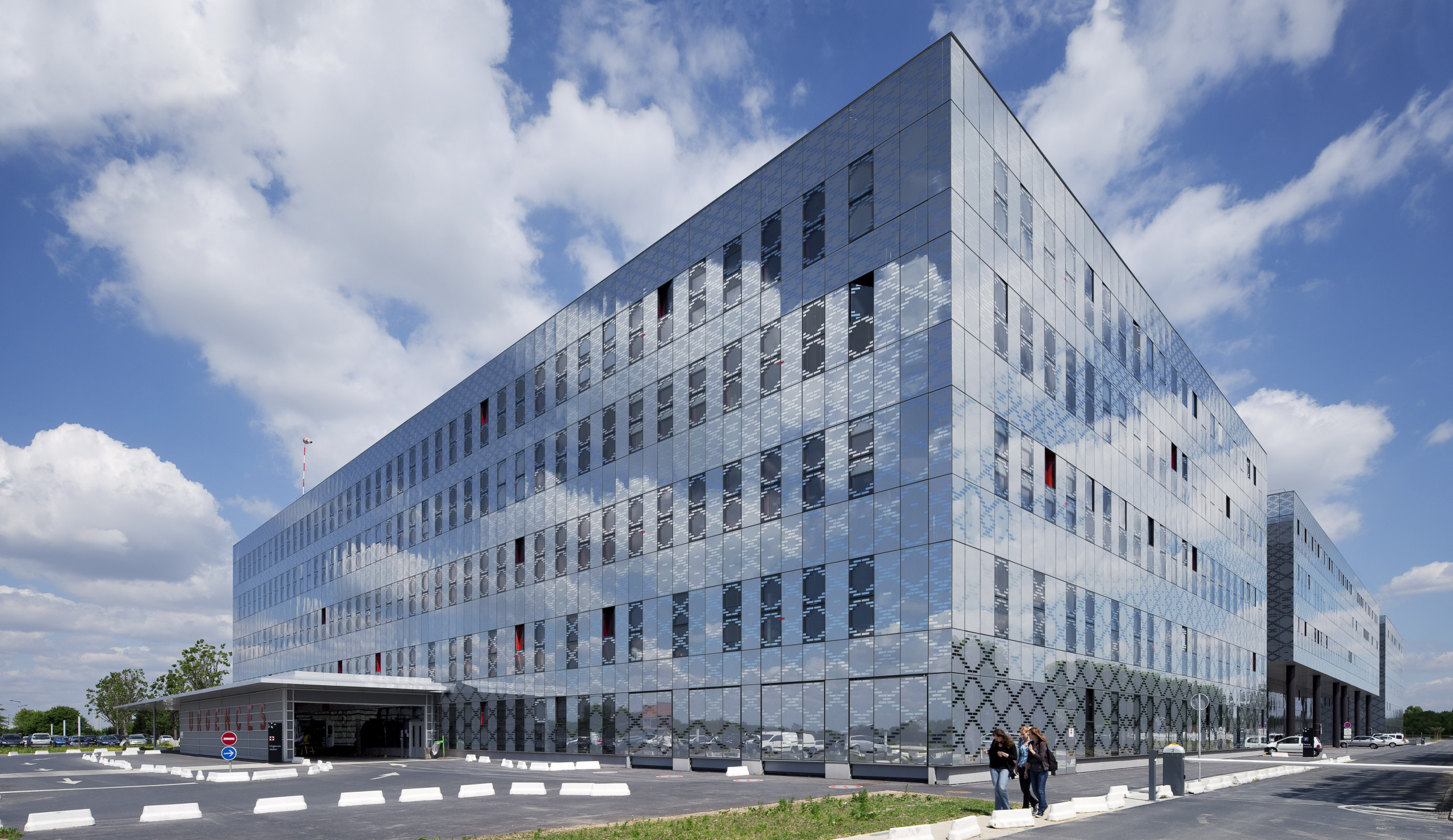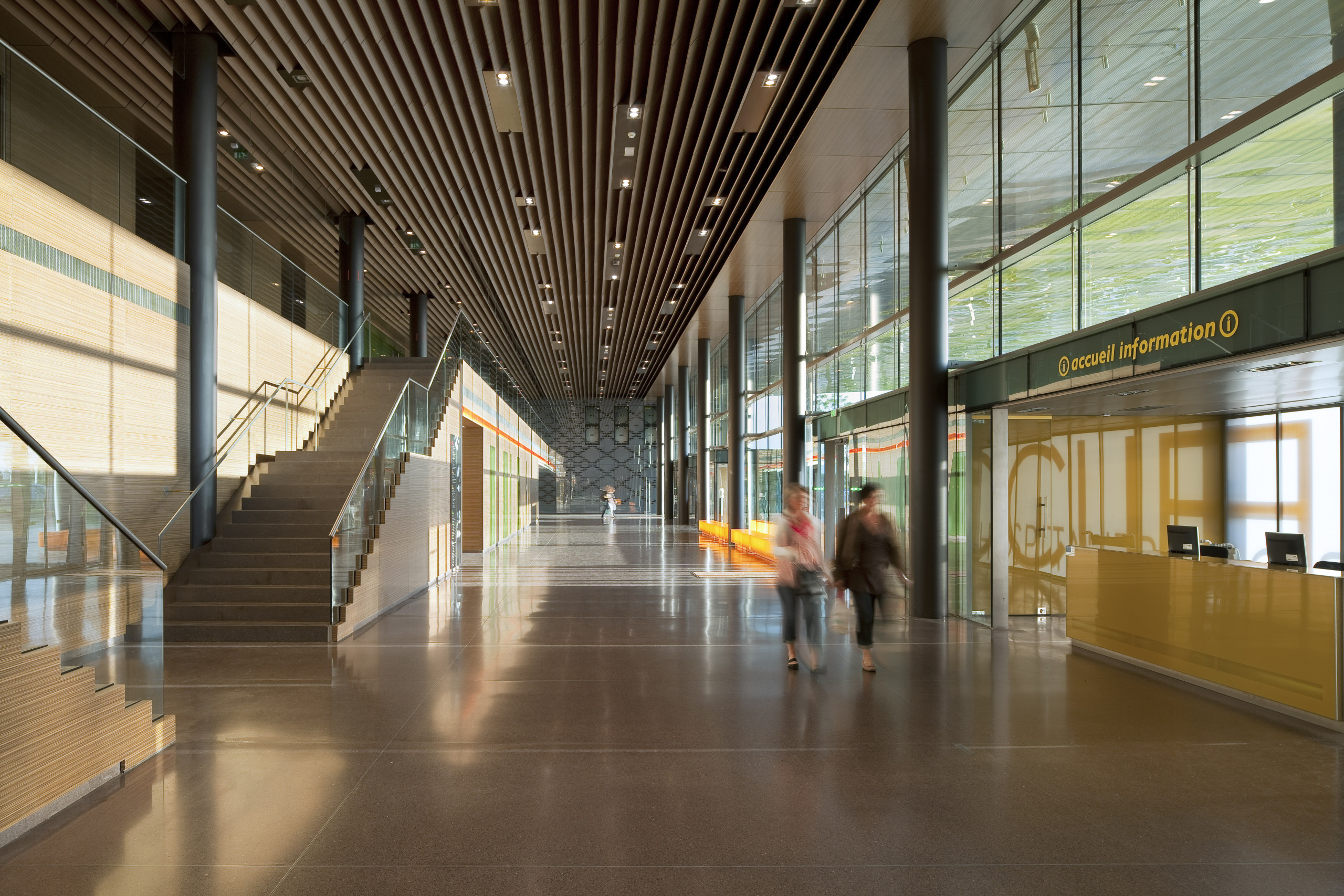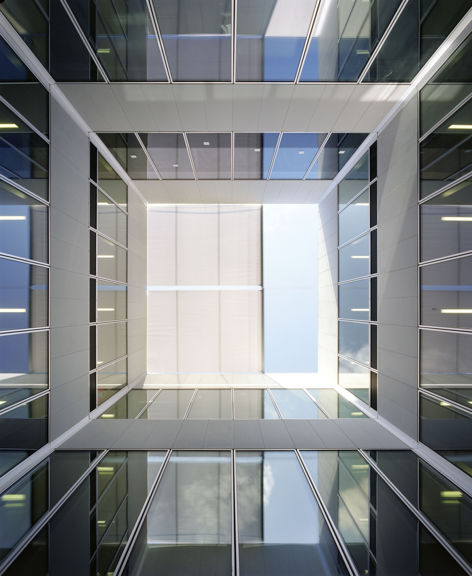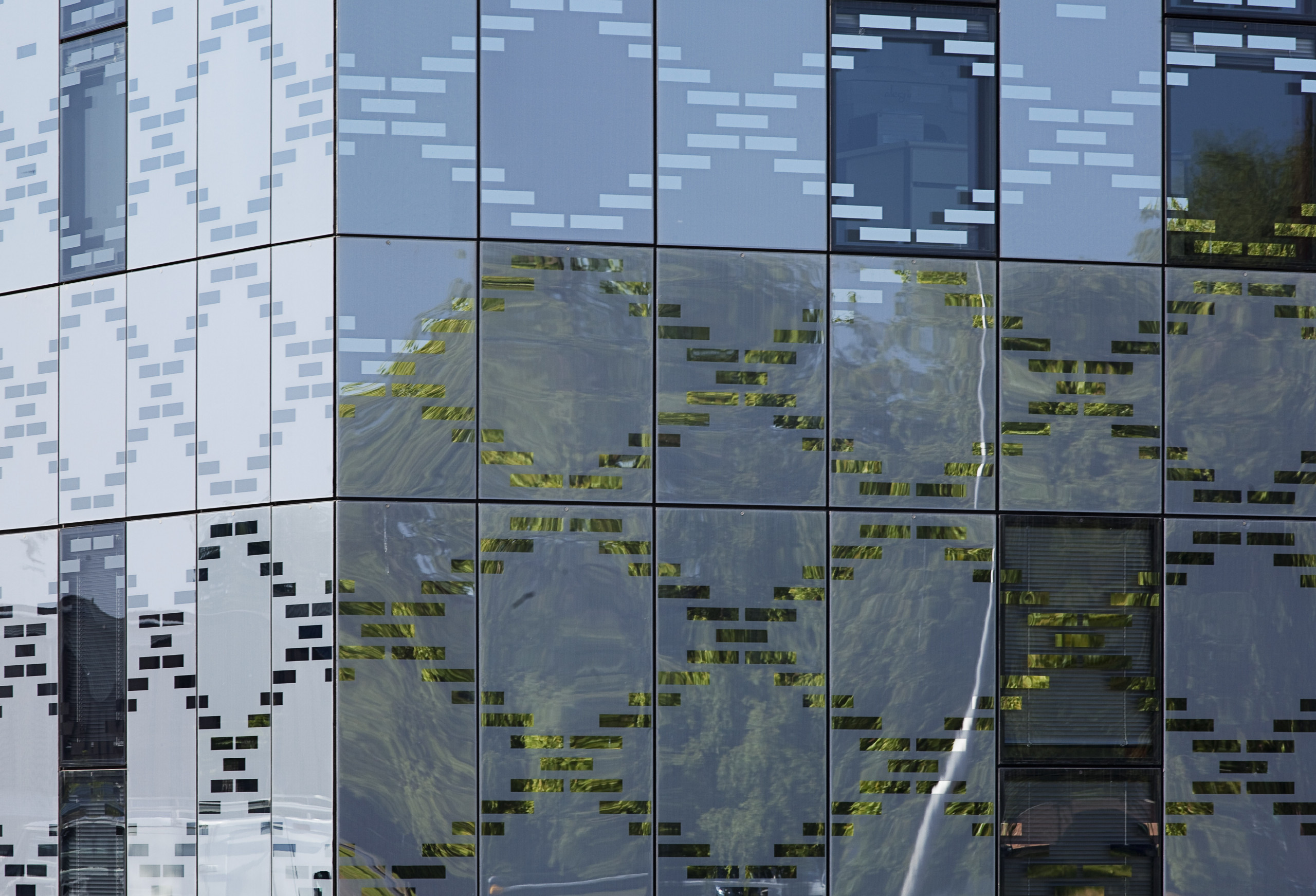 Ce monospace compact propose une forme finie, mais qui jamais ne se ferme, laissant des ouvertures, des failles pour des extensions satellitaires, intériorisant ainsi les espaces extérieurs, produisant les modalités d’une imbrication entre le dehors et le dedans. Sa hauteur ne dépasse pas quatre étages pour conserver l’agrément des patios qui apportent lumière et ventilation naturelle. La façade en verre sérigraphié s’orne d’un dessin géométrique en losange, référence au motif de brique vernissée régionale. L’argenture déposée en diagonale s’intensifie en hauteur et sa brillance, comme un miroir sans tain, alterne avec l’opacité du verre noir. Ce contraste d’éléments présents/absents, flous/précis confère au bâtiment une évanescence qui le dématérialise et l’allège. À l’intérieur du bâtiment, l’ambiance est inversée, les façades des patios se parent d’une peau (béton de résine) au ton de terre cuite prodiguant une lumière rosée.