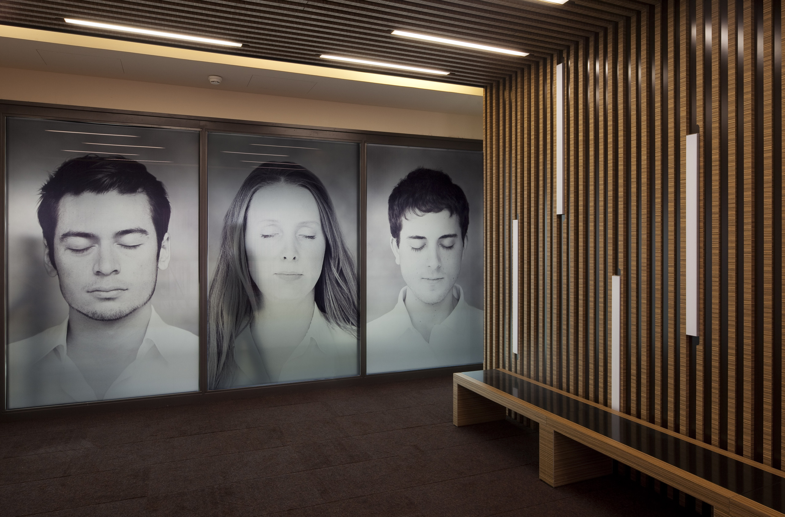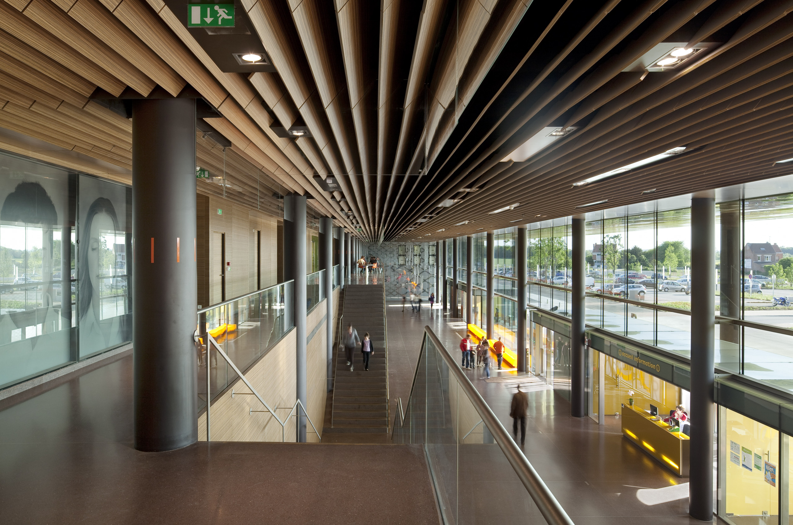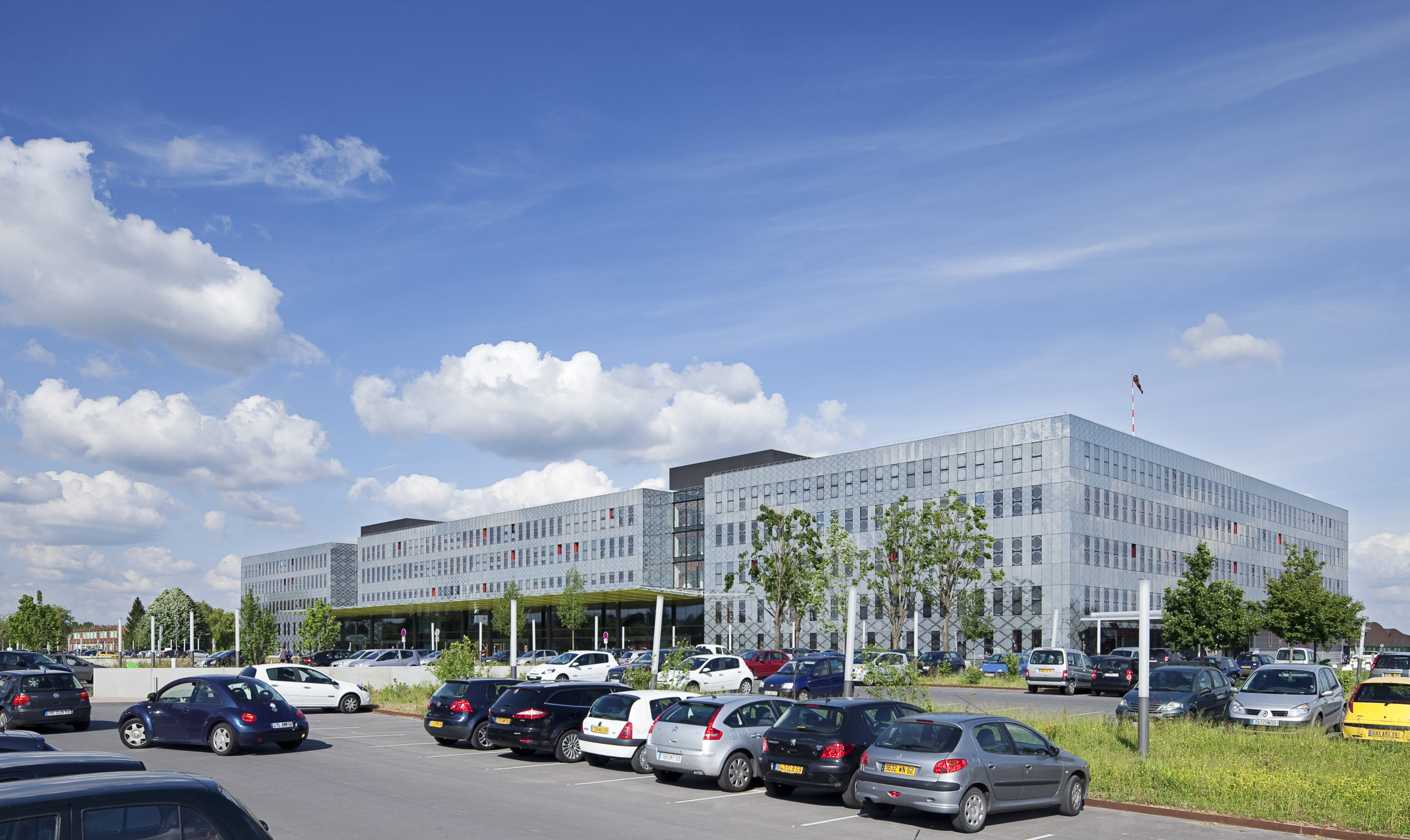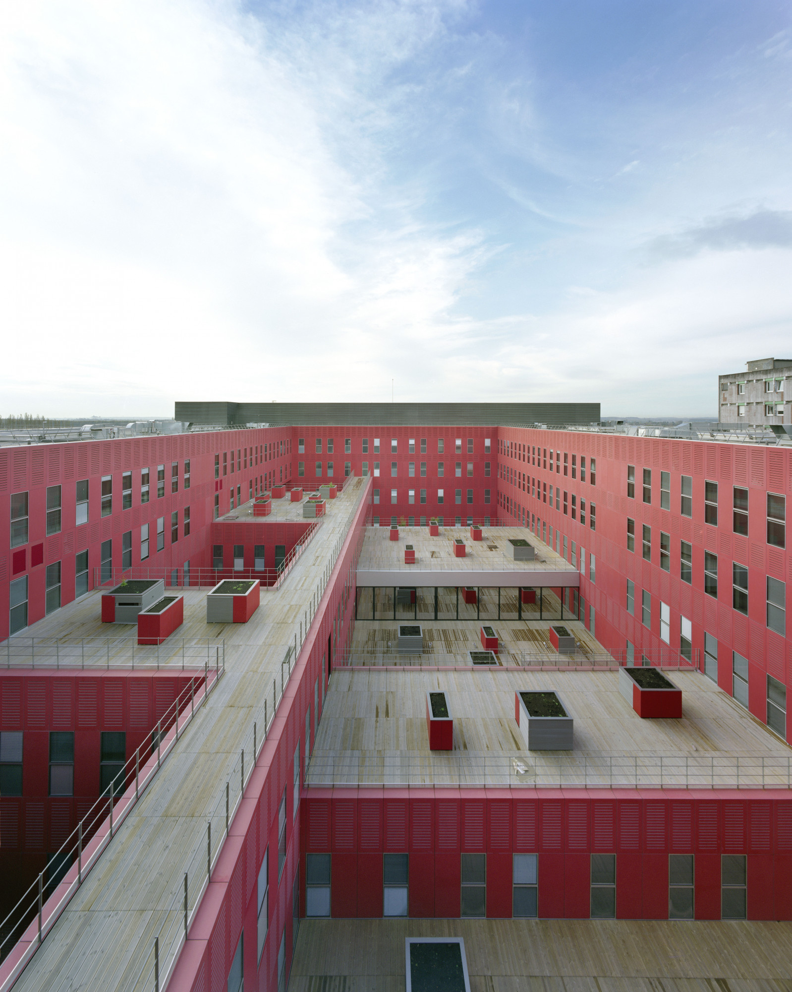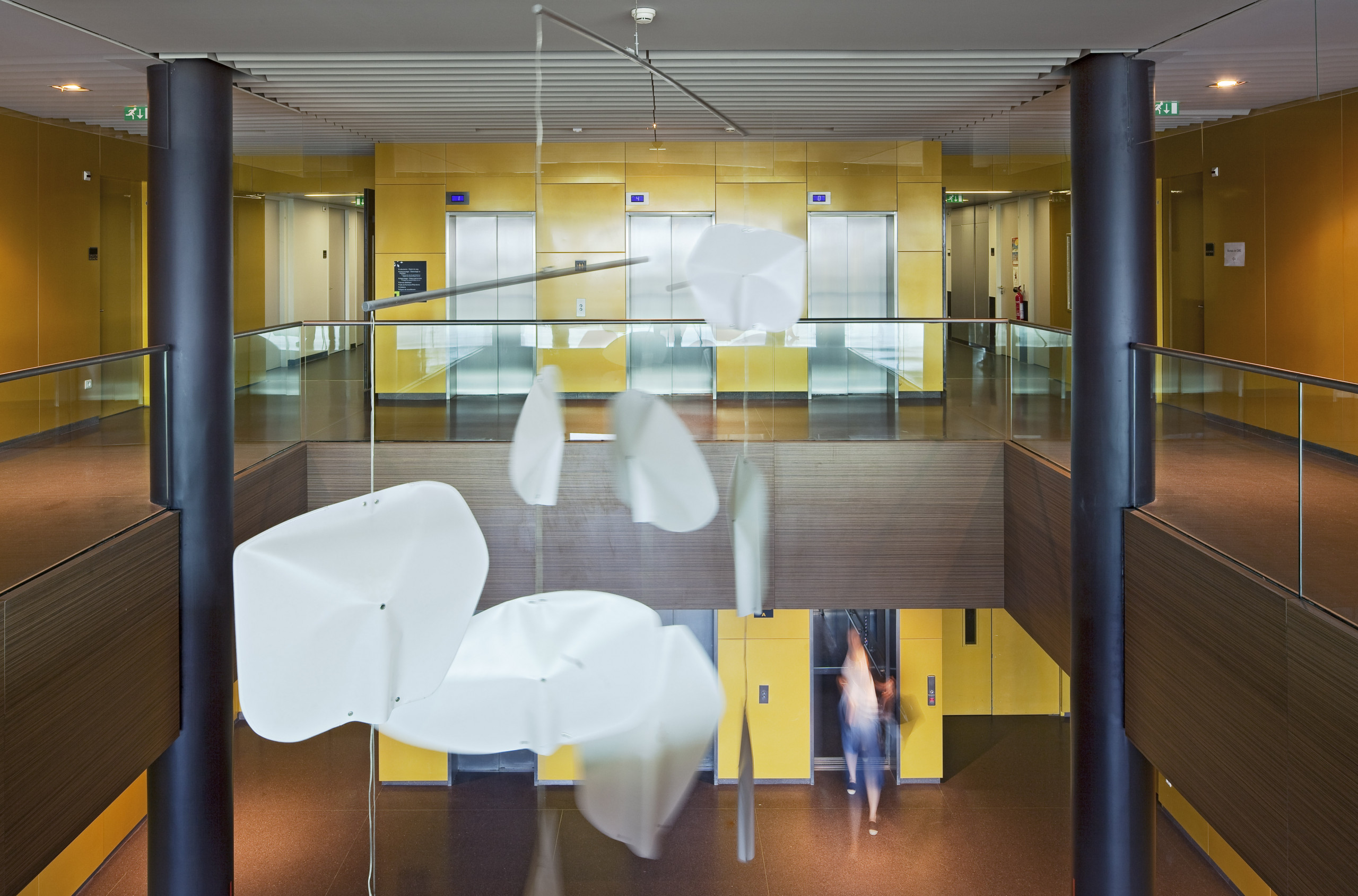Ce monospace compact propose une forme finie, mais qui jamais ne se ferme, laissant des ouvertures, des failles pour des extensions satellitaires, intériorisant ainsi les espaces extérieurs, produisant les modalités d’une imbrication entre le dehors et le dedans. Sa hauteur ne dépasse pas quatre étages pour conserver l’agrément des patios qui apportent lumière et ventilation naturelle. La façade en verre sérigraphié s’orne d’un dessin géométrique en losange, référence au motif de brique vernissée régionale. L’argenture déposée en diagonale s’intensifie en hauteur et sa brillance, comme un miroir sans tain, alterne avec l’opacité du verre noir. Ce contraste d’éléments présents/absents, flous/précis confère au bâtiment une évanescence qui le dématérialise et l’allège. À l’intérieur du bâtiment, l’ambiance est inversée, les façades des patios se parent d’une peau (béton de résine) au ton de terre cuite prodiguant une lumière rosée.