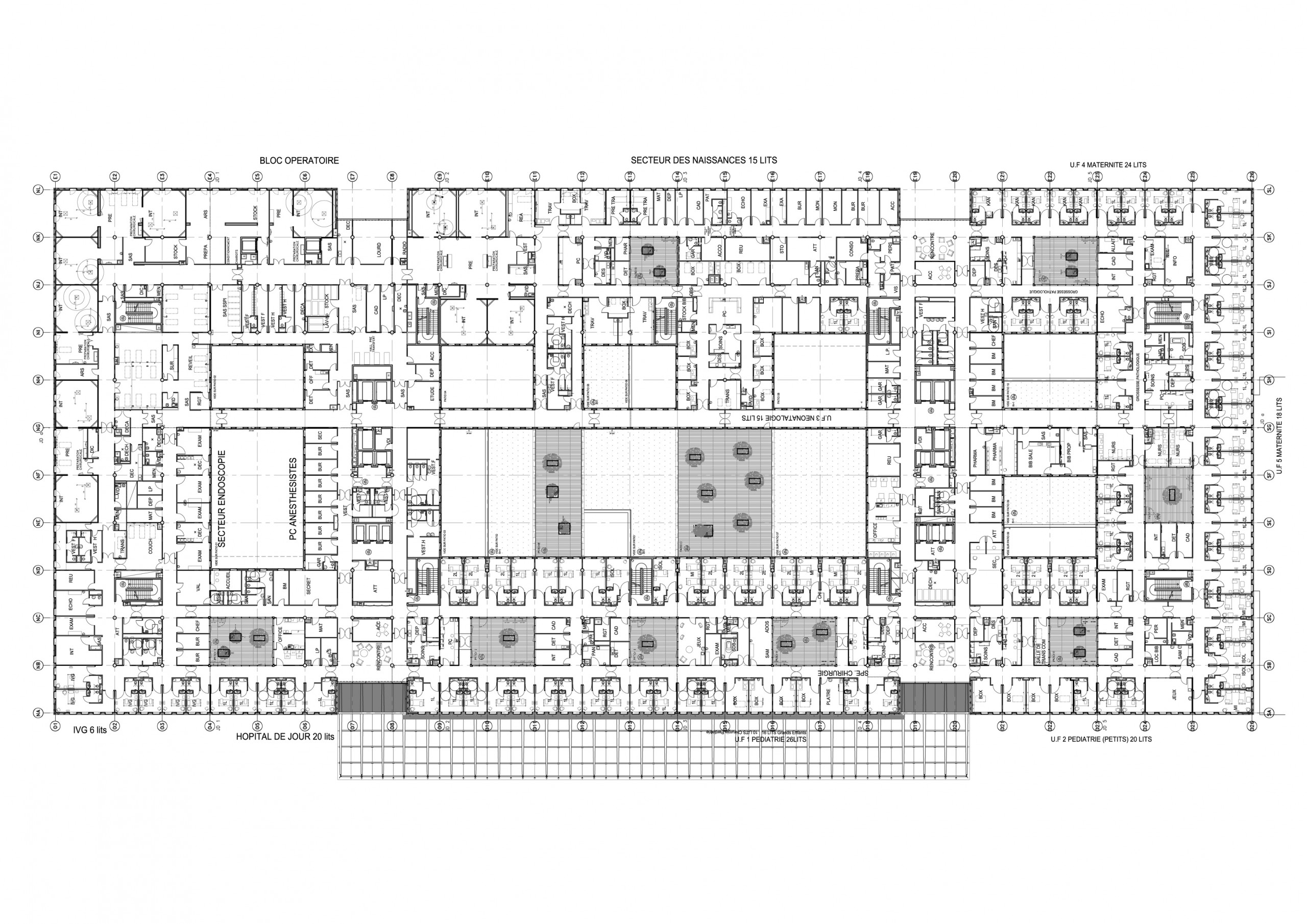 Médecine chirurgie obstétrique, plateau technique complet, bloc opératoire, imagerie, secteur naissance, hémodialyse 24 postes, chirurgie osseuse et 40 000 m² d’espaces extérieurs.