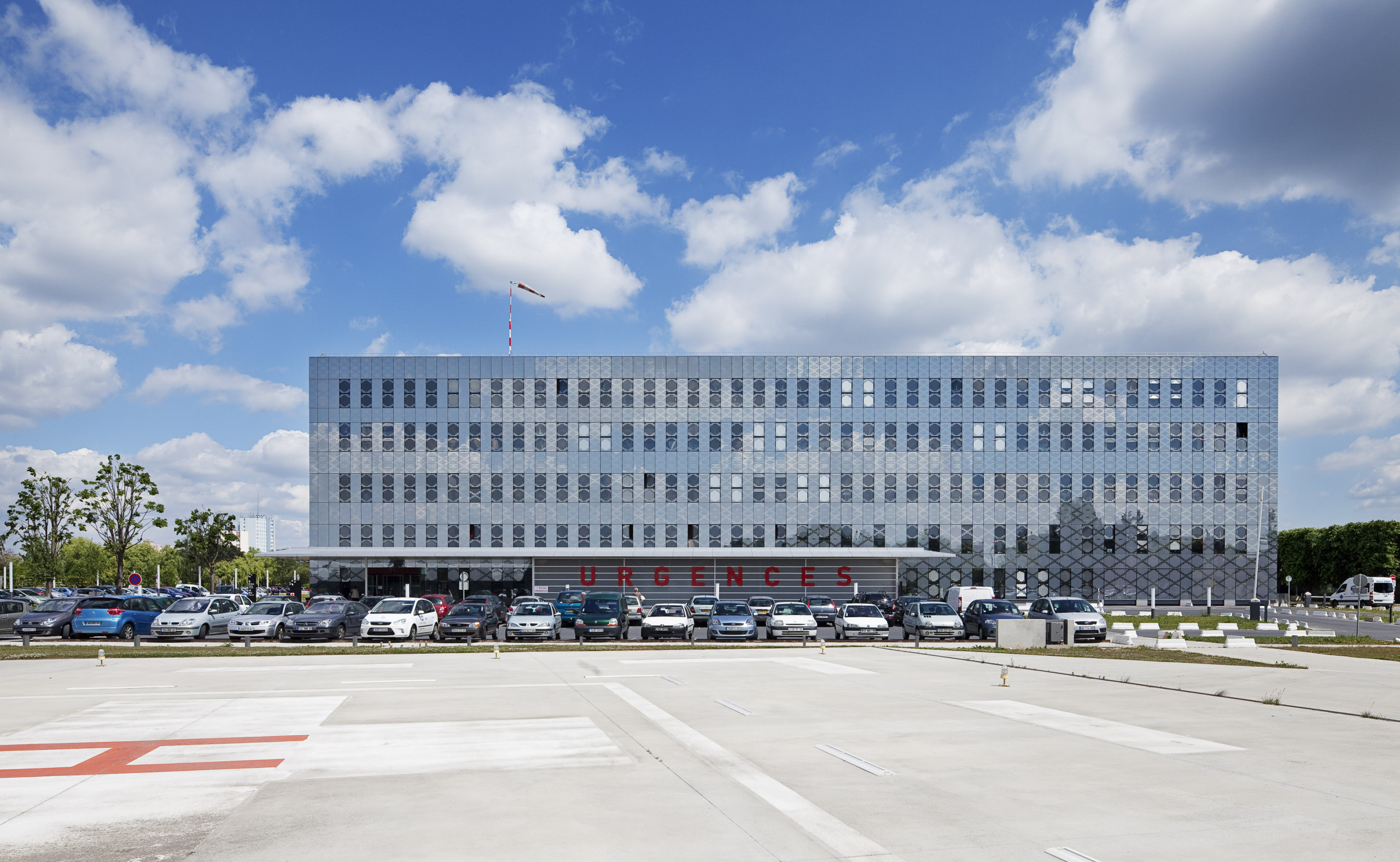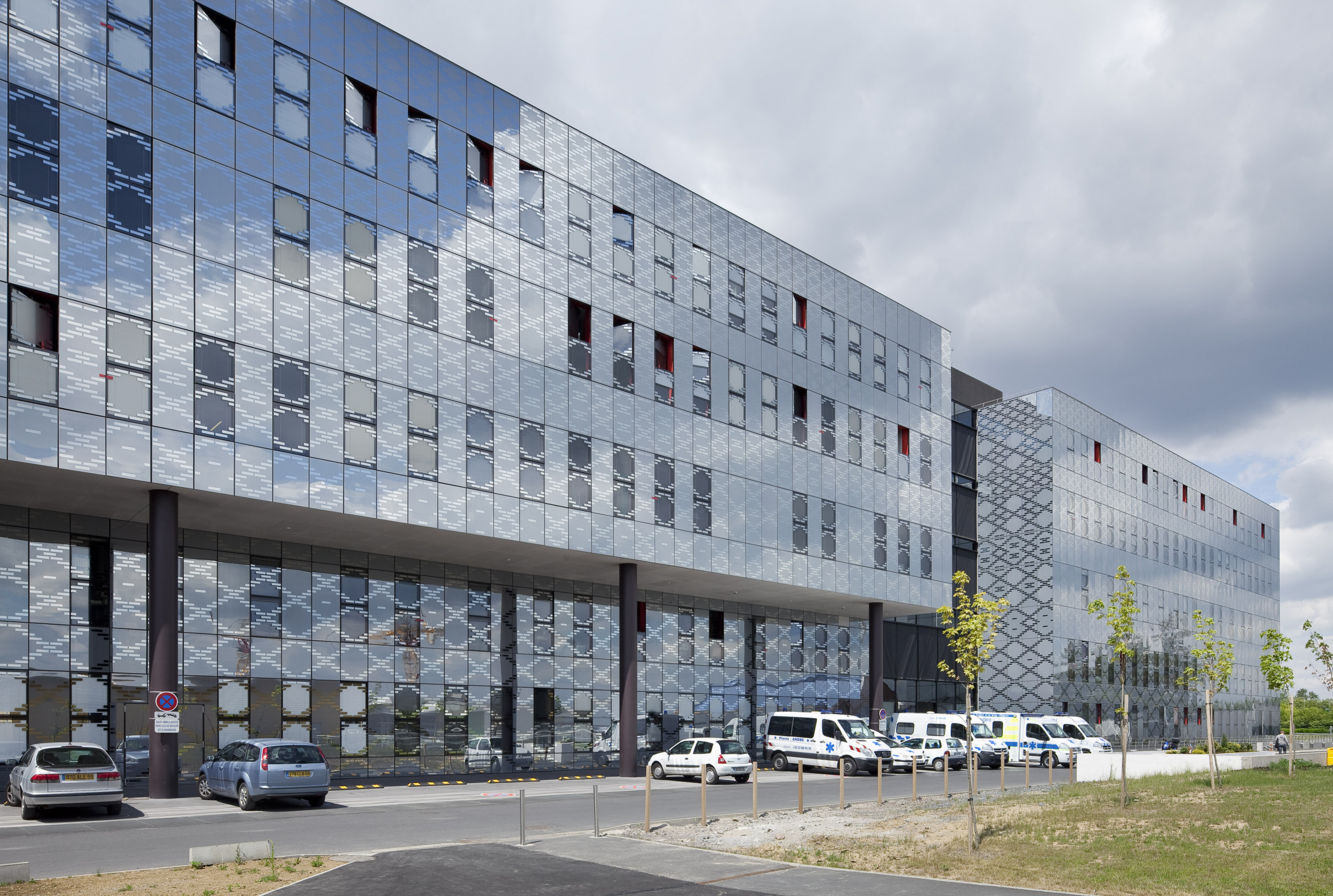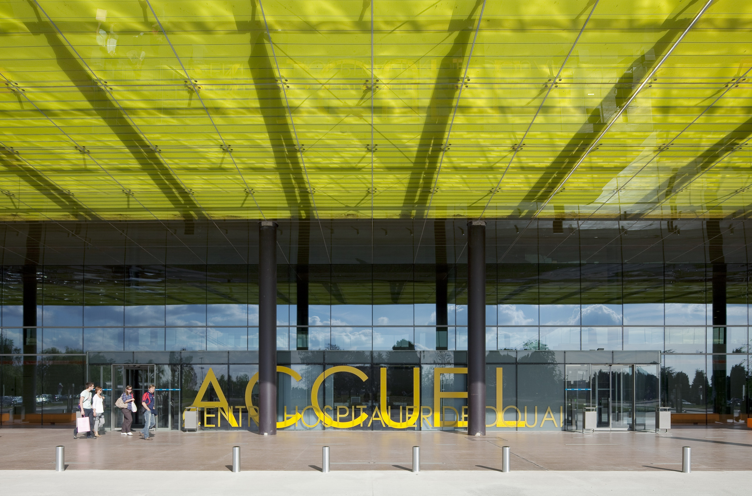 En limite de ville, le Centre Hospitalier de Douai, aux imposantes dimensions (180 m × 80 m), se campe comme un palais hospitalier entre ville et campagne. Pour valoriser l’environnement et mettre le patient en condition, le parc réaménagé suggère l’allée du château. Cet axe renforce la symétrie du bâtiment et la centralité de son implantation. Il conduit vers un parvis d’accueil traité comme un espace urbain à part entière, avec tous les équipements nécessaires : dépose-minute, abri vélos, totems d’information, éclairages au sol, bancs, bornes chauffantes, projections vidéo sur la façade du hall, etc. Ce lieu de transition entre le dehors et le dedans est protégé des intempéries par un large auvent suspendu, vitré, revêtu d’une sérigraphie réfléchissante et colorée dont le motif reflète le jardin et l’activité du parvis.