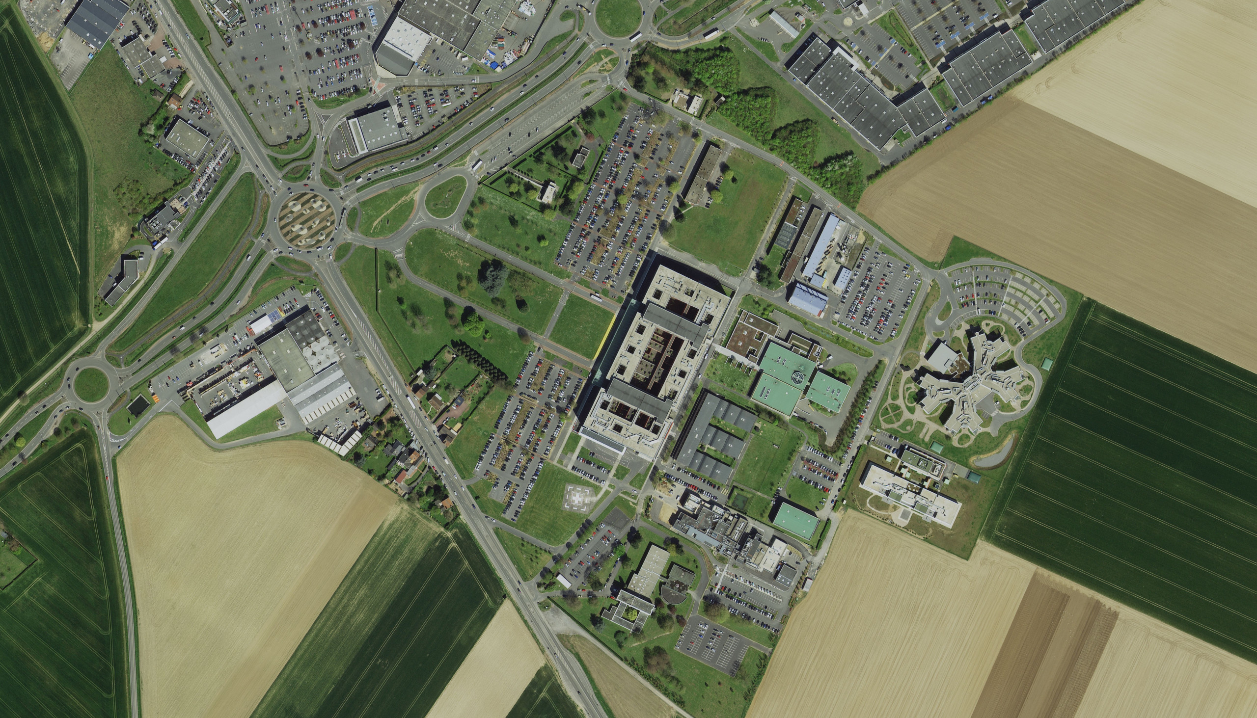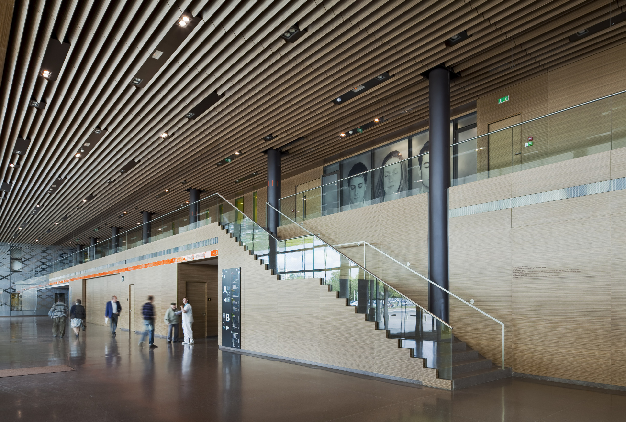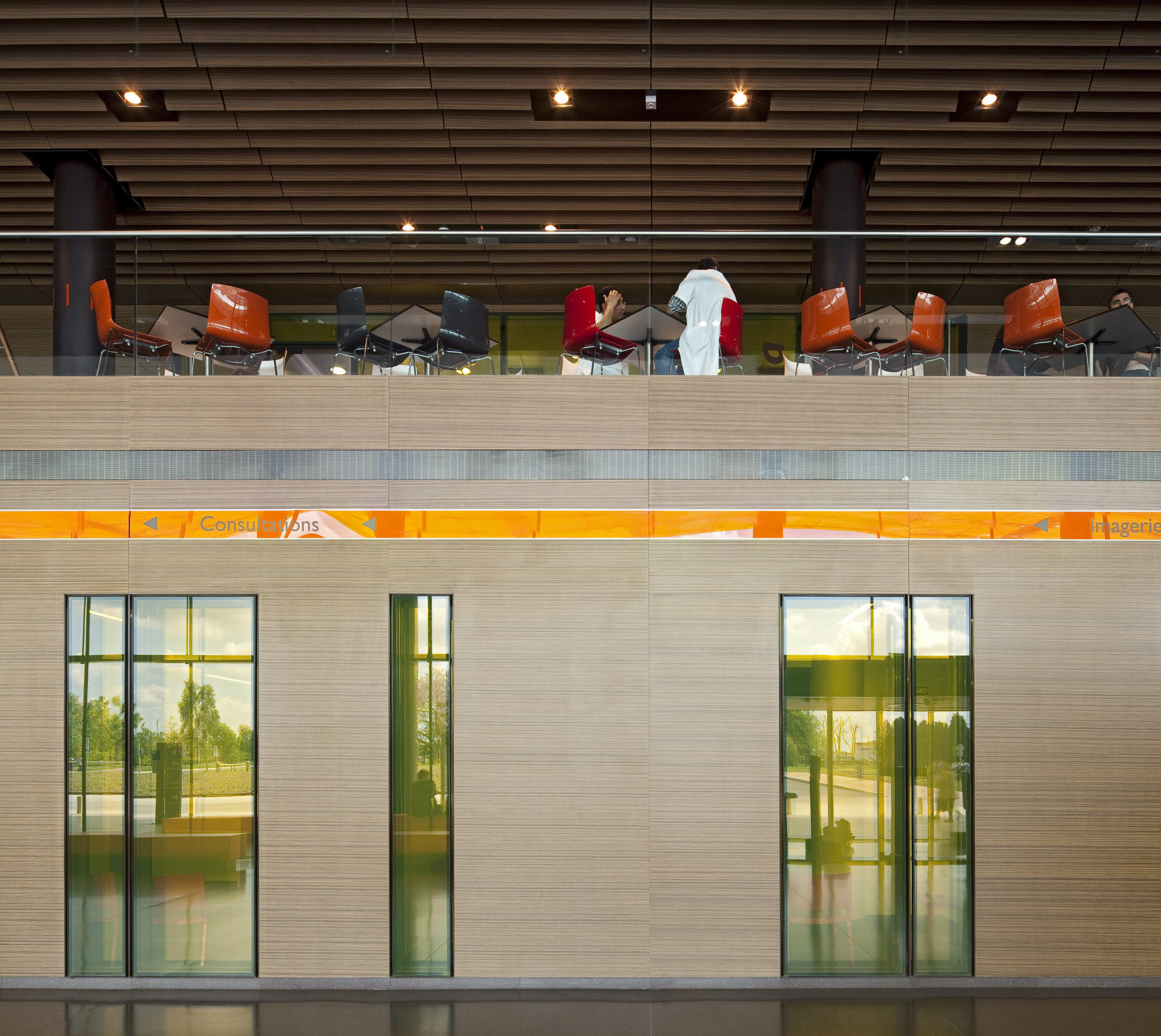 En limite de ville, le Centre Hospitalier de Douai, aux imposantes dimensions (180 m × 80 m), se campe comme un palais hospitalier entre ville et campagne. Pour valoriser l’environnement et mettre le patient en condition, le parc réaménagé suggère l’allée du château. Cet axe renforce la symétrie du bâtiment et la centralité de son implantation. Il conduit vers un parvis d’accueil traité comme un espace urbain à part entière, avec tous les équipements nécessaires : dépose-minute, abri vélos, totems d’information, éclairages au sol, bancs, bornes chauffantes, projections vidéo sur la façade du hall, etc. Ce lieu de transition entre le dehors et le dedans est protégé des intempéries par un large auvent suspendu, vitré, revêtu d’une sérigraphie réfléchissante et colorée dont le motif reflète le jardin et l’activité du parvis.