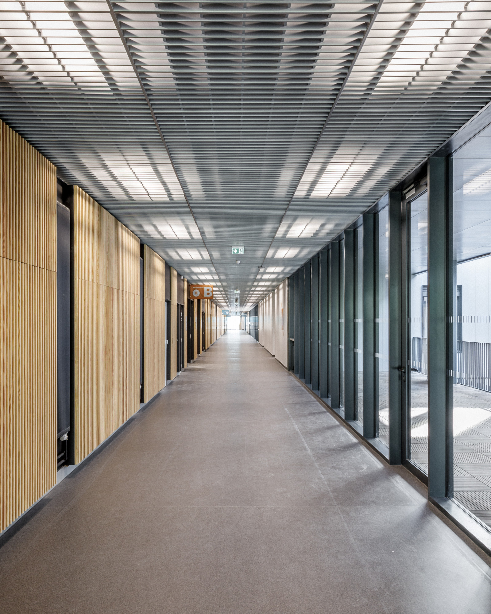 Les nombreux patios apportent de la lumière au cœur du bâtiment. Leurs façades sont percées de grandes fenêtres qui contribuent aussi à la flexibilité. À l’opposé du relief de la façade extérieure, ici le bardage est en acier à la finition lisse assurant une ambiance apaisante. Les patios sont plantés et les terrasses végétalisées. La rue intérieure, au rez-de-chaussée, qui relie l’entrée principale et l’entrée secondaire, est scandée par les patios. Elle s’ouvre sur des loggias accessibles. Face à la cafétéria, la rue s’ouvre sur la grande terrasse du patio principal.