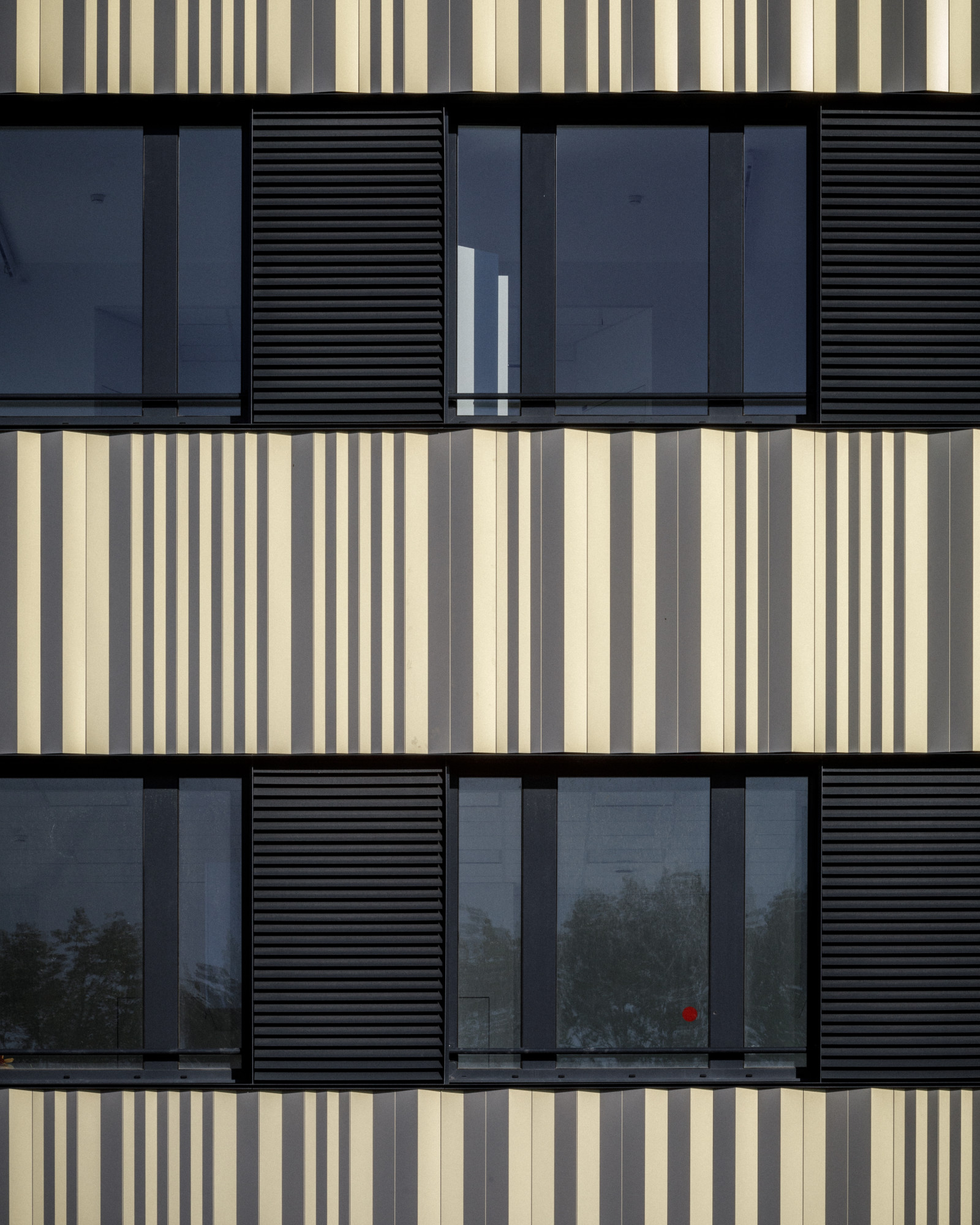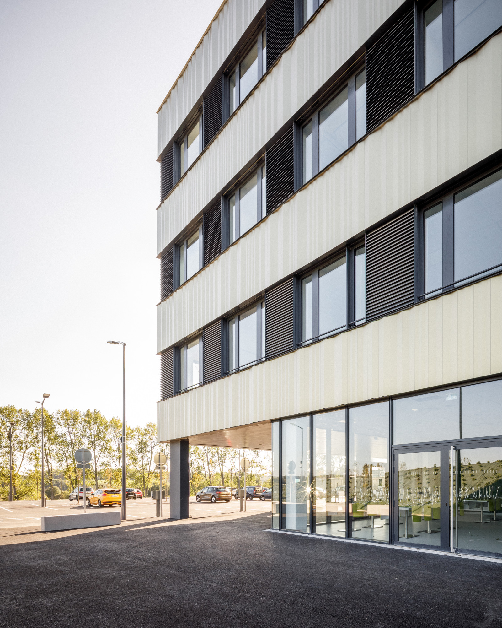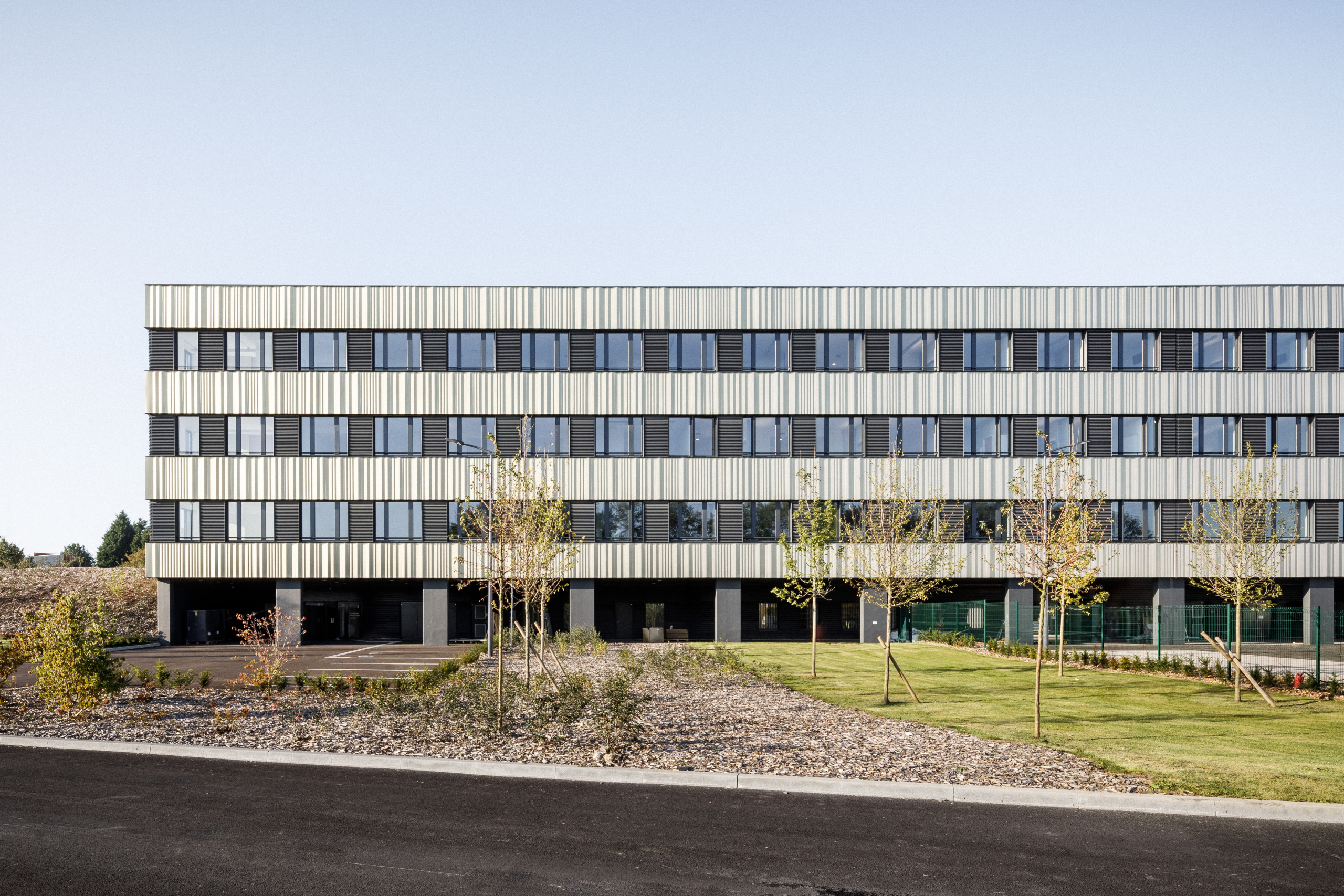 La façade est le reflet de cette simplicité formelle. Elle alterne parties pleines et parties vitrées aux dimensions équivalentes. Les bandeaux ainsi formés permettent une grande flexibilité. Ils offrent la possibilité de modifier le cloisonnement et d’obtenir une grande permutabilité des locaux. Les parties pleines sont revêtues d’acier plié avec une longueur d’onde variée, dans une gamme harmonique. Revêtu d’une peinture iridescente qui a la propriété de prendre une teinte différente en fonction de l’orientation et de la lumière, ce bardage confère à la façade une vibration changeante au cours de la journée. Ce matériau assure aussi la pérennité des façades. La pliure verticale est dans le sens de l’écoulement des eaux et ne retient pas les salissures, poussières et feuilles d’arbres.