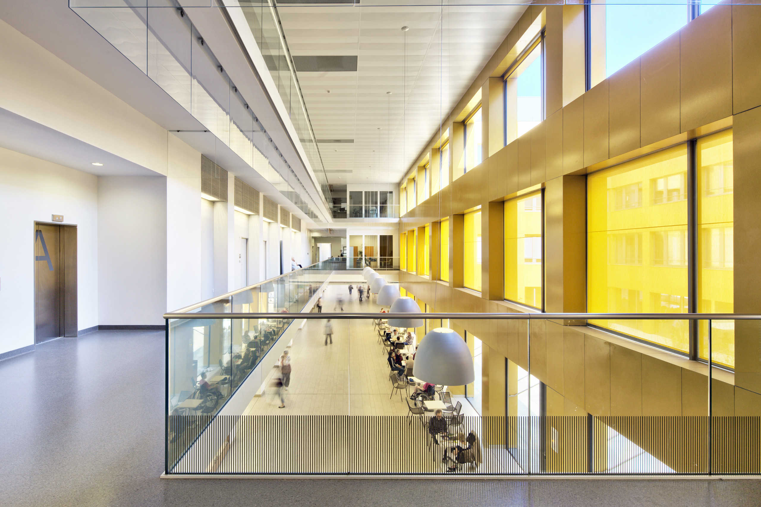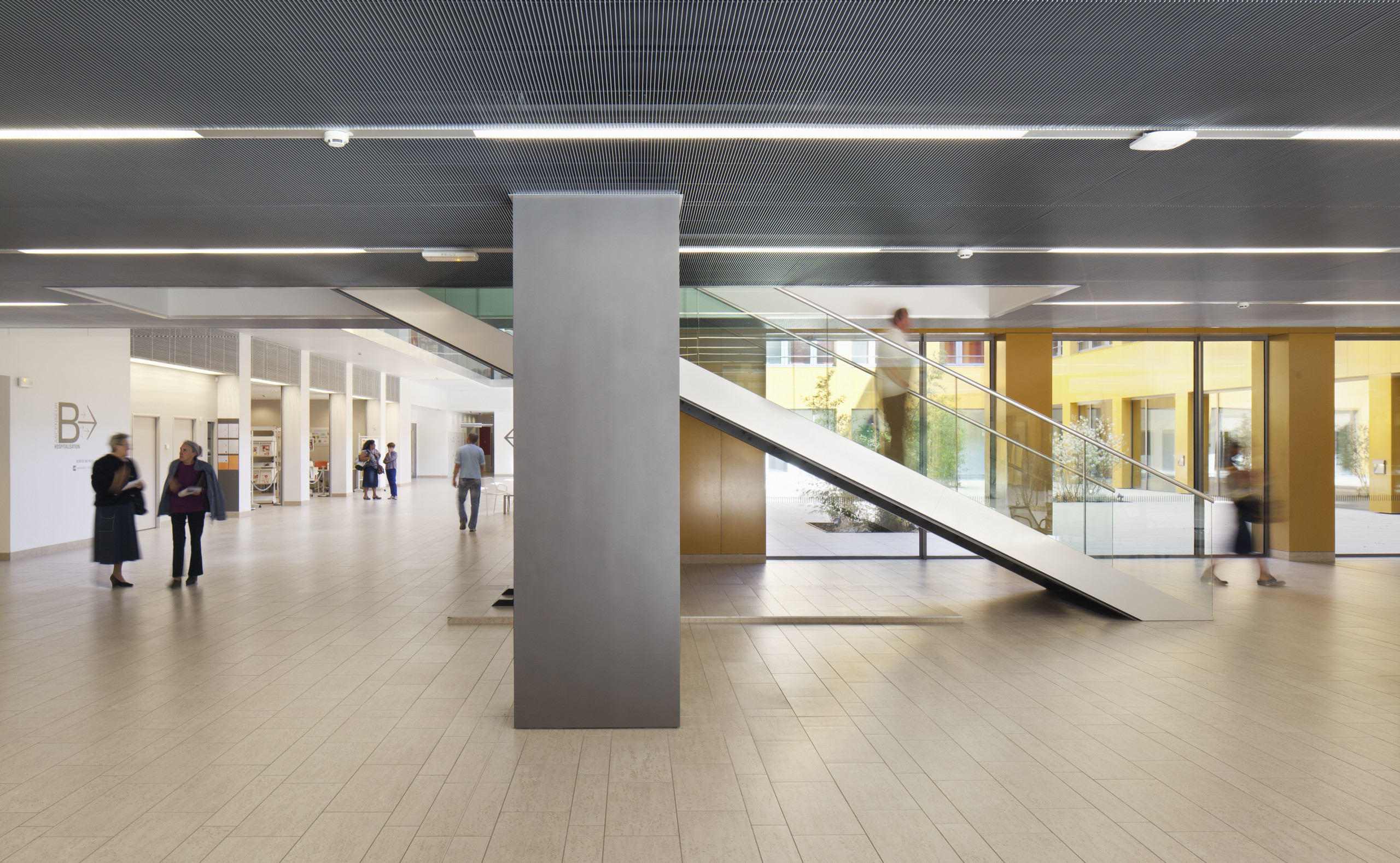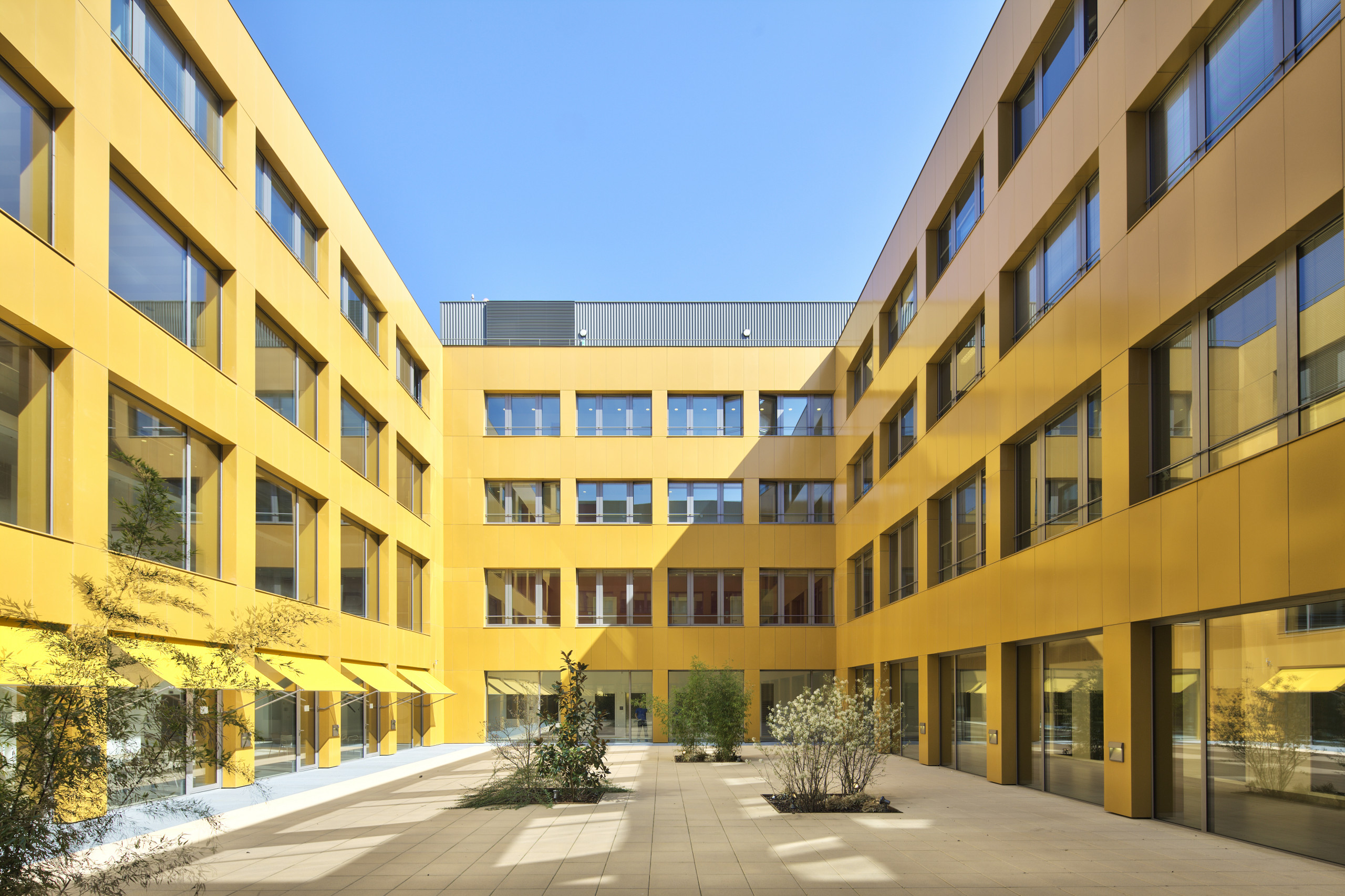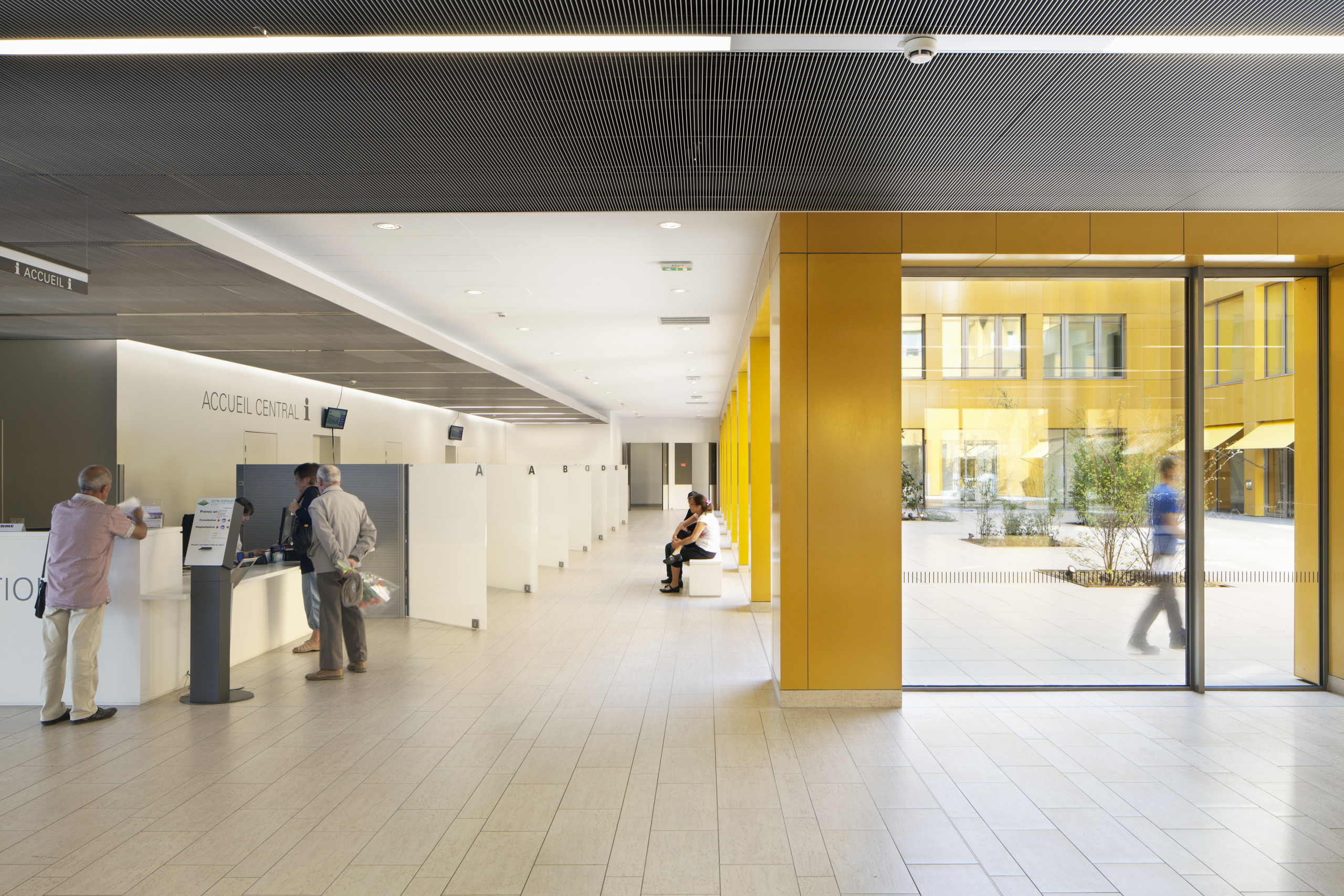 En façade, un subtil jeu de pixellisation fait référence aux motifs géométriques des toitures bourguignonnes en tuiles vernissées. Ce « all-over » qui décline un camaïeu de tons gris-vert permet d’oublier la notion de percement pour n’offrir à voir qu’une peau unitaire et diaprée. Une fois le seuil franchi, les couleurs froides de la façade périphérique laissent place à une lumière chaude et caressante renvoyée par les façades aux teintes jaune orangé des patios. Des couleurs chaudes qui se retrouvent aussi dans le traitement des espaces intérieurs et la signalétique.