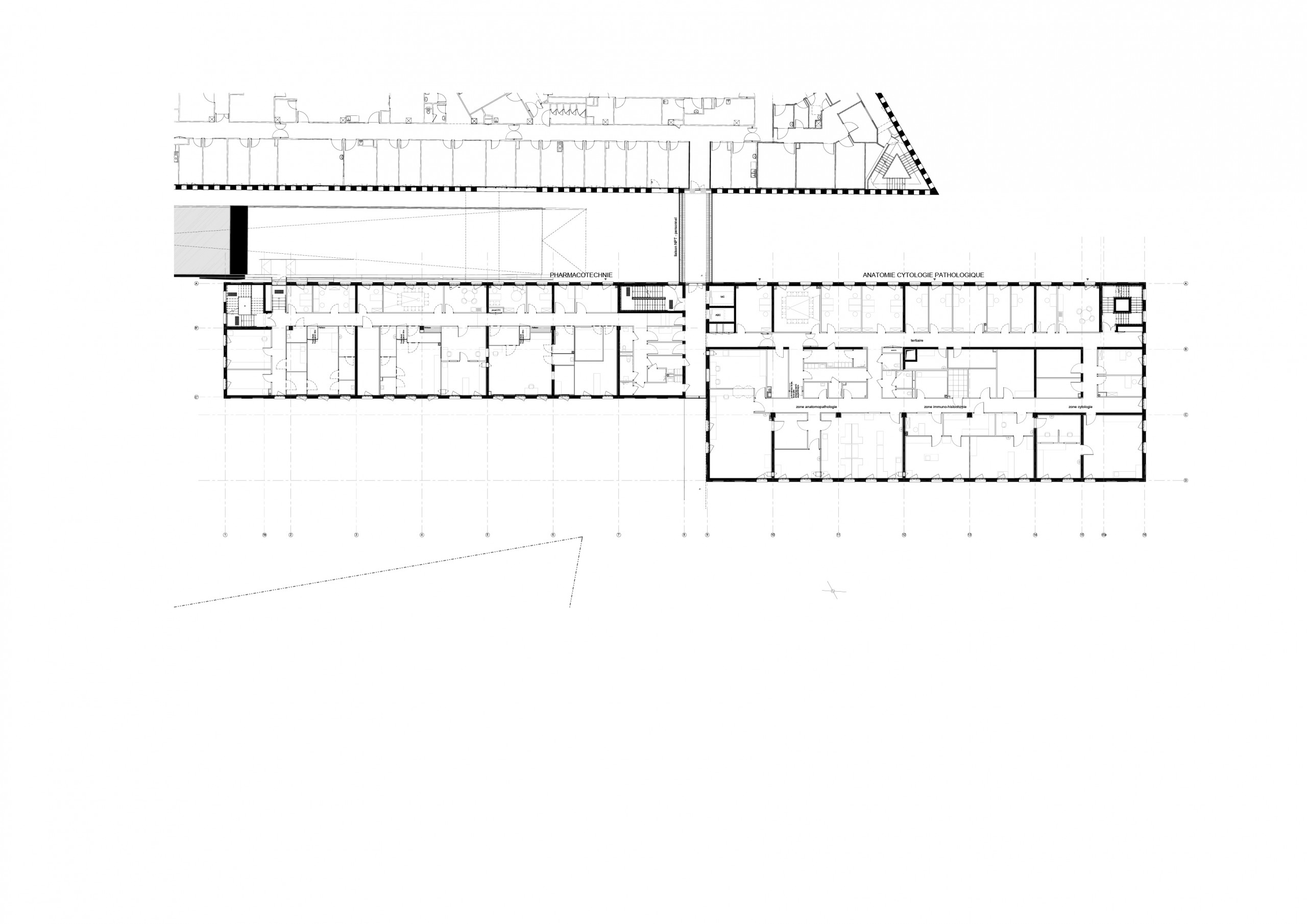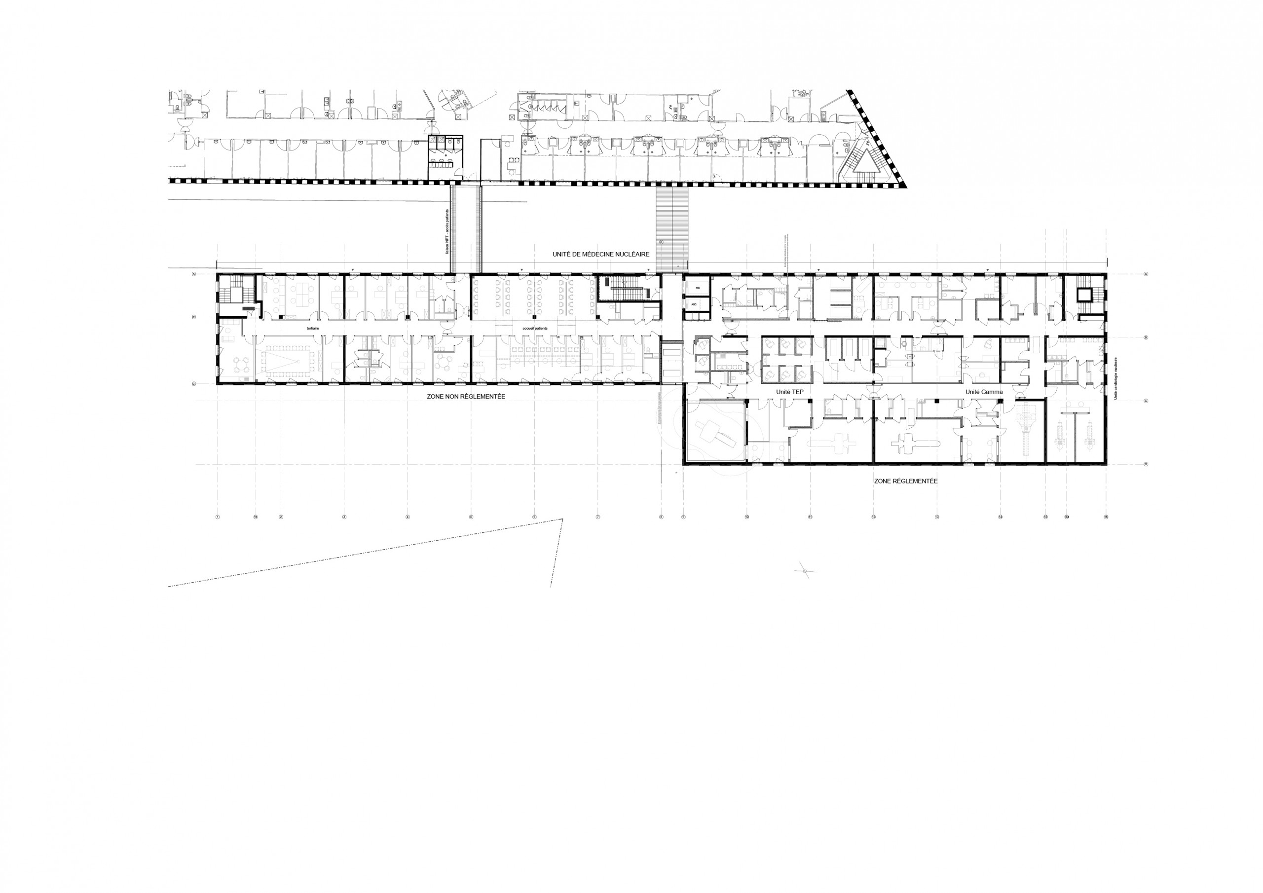 Le bâtiment principal – dit NPT – par sa taille, sa massivité, et la pureté de sa forme, s’impose sur le site comme un objet élémentaire : bien qu’étant le plus récent des bâtiments du site hospitalier, c’est bien lui qui en forge la nouvelle identité, et qui en constitue la nouvelle grammaire. Le projet prend acte de ce précédent : il se veut un satellite qui ne cherche ni à rivaliser avec son «vaisseau-mère» ni à singer artificiellement son écriture. Au contraire, il poursuit la démarche entreprise pour le NPT en en reprenant les éléments structurants : régularité de la forme et de la façade, verticalité des percements, affirmation d’une esthétique minérale.