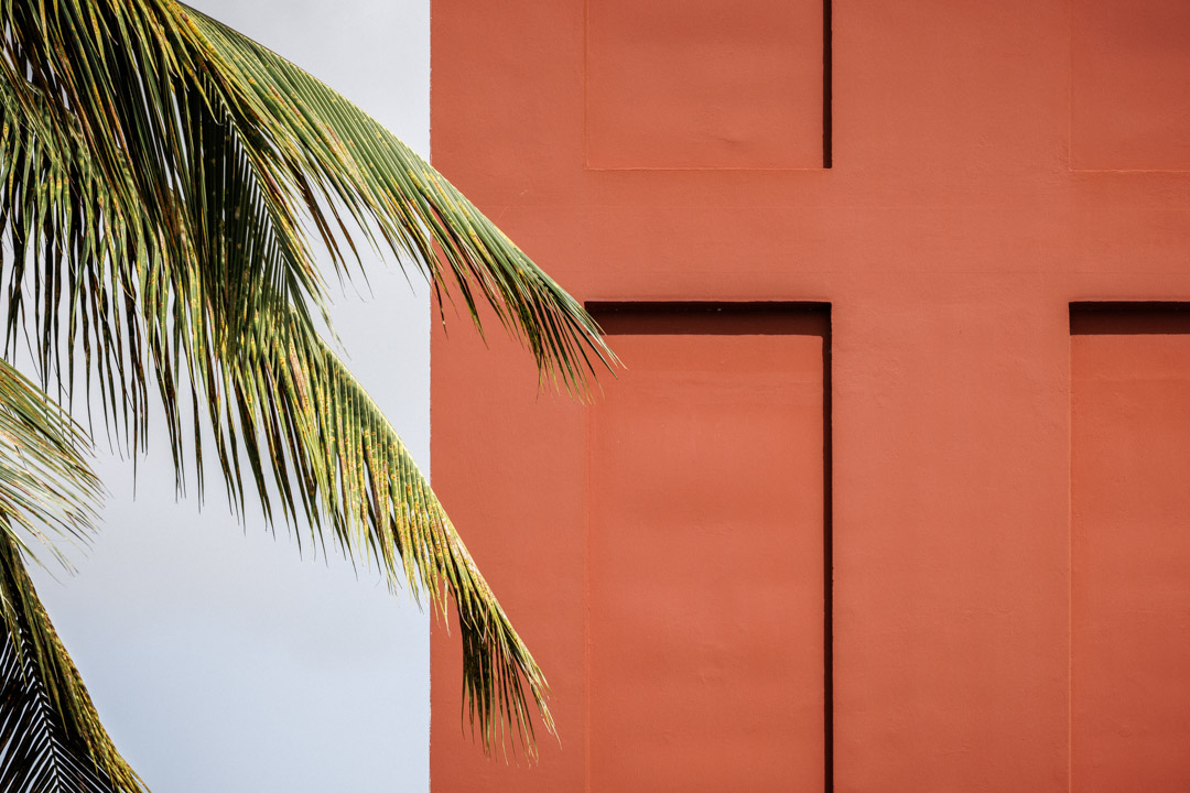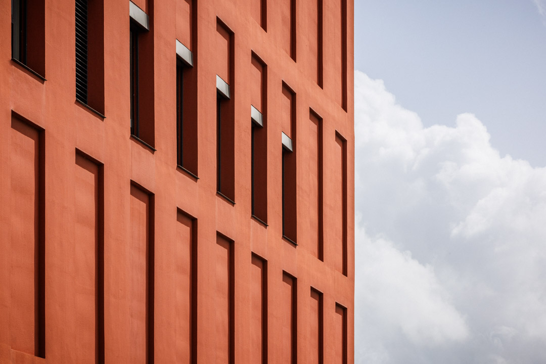 Mais le projet tient compte des contraintes spécifiques du programme et du site, conduisant à proposer des variations sur le thème initial : dédoublement de la trame qui renforce l’effet de perspective et variation de teinte, du jaune au rouge. Vus côte à côte, les deux bâtiments forment un ensemble tellurique dont les variations de teintes se donnent à lire comme autant de déclinaisons sur le thème de la terre volcanique de l’île d’Aimé Césaire.