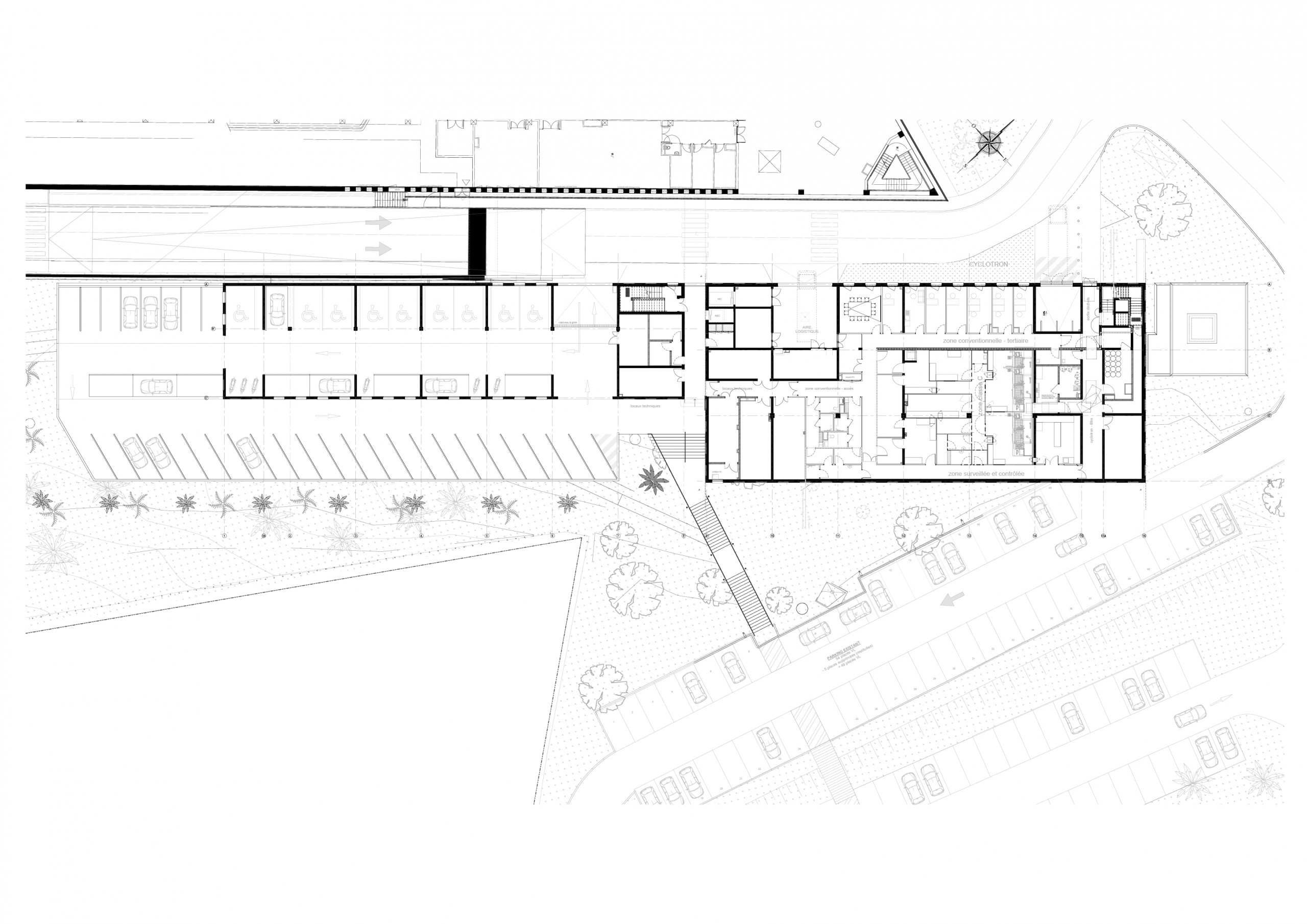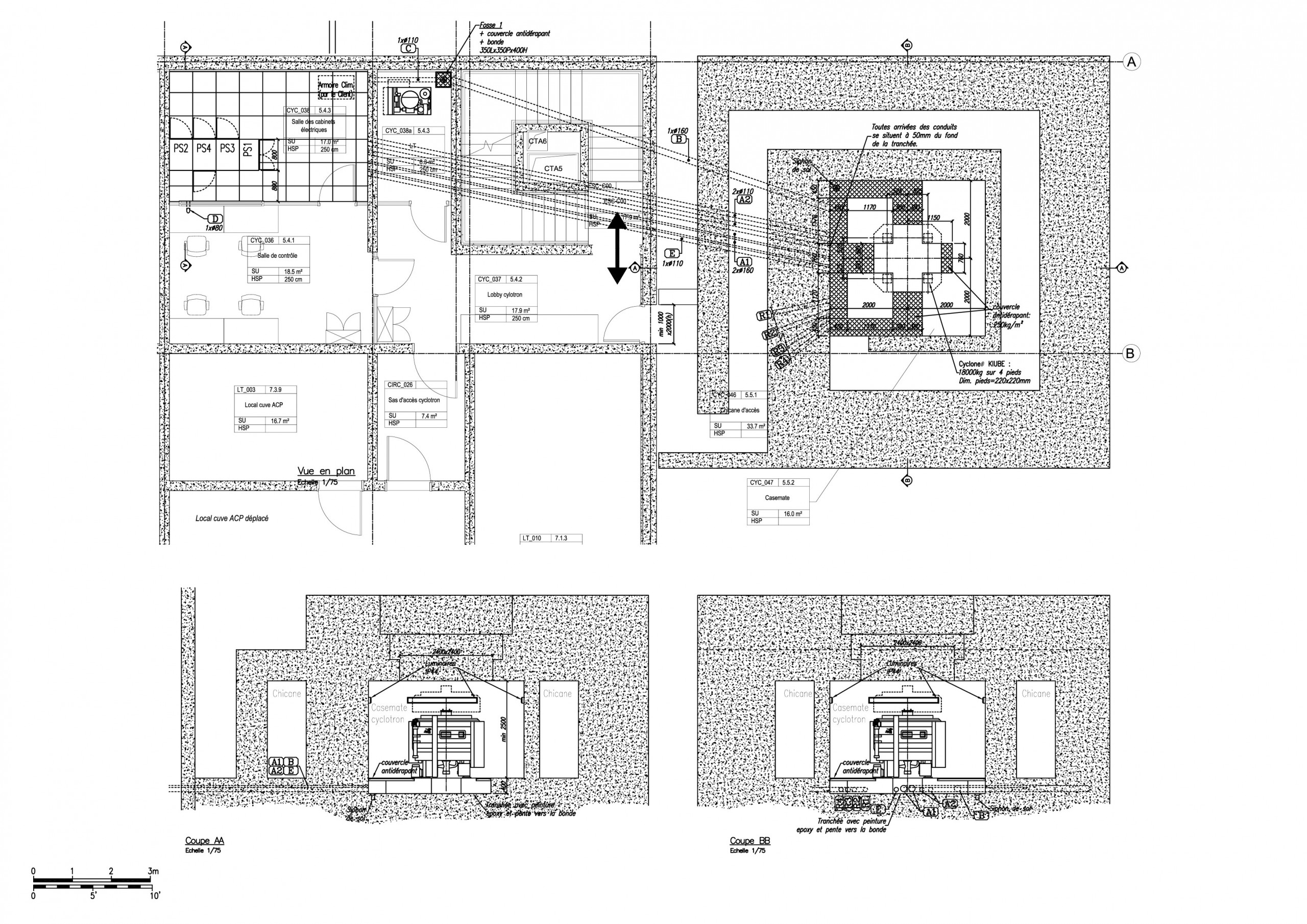 Le site est marqué par une forte dénivellation du Nord-Ouest au Sud-Est. La casemate du cyclotron prend place dans un niveau rez-de-jardin partiel, afin d’atténuer sa présence dans le site : elle émerge partiellement de la pente du terrain, comme un totem de béton bientôt entouré de végétation.