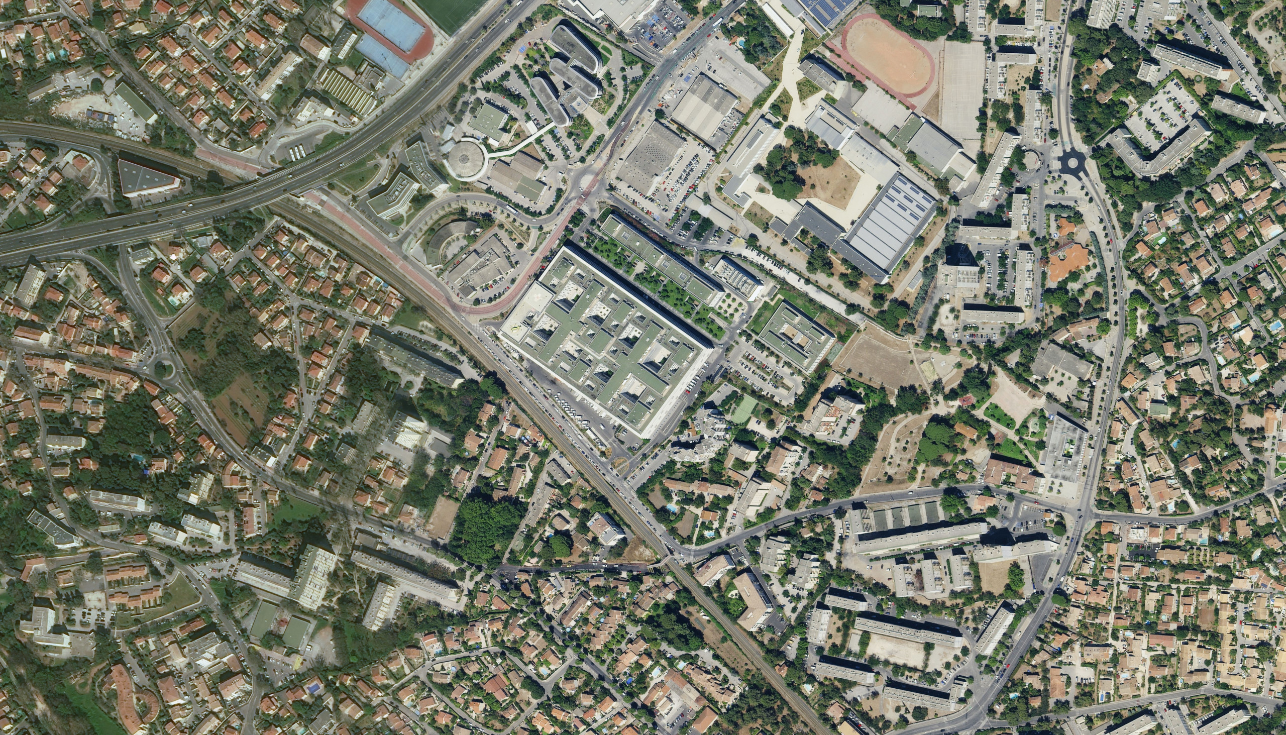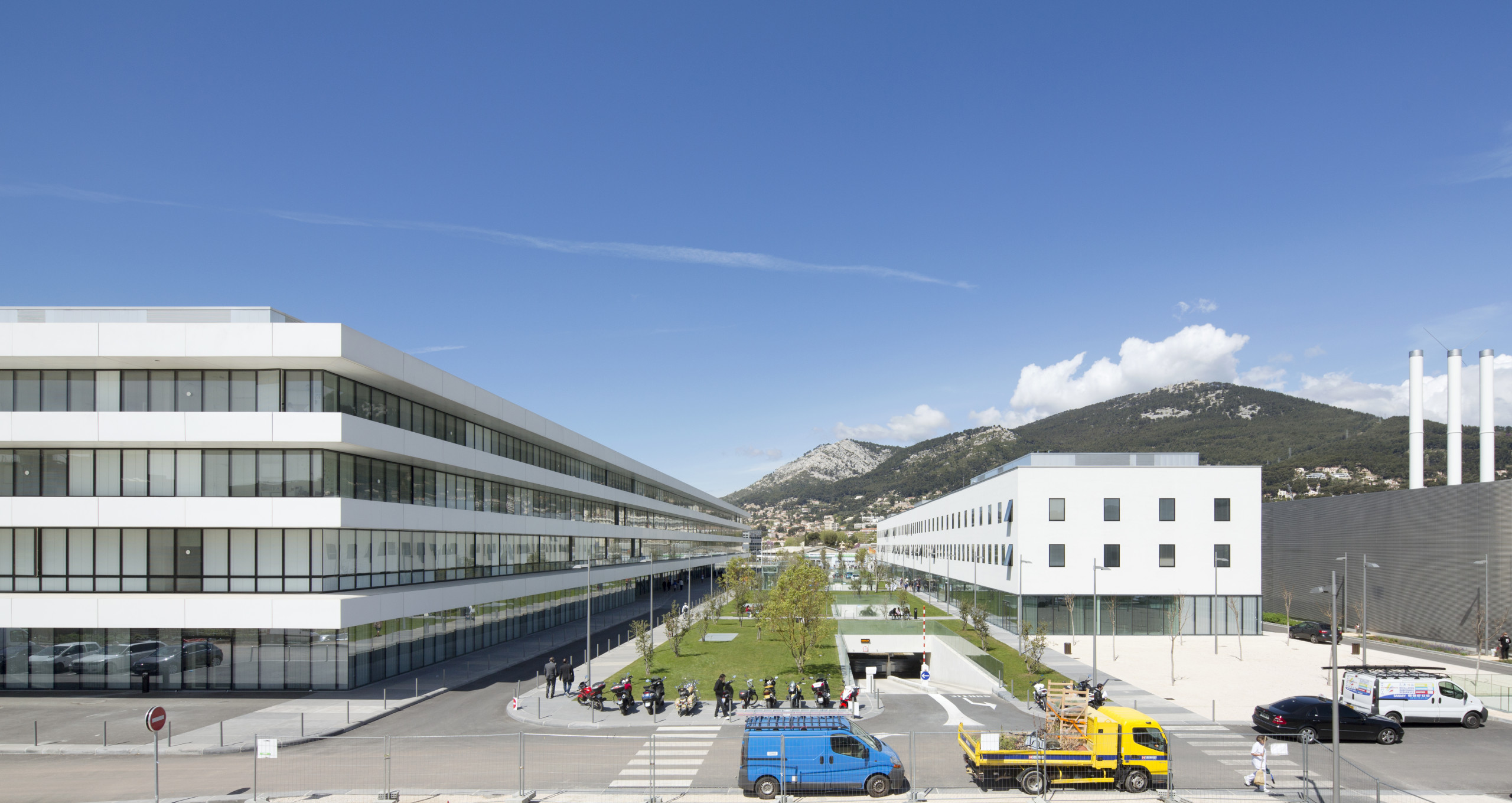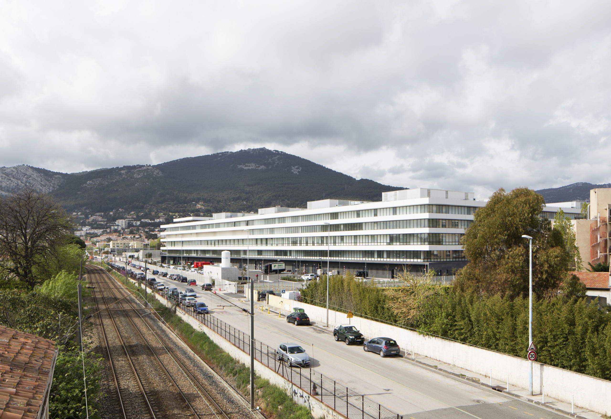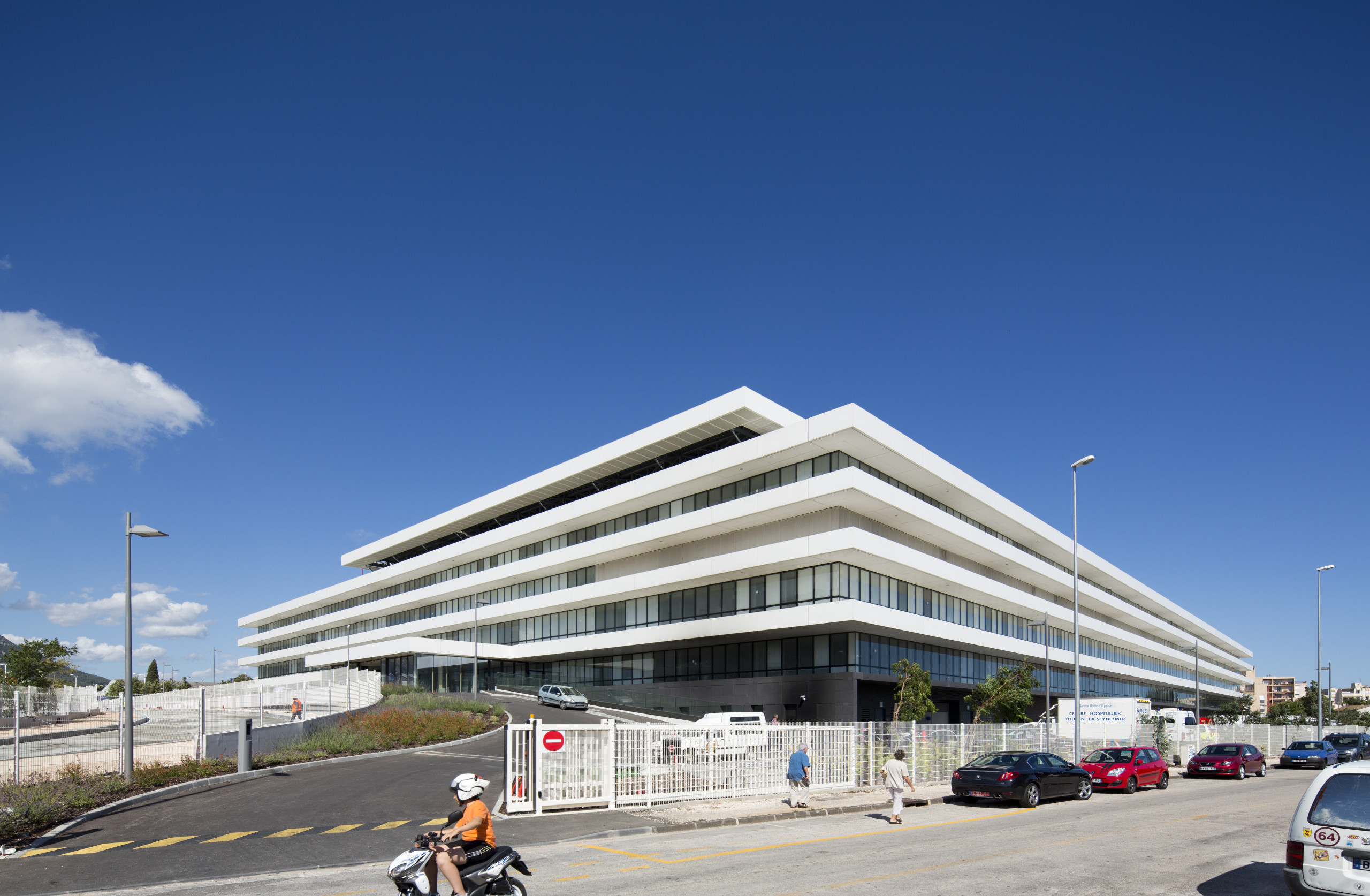 Projet urbain bien que situé à l’entrée est de la ville, en lisière d’un quartier des années 1970 et d’une zone industrielle, l’hôpital Sainte-Musse adopte le parti de « s’étaler » pour mieux se fondre dans son environnement. Il étire ainsi une longue façade urbaine constituée de lignes horizontales épaisses et continues de béton tenant lieu de brise-soleil et, pour les chambres, de cadrages cinématographiques sur le paysage.