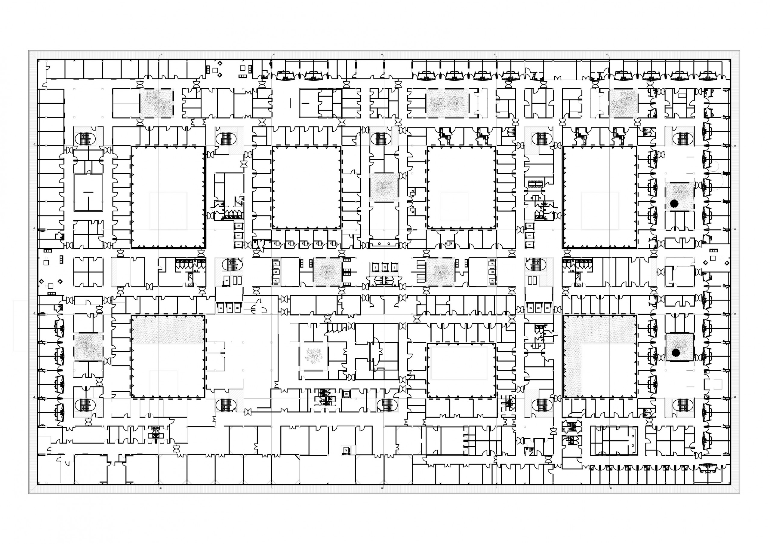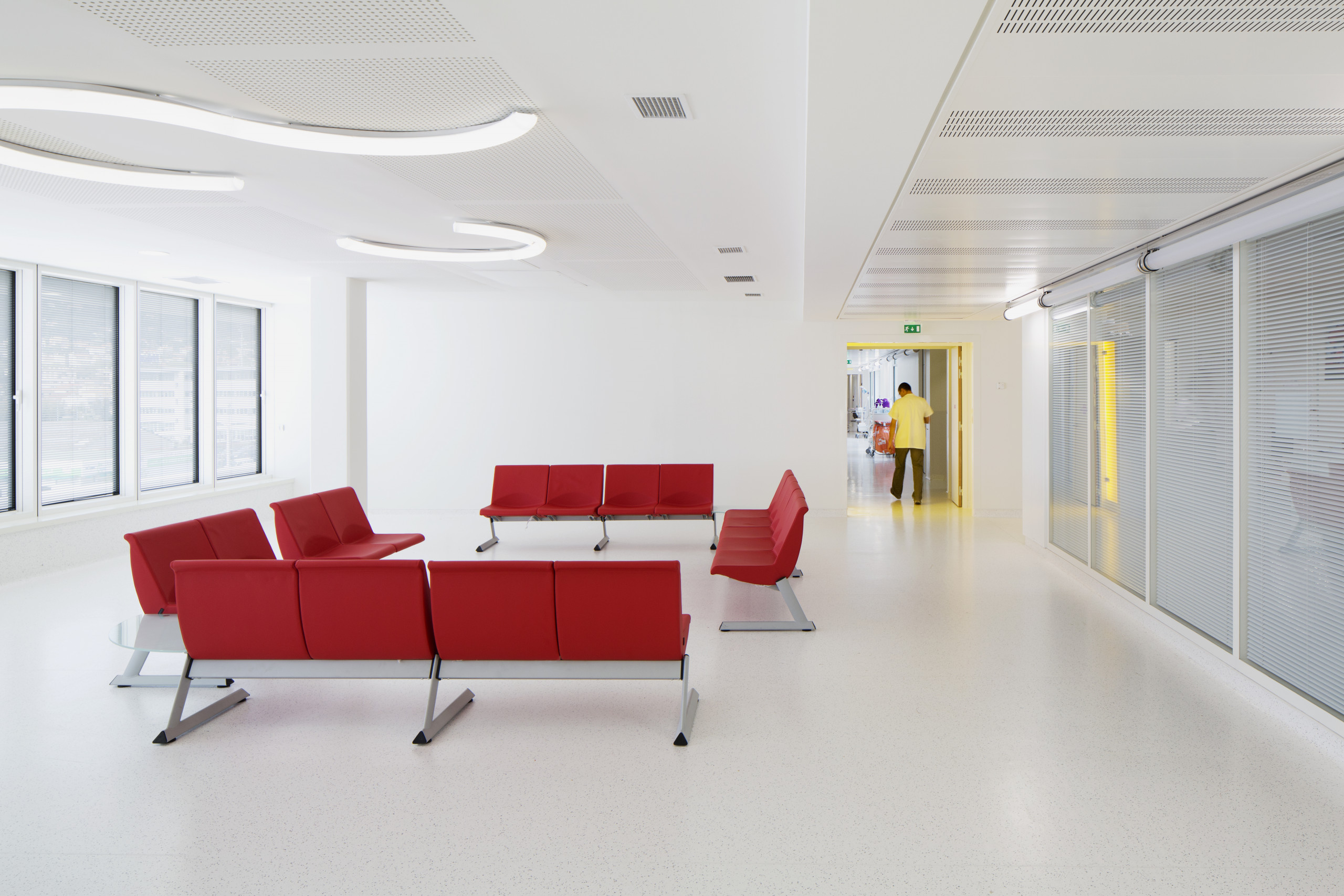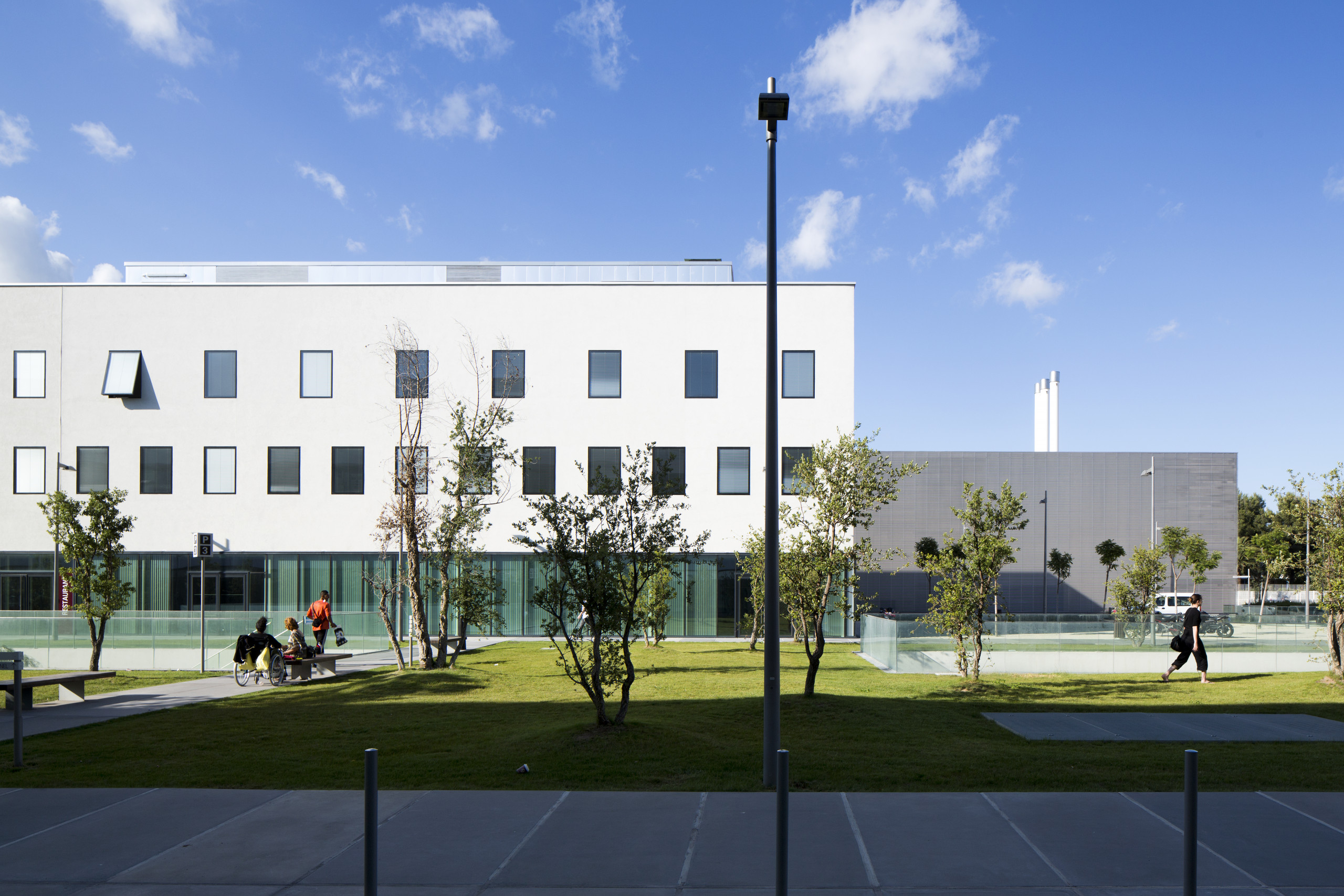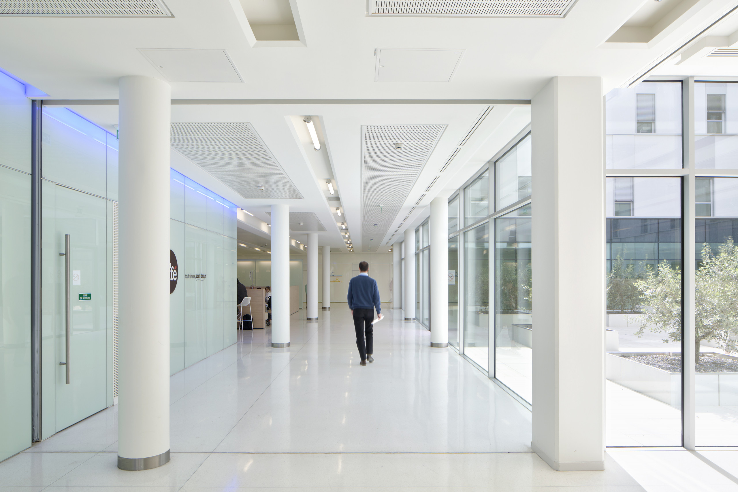 Le bâtiment MCO, le « carré » de psychiatrie et le bâtiment dédié à l’administration trouvent un adressage commun par une grande place linéaire, un généreux mail arboré où se développent terrasses et lieux d’attente, à la manière des ramblas de Barcelone. Il constitue un lieu de transition entre la ville et l’hôpital, un « seuil » hospitalier qui traduit les idées de dignité et de civilité, et diffuse un sentiment de confort et de réconfort.