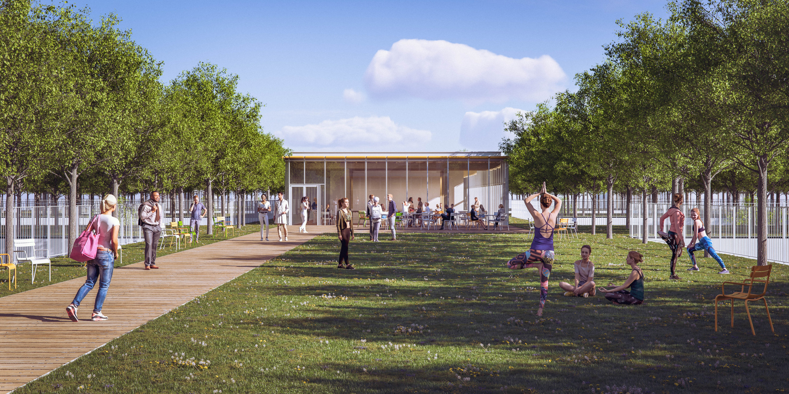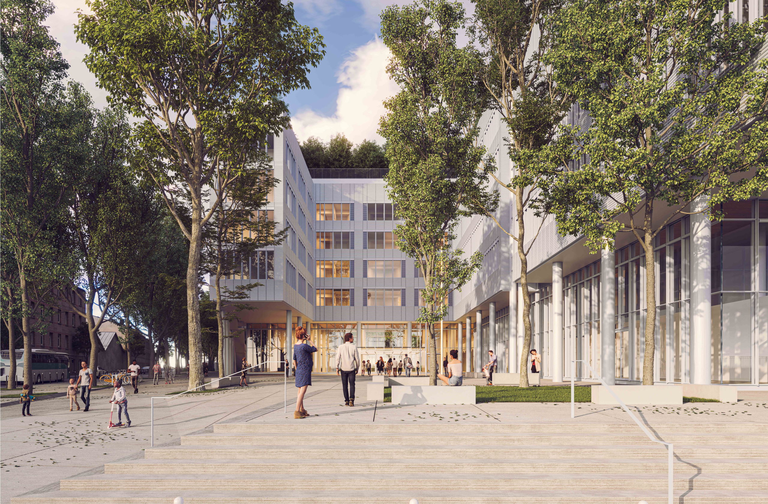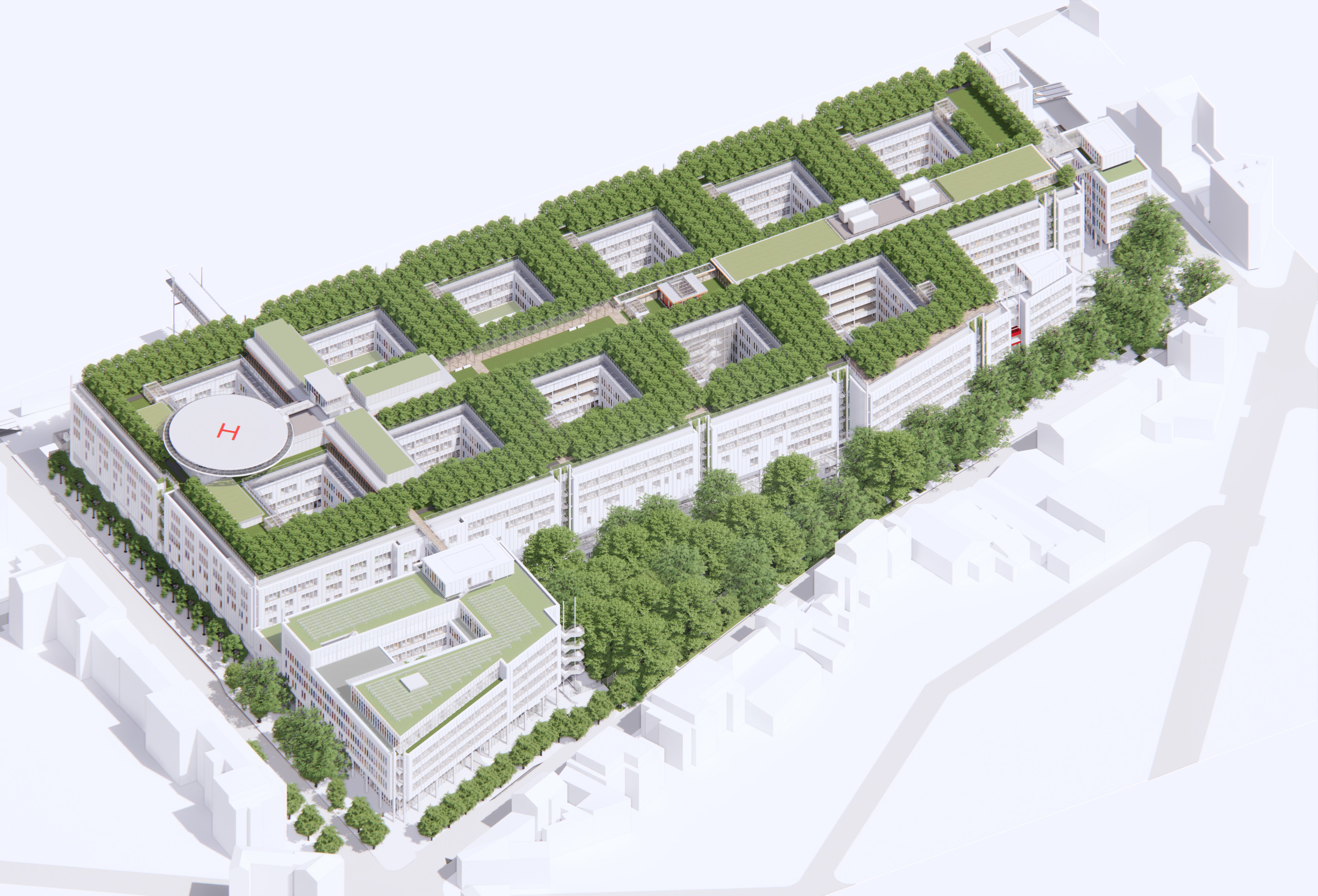 Généreusement ouvert sur la ville, l’hôpital propose un volume clair et identifiable, qui s’érige en repère dans l’espace urbain. L’espace public se prolonge jusqu’à son seuil, offrant une respiration dans le tissu urbain, des lieux de rencontre, d’échange et de calme. Cette proximité visuelle et physique avec une flore abondante, la possibilité de suivre la course du soleil et celle des saisons, offre aux résidents de l’hôpital une formidable allégorie du processus de guérison. Ce cadre de résidence, de travail, ou de simple visite, place le bien-être au centre de l’expérience du soin. La toiture de l’hôpital est un monde à part. Planté de nombreuses espèces végétales et protégé des nuisances de la rue, le jardin qu’elle accueille est un refuge ouvert à tous, soignants, visiteurs et citadins. Accessible depuis l’hôpital comme depuis la ville, il est un promontoire qui surplombe les bâtiments alentour et procure une vue dégagée sur l’horizon.