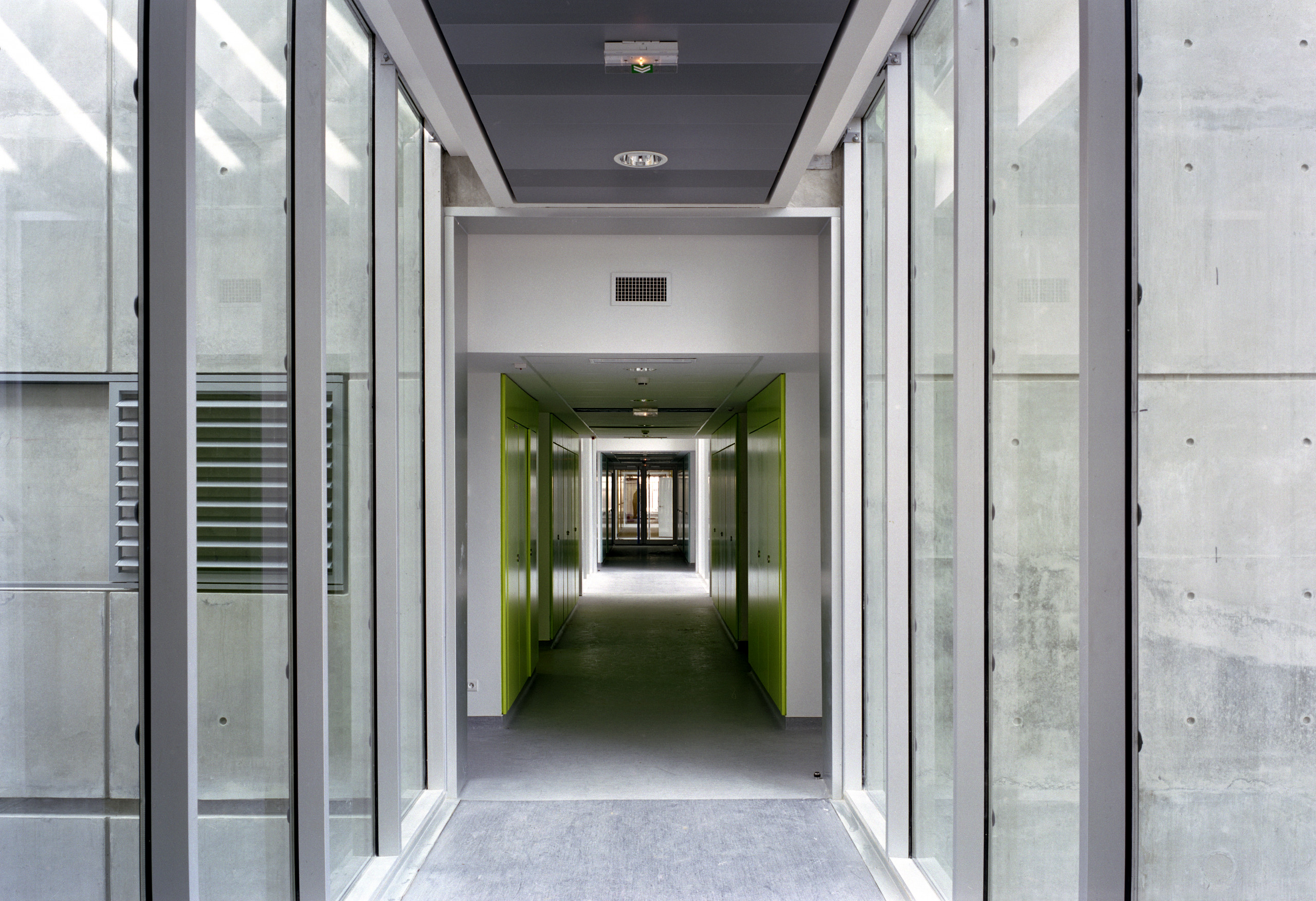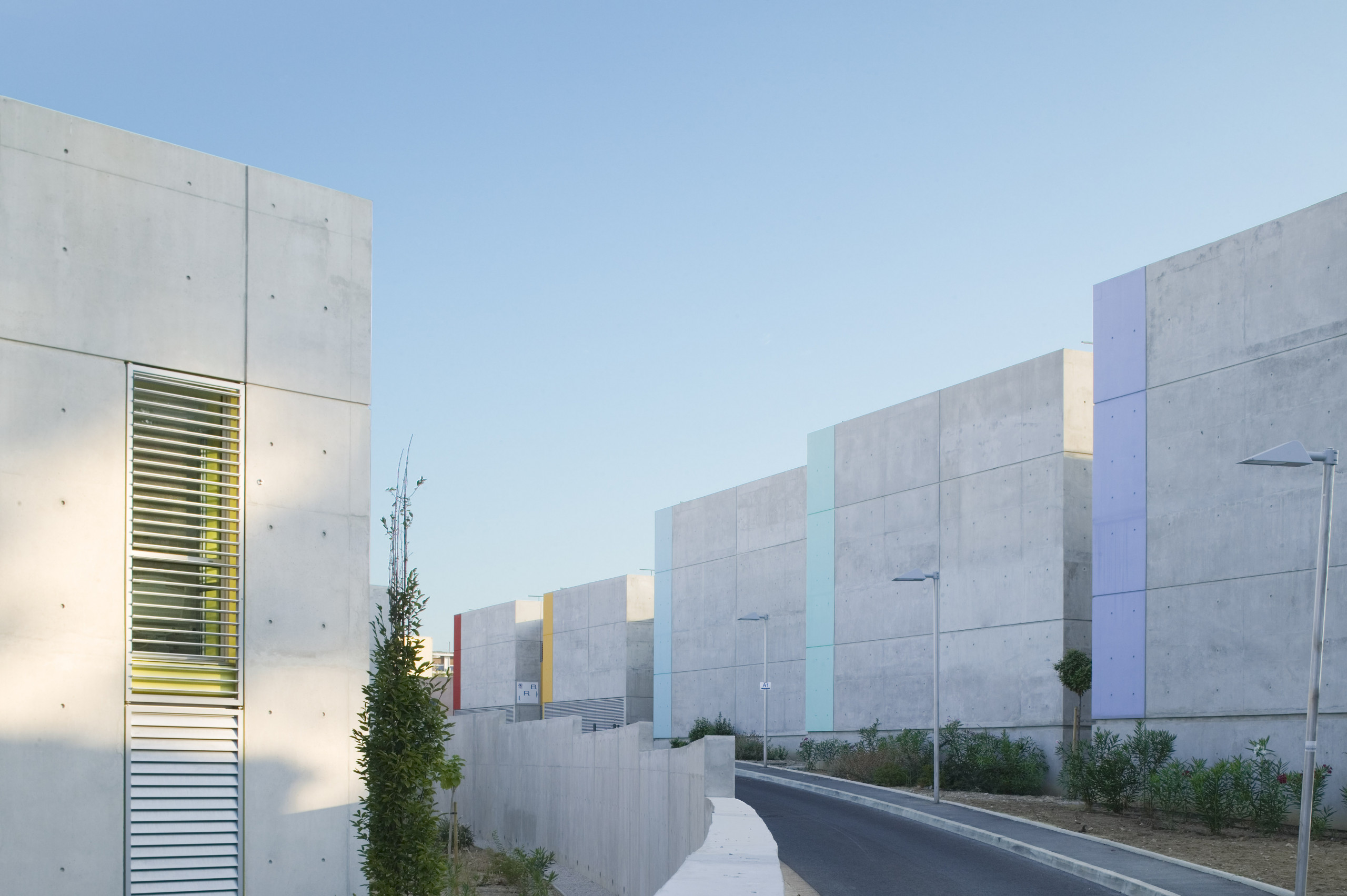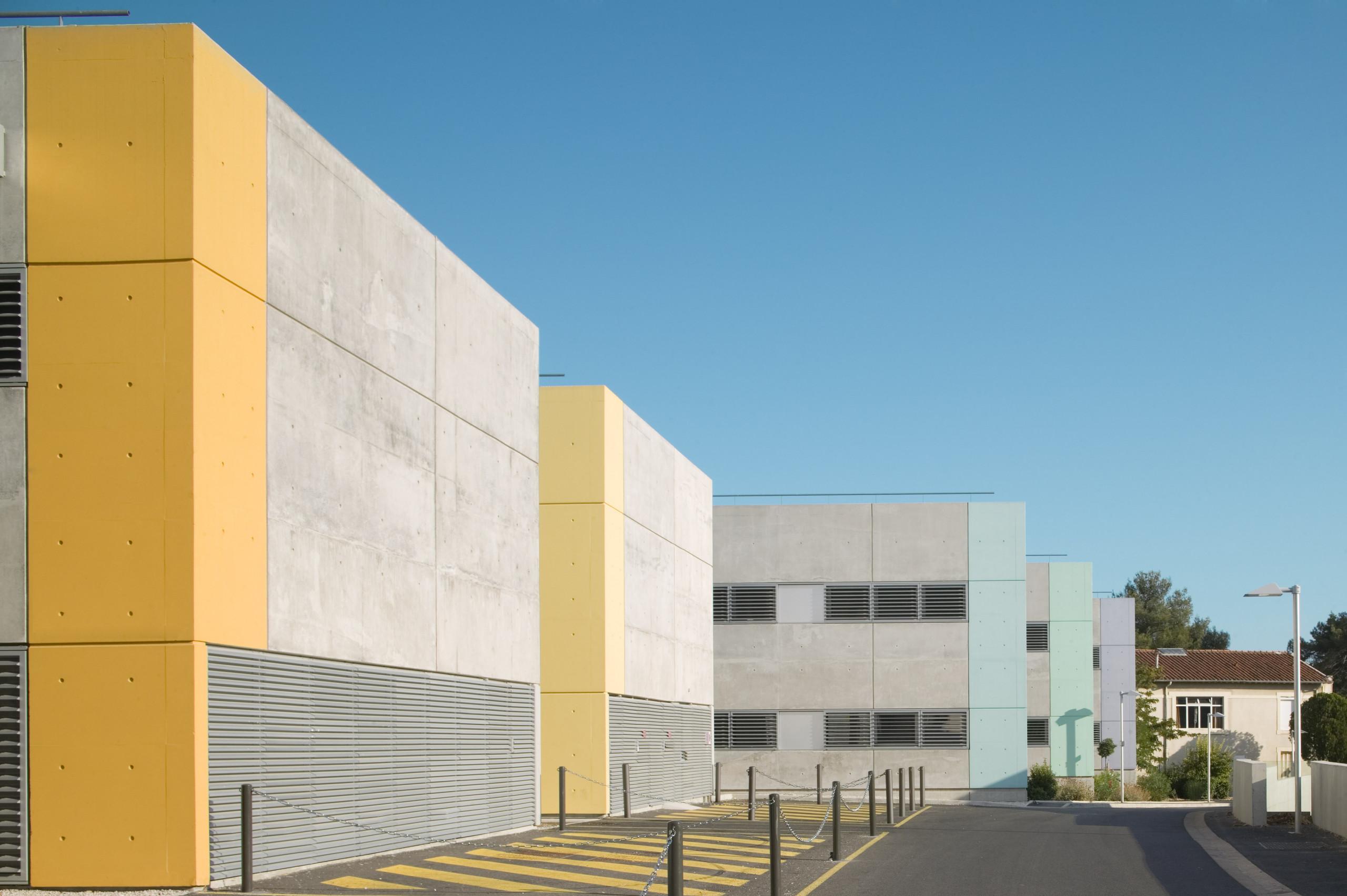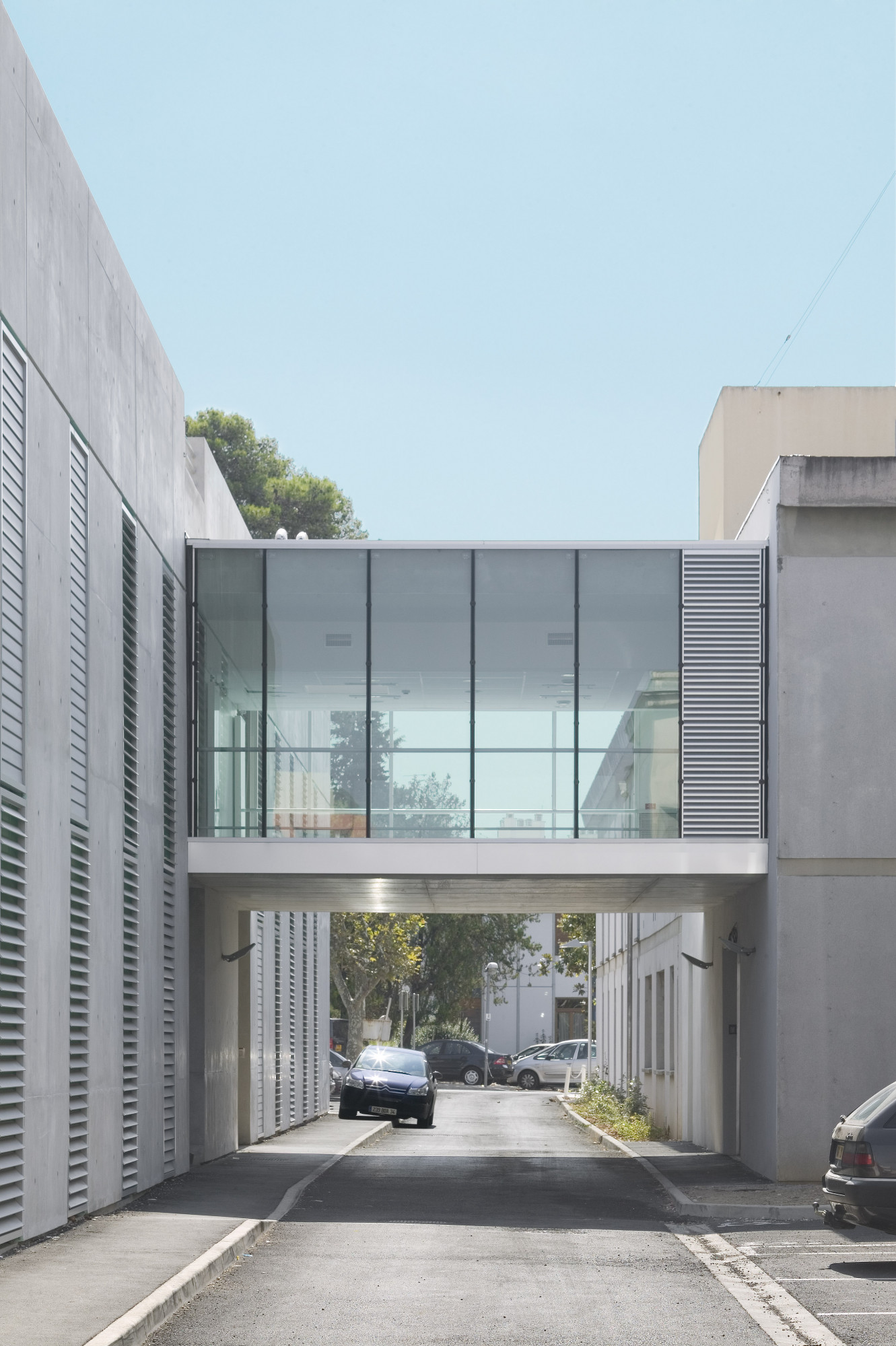 Ce dernier adopte une configuration en «peigne», formé de six «barrettes» parallèles implantées perpendiculairement à la courbe de la rue. Trois sous-ensembles indépendants y prennent place autour d’une plateforme commune: les laboratoires du CHU, de l’INSERM, et de sociétés privées. Les façades sont constituées d’une structure en béton architectonique avec isolation par l’intérieur. Les fenêtres filantes des laboratoires et des bureaux donnent sur des cours arborées. Le calepinage soigné du béton, laissé brut, ou peint ponctuellement de couleurs vives, et le rythme régulier des percements protégés par des brise-soleil extérieurs ou des ventelles confèrent à l’ensemble son unité et sa singularité.