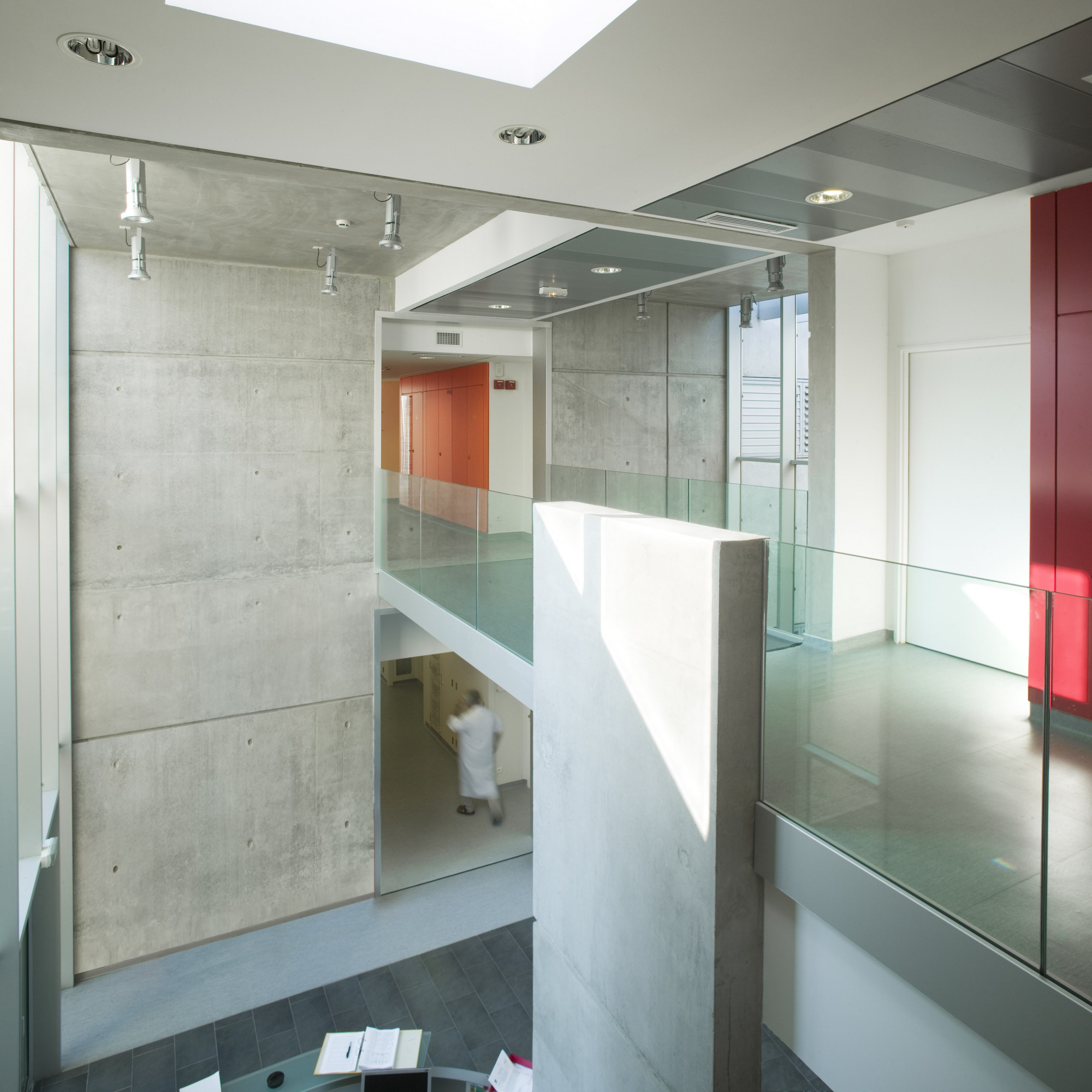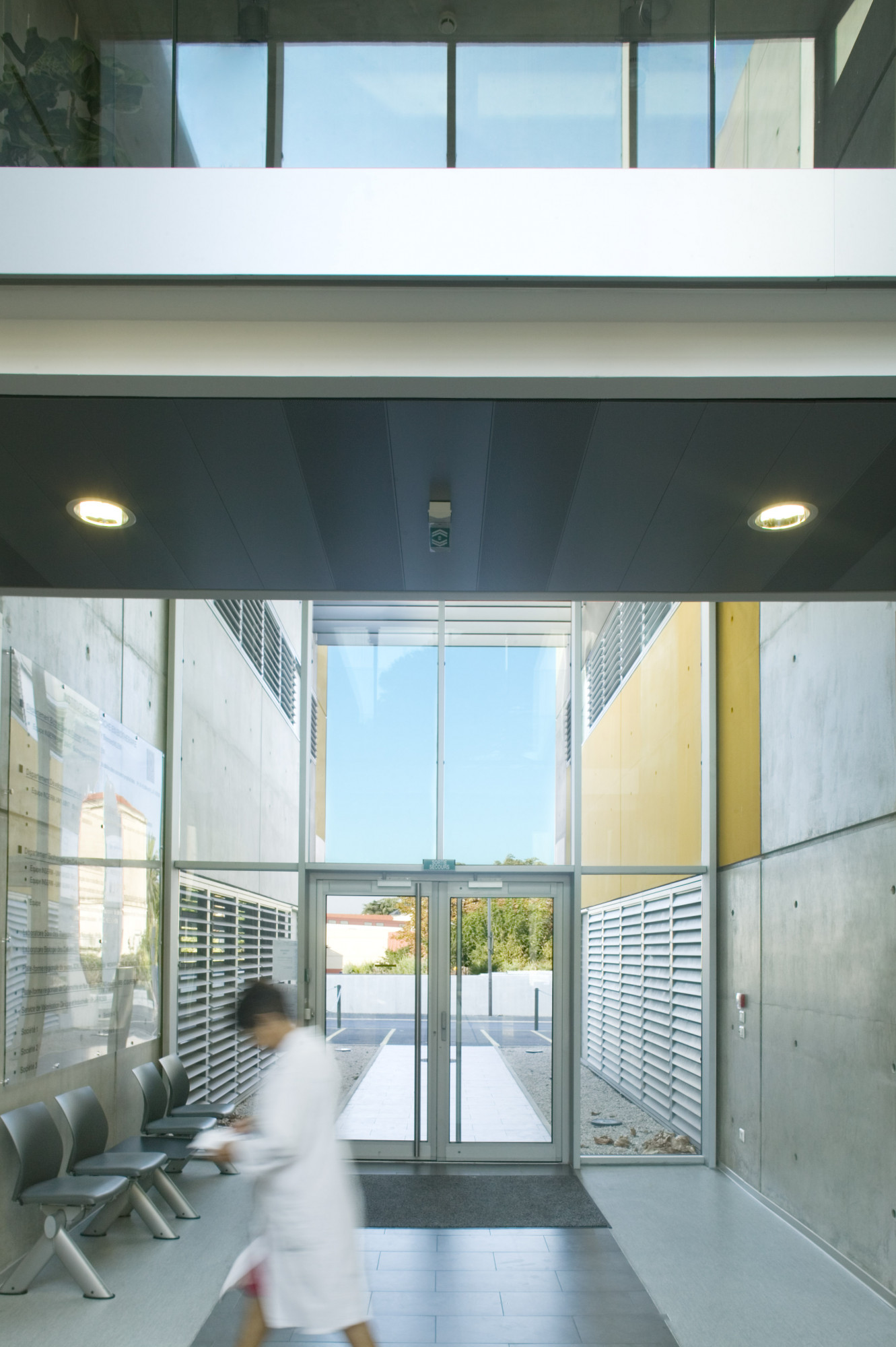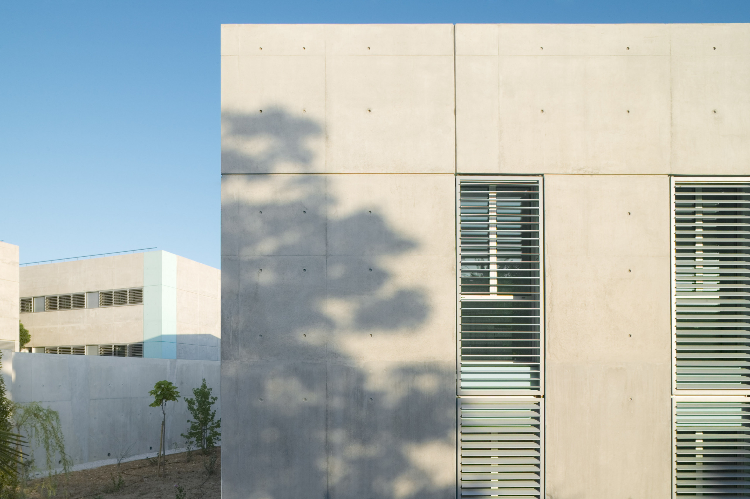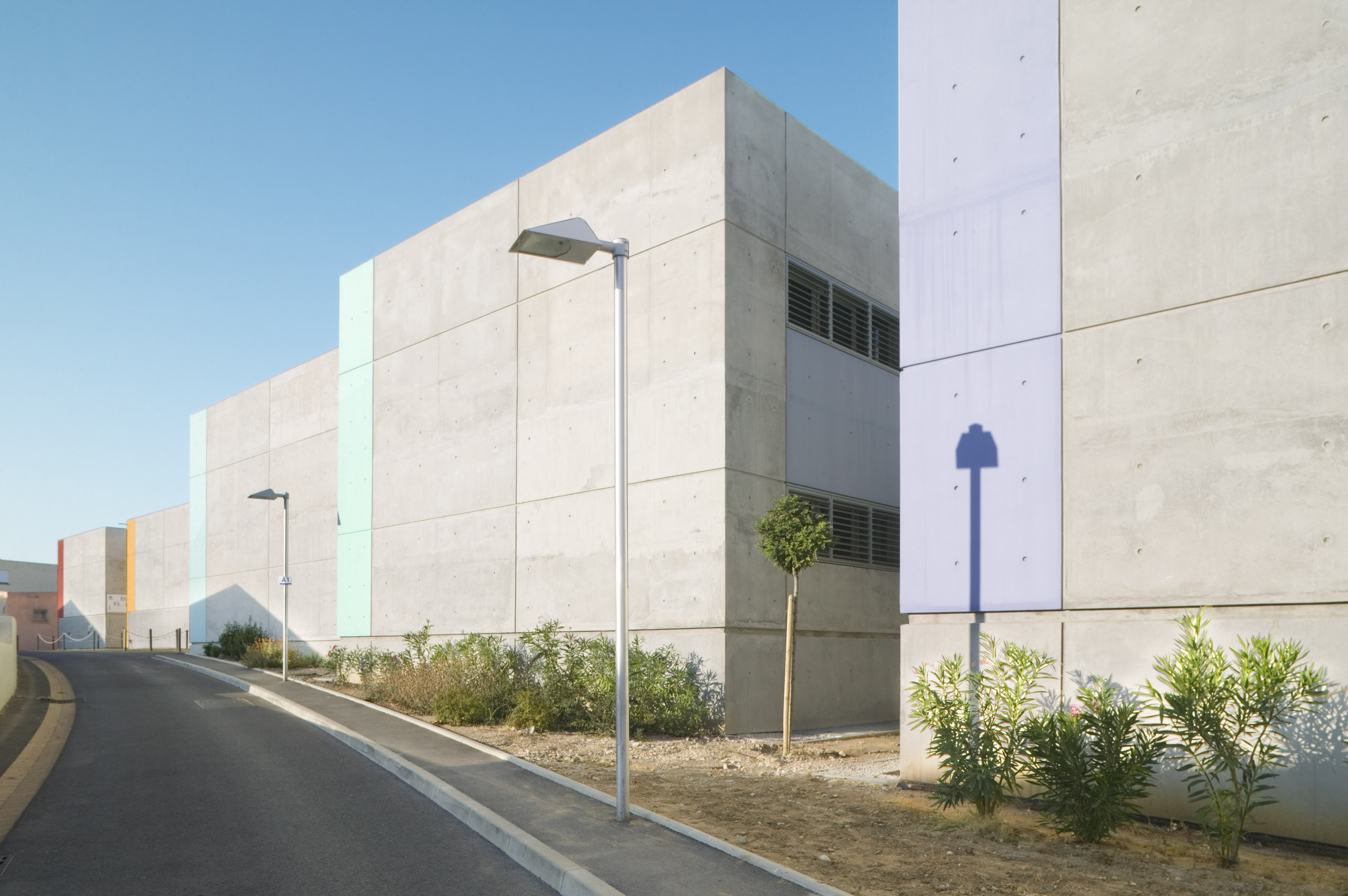 Ce dernier adopte une configuration en «peigne», formé de six «barrettes» parallèles implantées perpendiculairement à la courbe de la rue. Trois sous-ensembles indépendants y prennent place autour d’une plateforme commune: les laboratoires du CHU, de l’INSERM, et de sociétés privées. Les façades sont constituées d’une structure en béton architectonique avec isolation par l’intérieur. Les fenêtres filantes des laboratoires et des bureaux donnent sur des cours arborées. Le calepinage soigné du béton, laissé brut, ou peint ponctuellement de couleurs vives, et le rythme régulier des percements protégés par des brise-soleil extérieurs ou des ventelles confèrent à l’ensemble son unité et sa singularité.