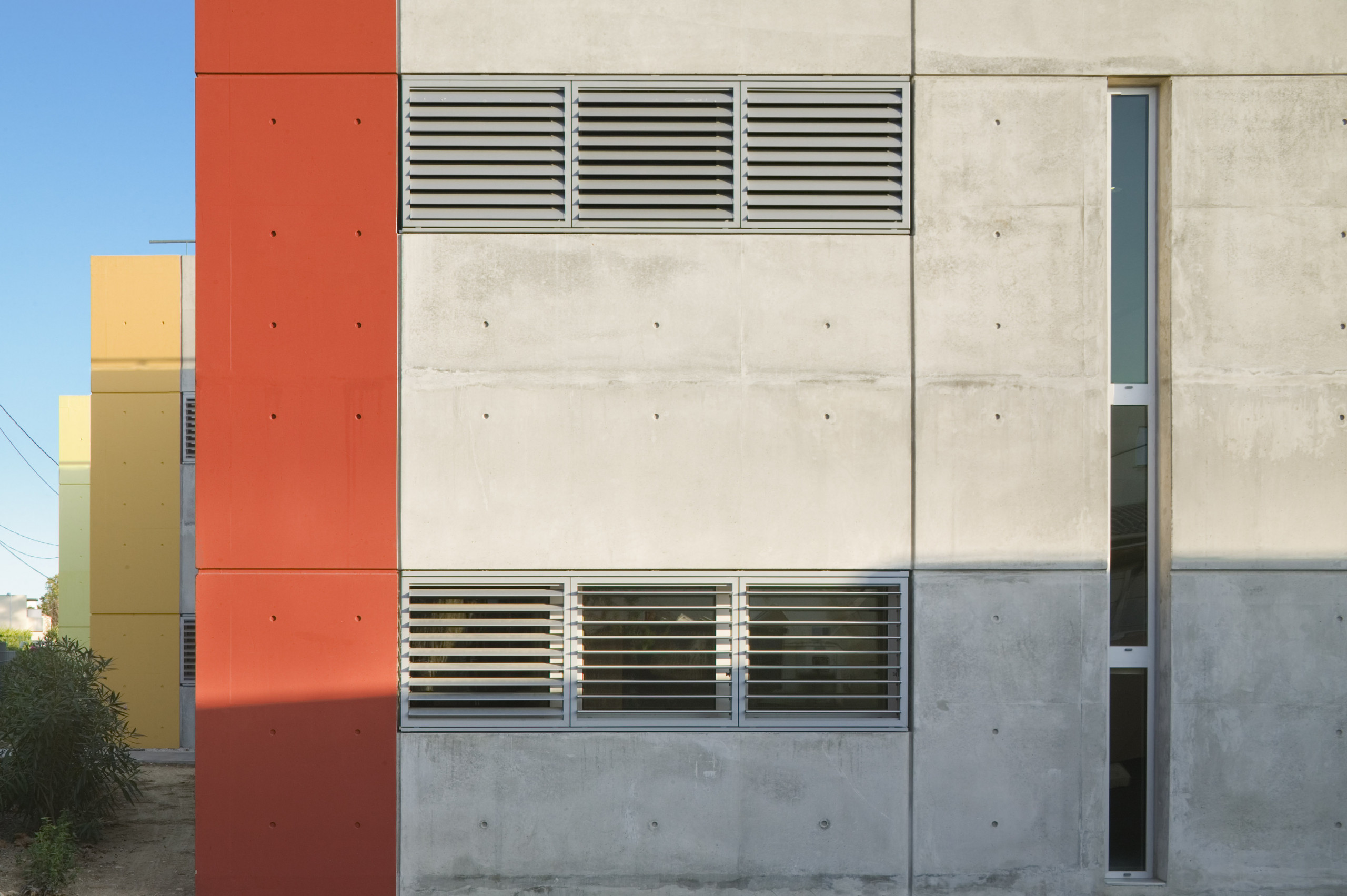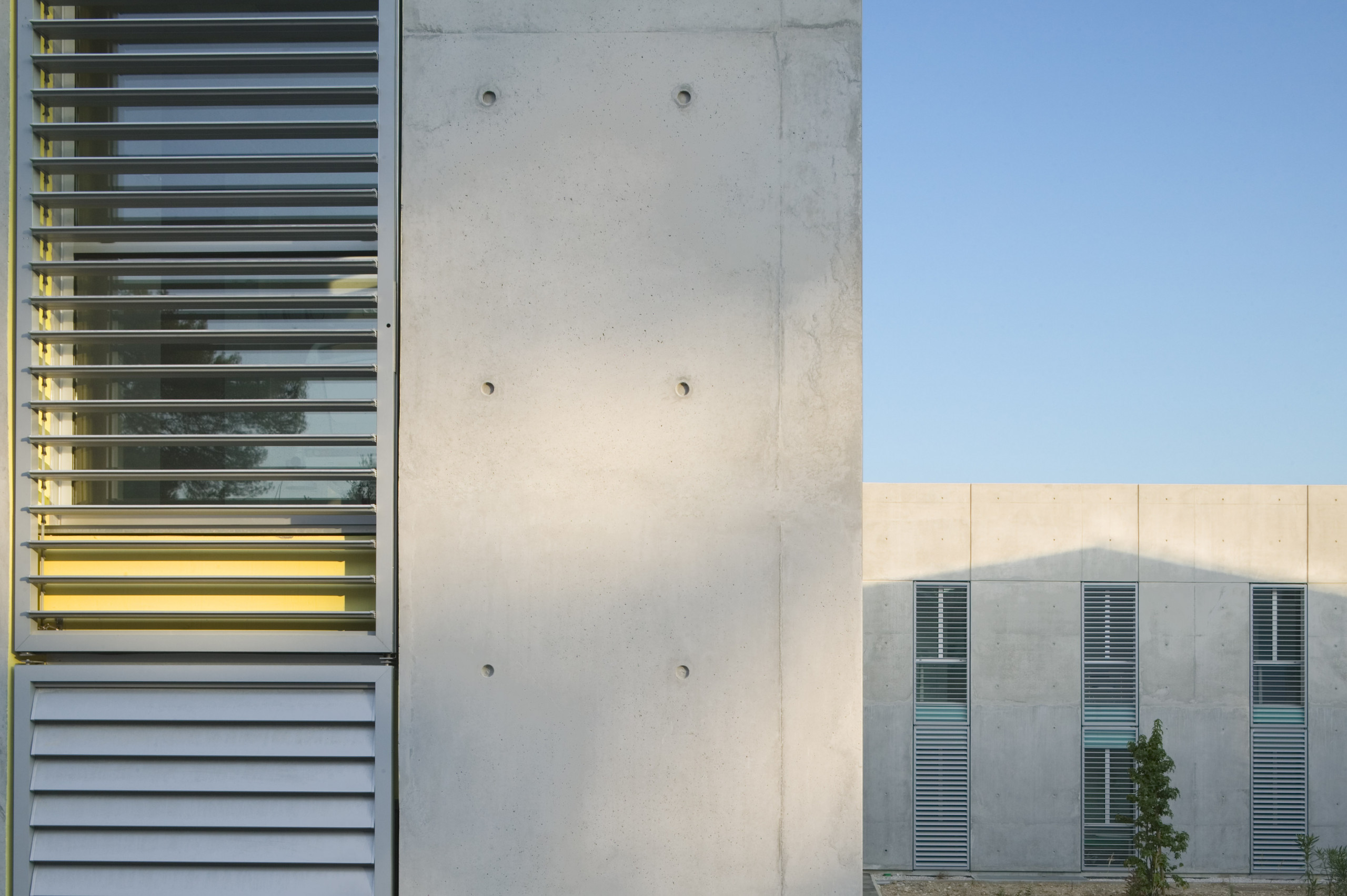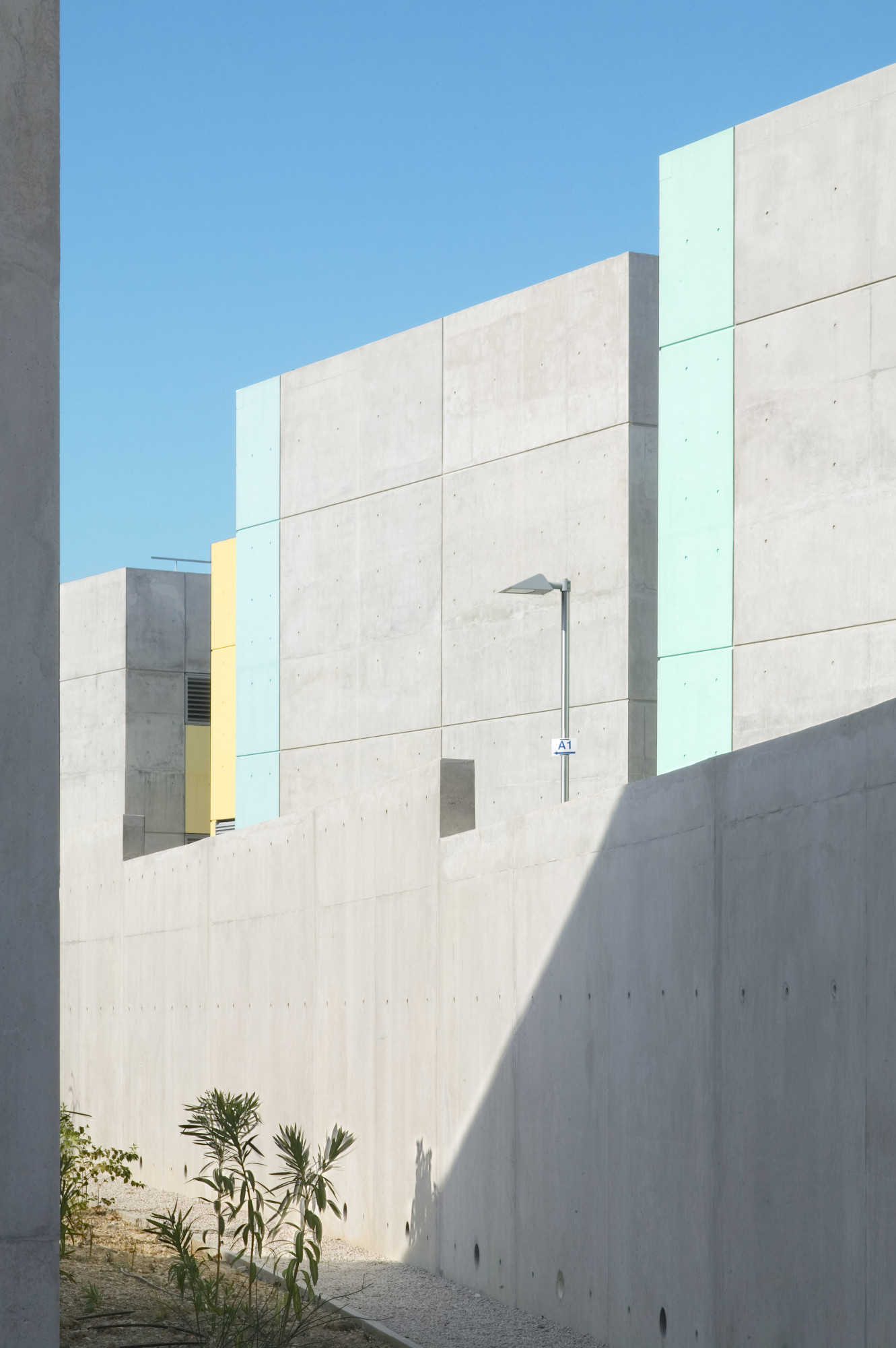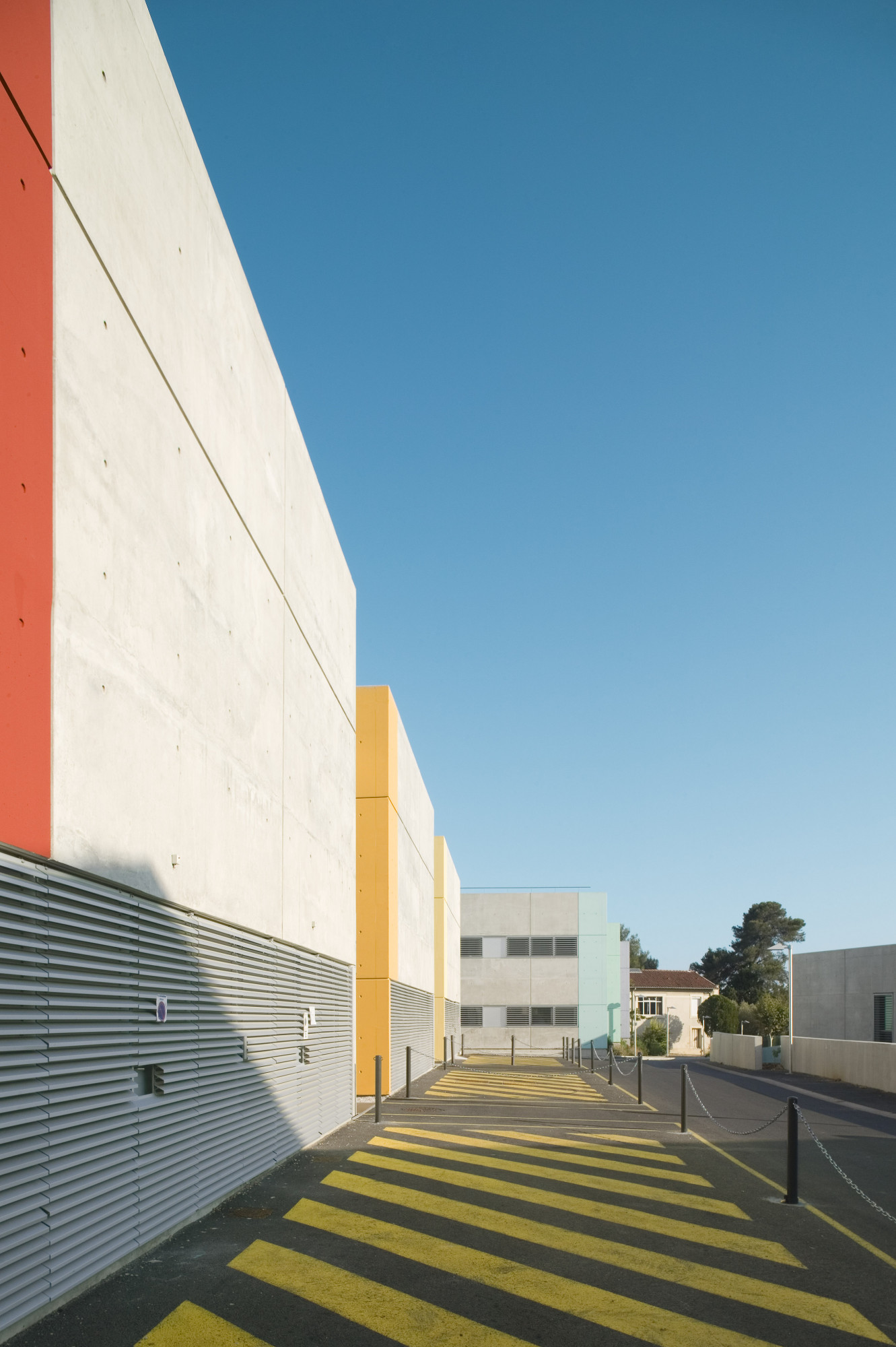 Ce dernier adopte une configuration en «peigne», formé de six «barrettes» parallèles implantées perpendiculairement à la courbe de la rue. Trois sous-ensembles indépendants y prennent place autour d’une plateforme commune: les laboratoires du CHU, de l’INSERM, et de sociétés privées. Les façades sont constituées d’une structure en béton architectonique avec isolation par l’intérieur. Les fenêtres filantes des laboratoires et des bureaux donnent sur des cours arborées. Le calepinage soigné du béton, laissé brut, ou peint ponctuellement de couleurs vives, et le rythme régulier des percements protégés par des brise-soleil extérieurs ou des ventelles confèrent à l’ensemble son unité et sa singularité.